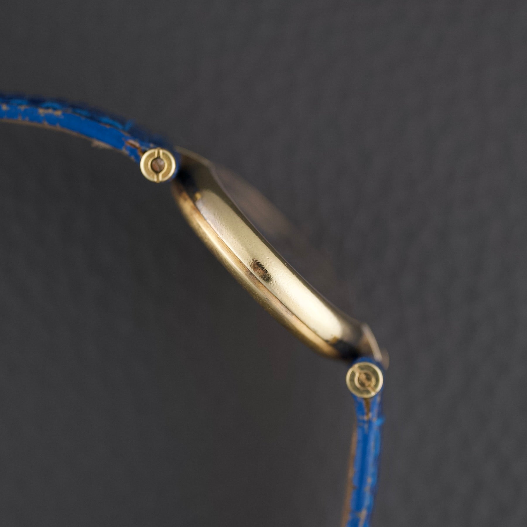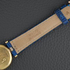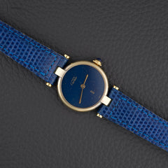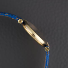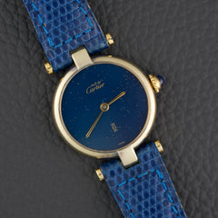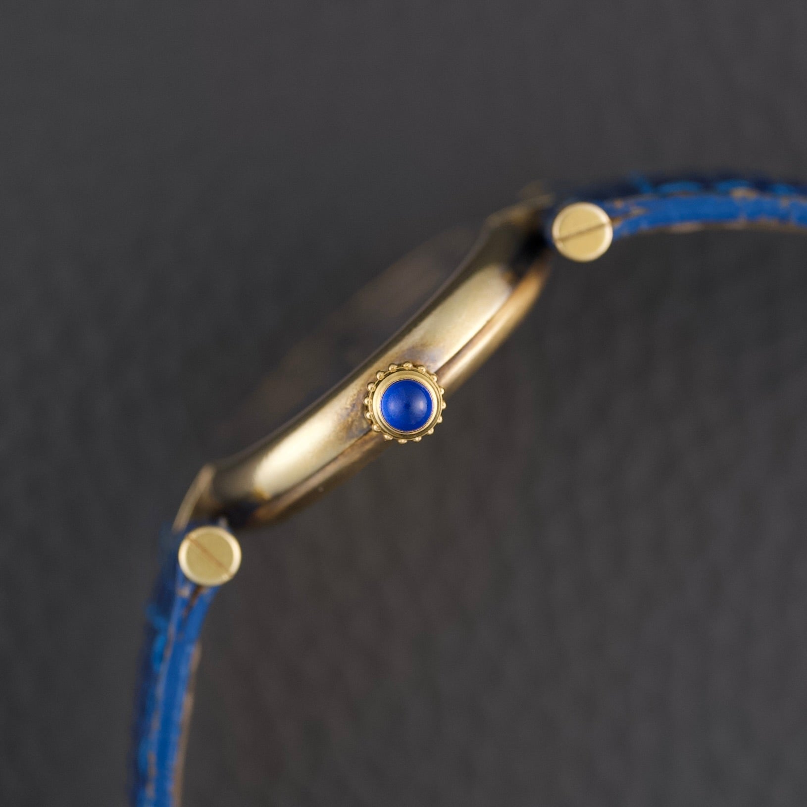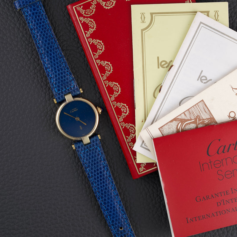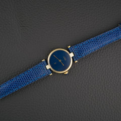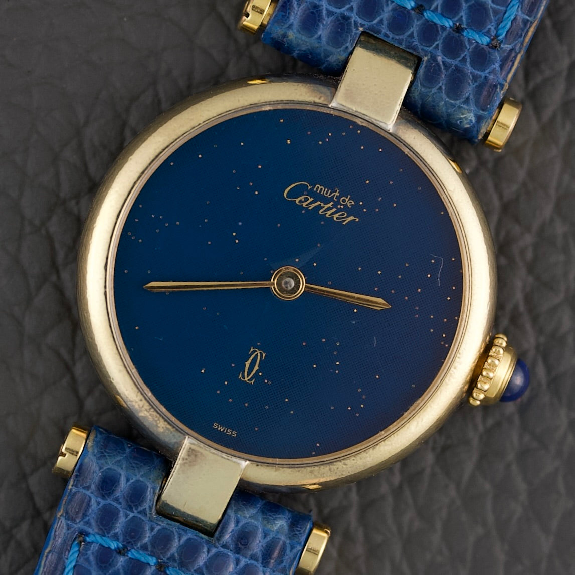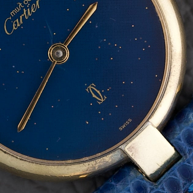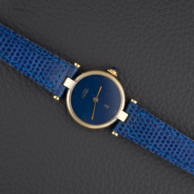 Die Vendômes gehören zu den diskretesten Cartiers und hier haben wir ein besonders seltenes Exemplar mit einem blauen „Sternenstaub“-Zifferblatt: strukturiert mit goldenen Flecken, die an Sternenstaub erinnern.