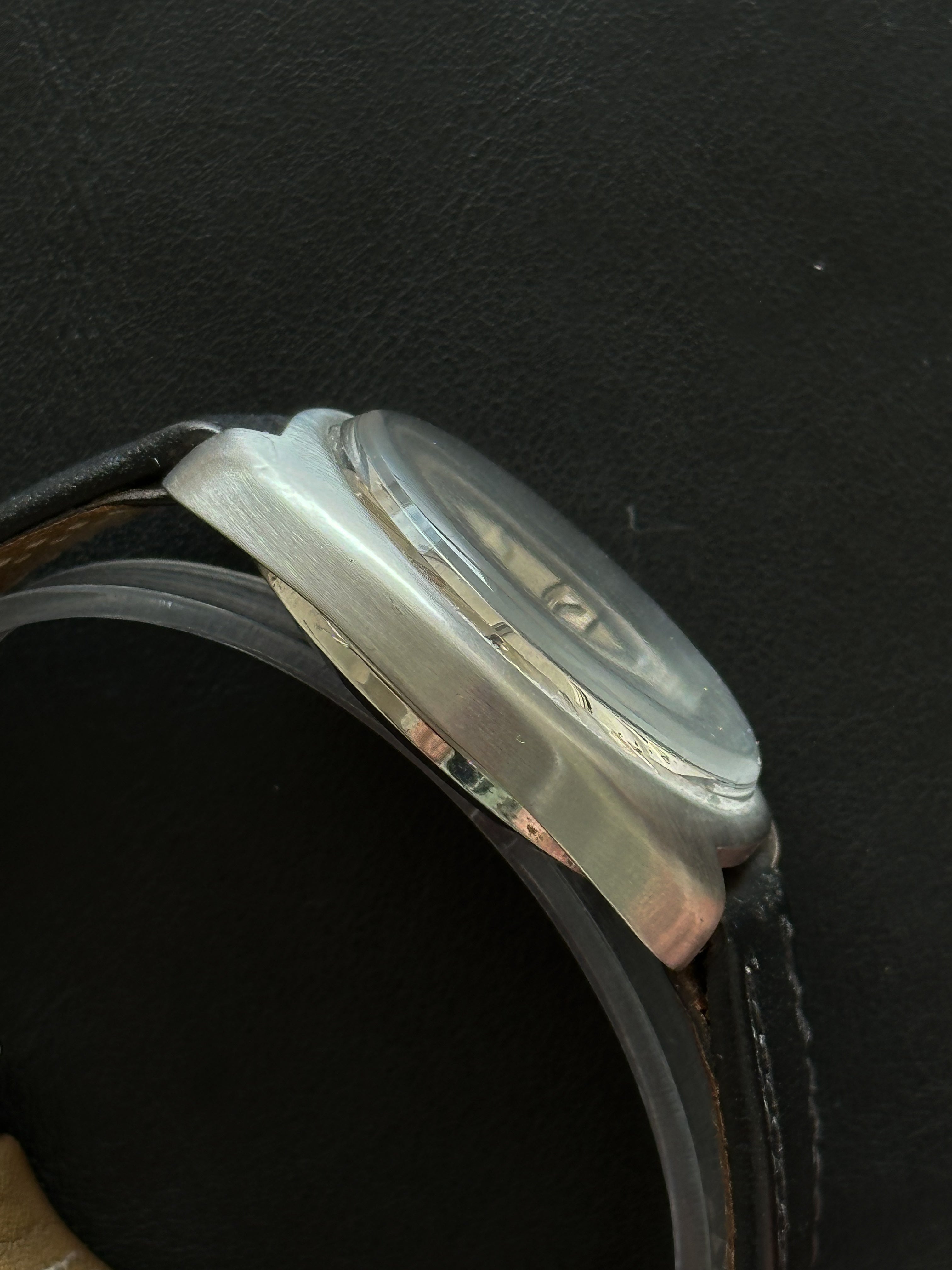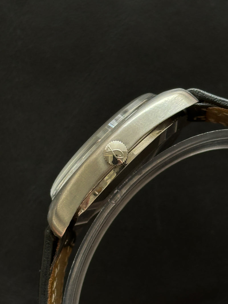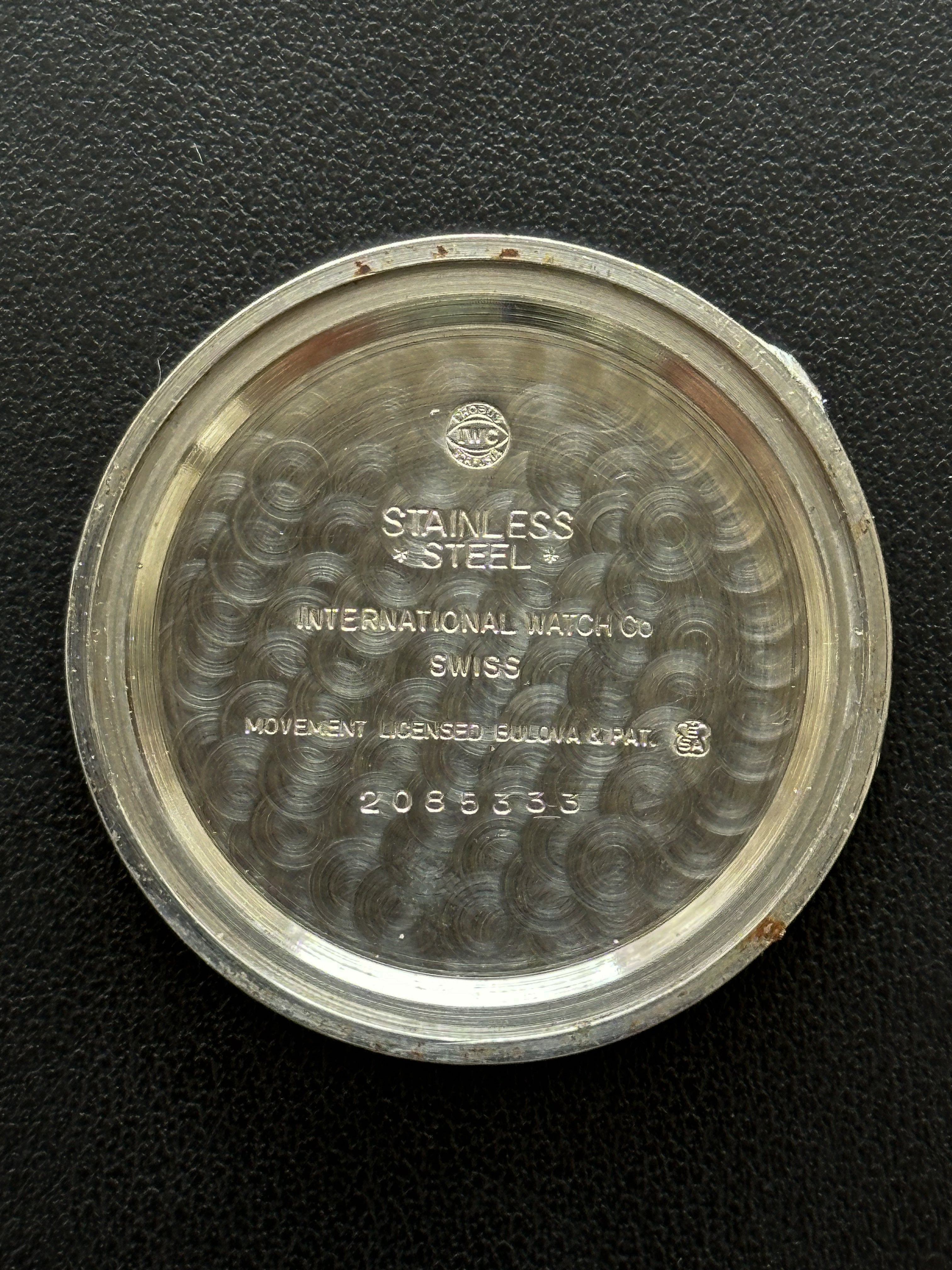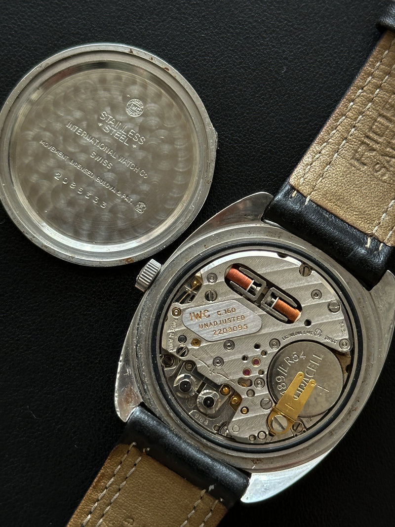 Das C-förmige Gehäuse ist gut verarbeitet und insgesamt in einem sehr guten Zustand. Das originale, unrestaurierte Zifferblatt ist in ausgezeichnetem Zustand, ebenso wie die geraden, originalen Zeiger. Die mit dem IWC-Fischsymbol verzierte Krone erinnert an Modelle mit Wasserdichtigkeit (heute nicht garantiert).