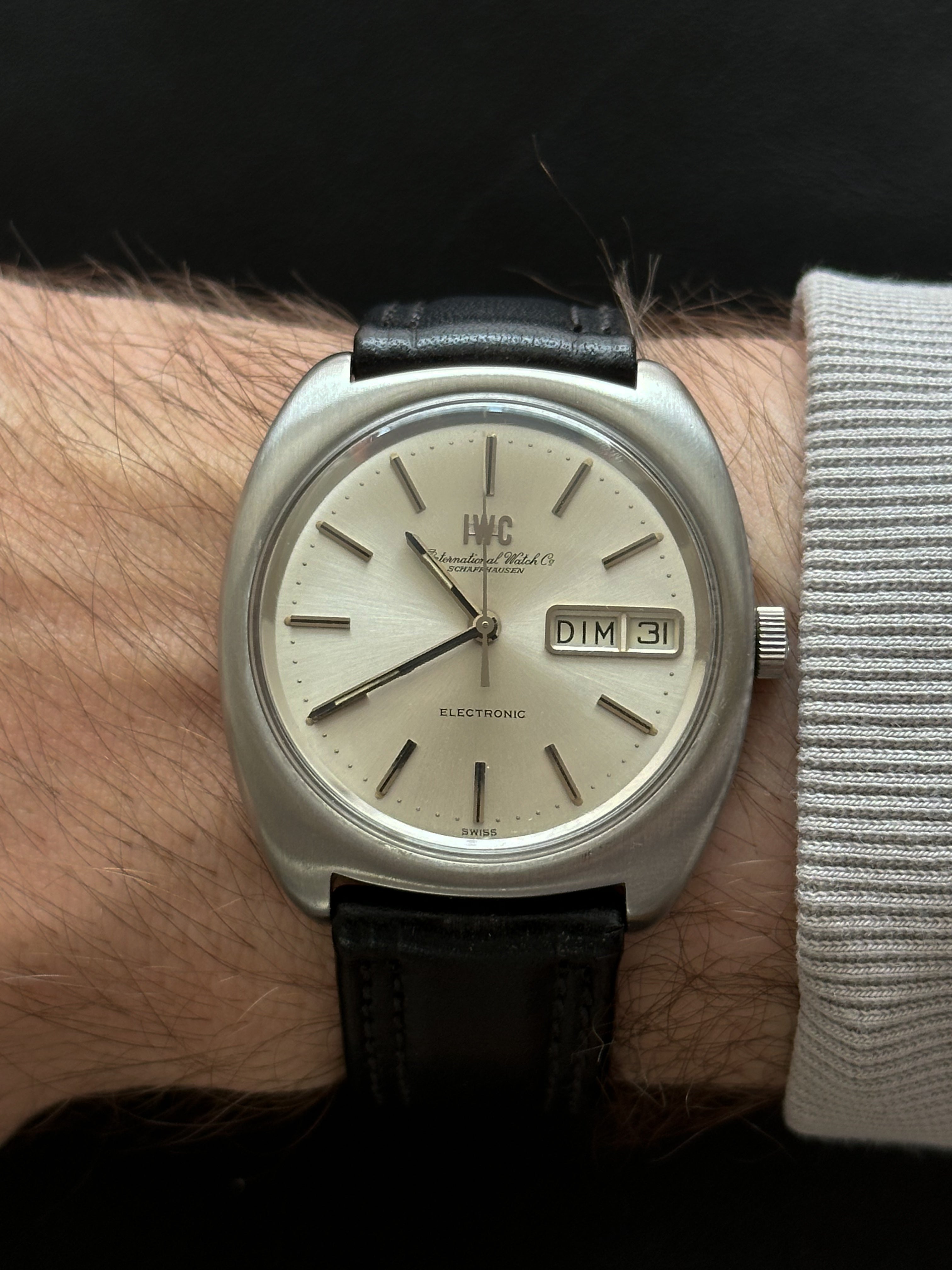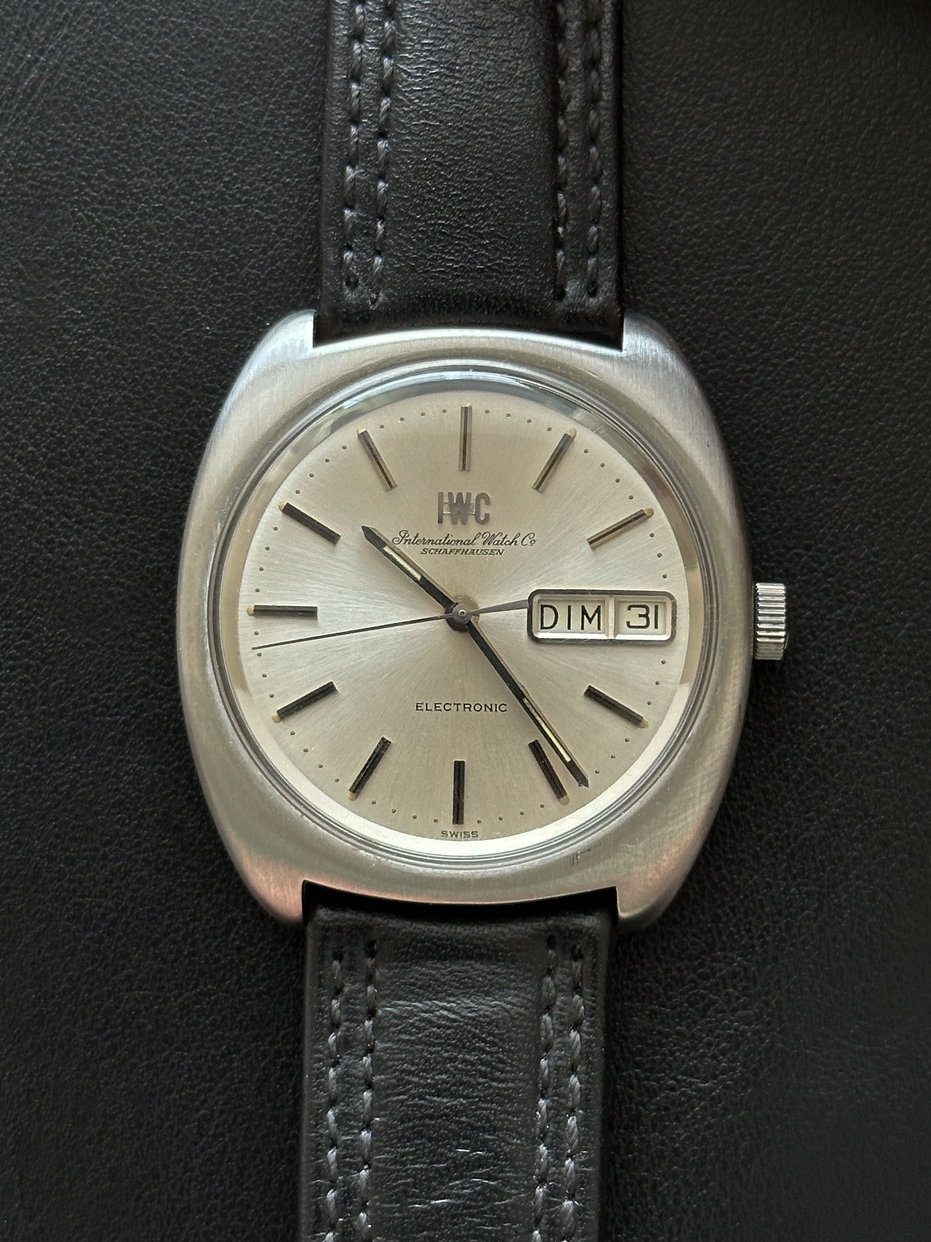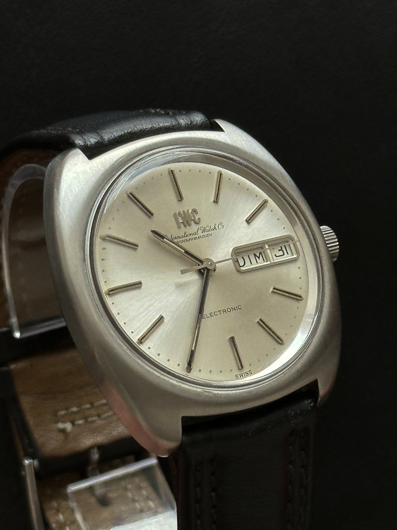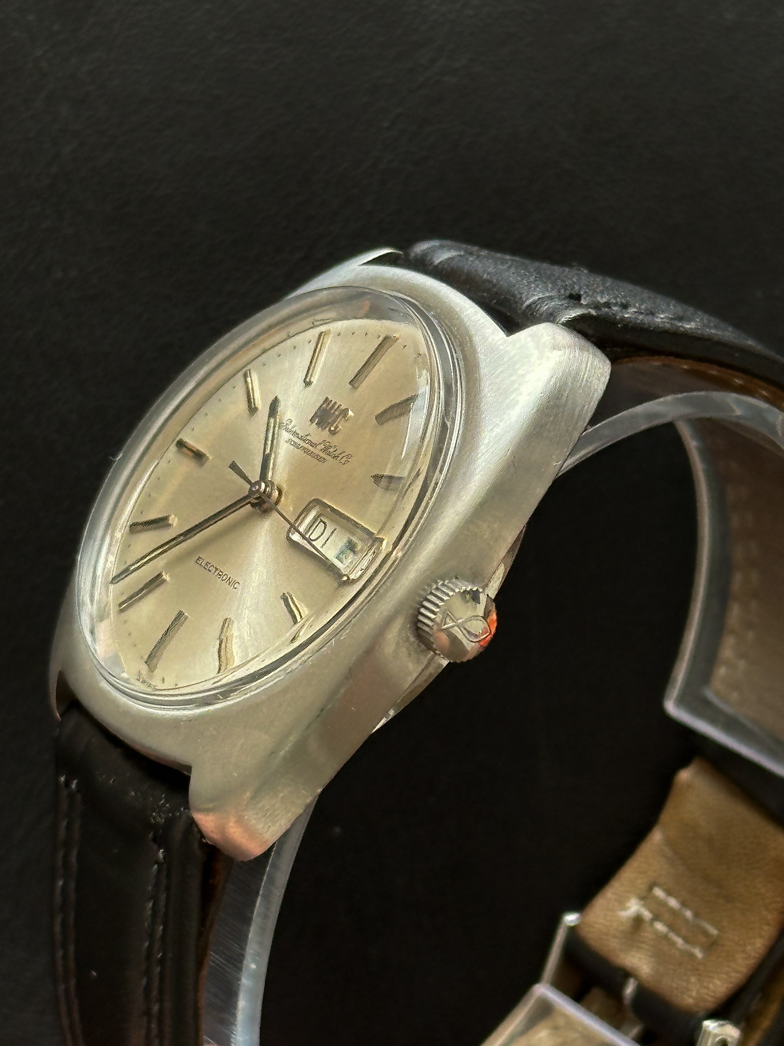 Entdecken Sie diese elegante elektronische IWC-Uhr, Referenz 3602, ausgestattet mit einem elektronischen Stimmgabelwerk (Quarz).