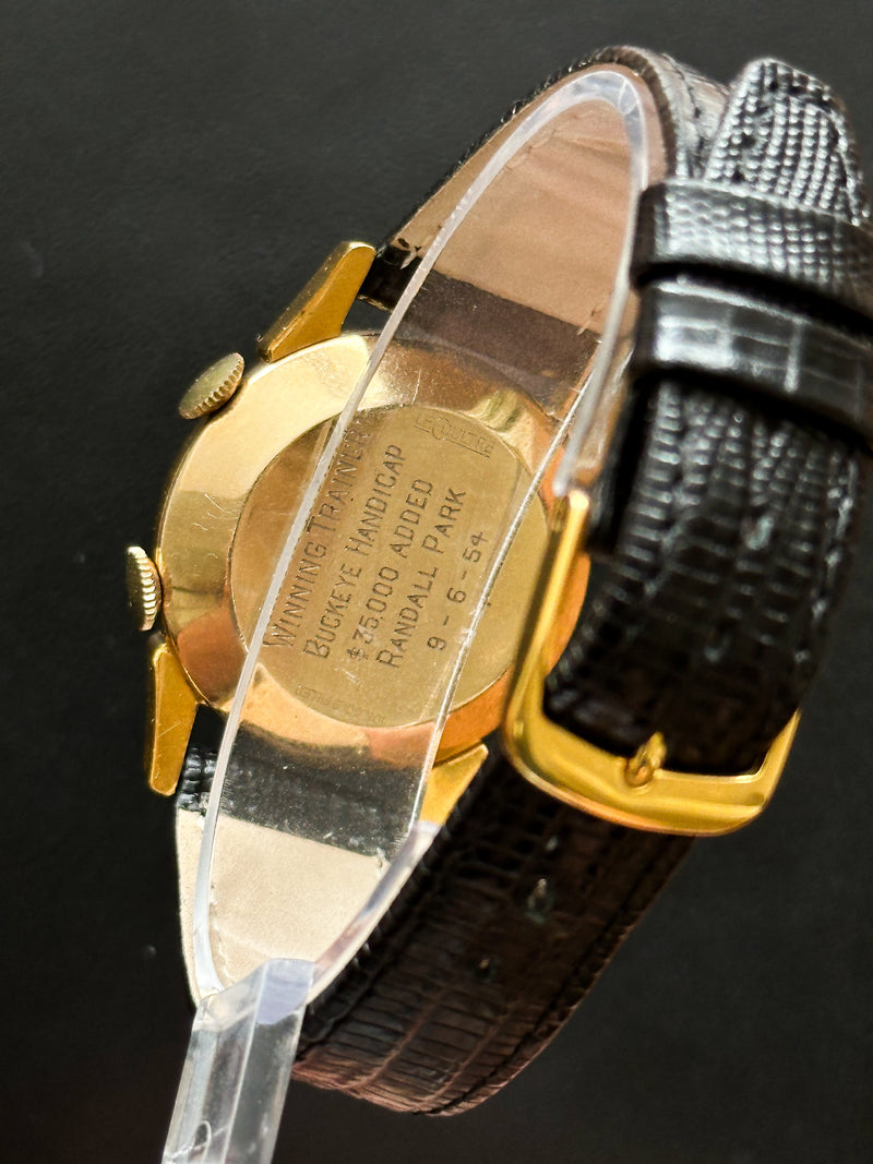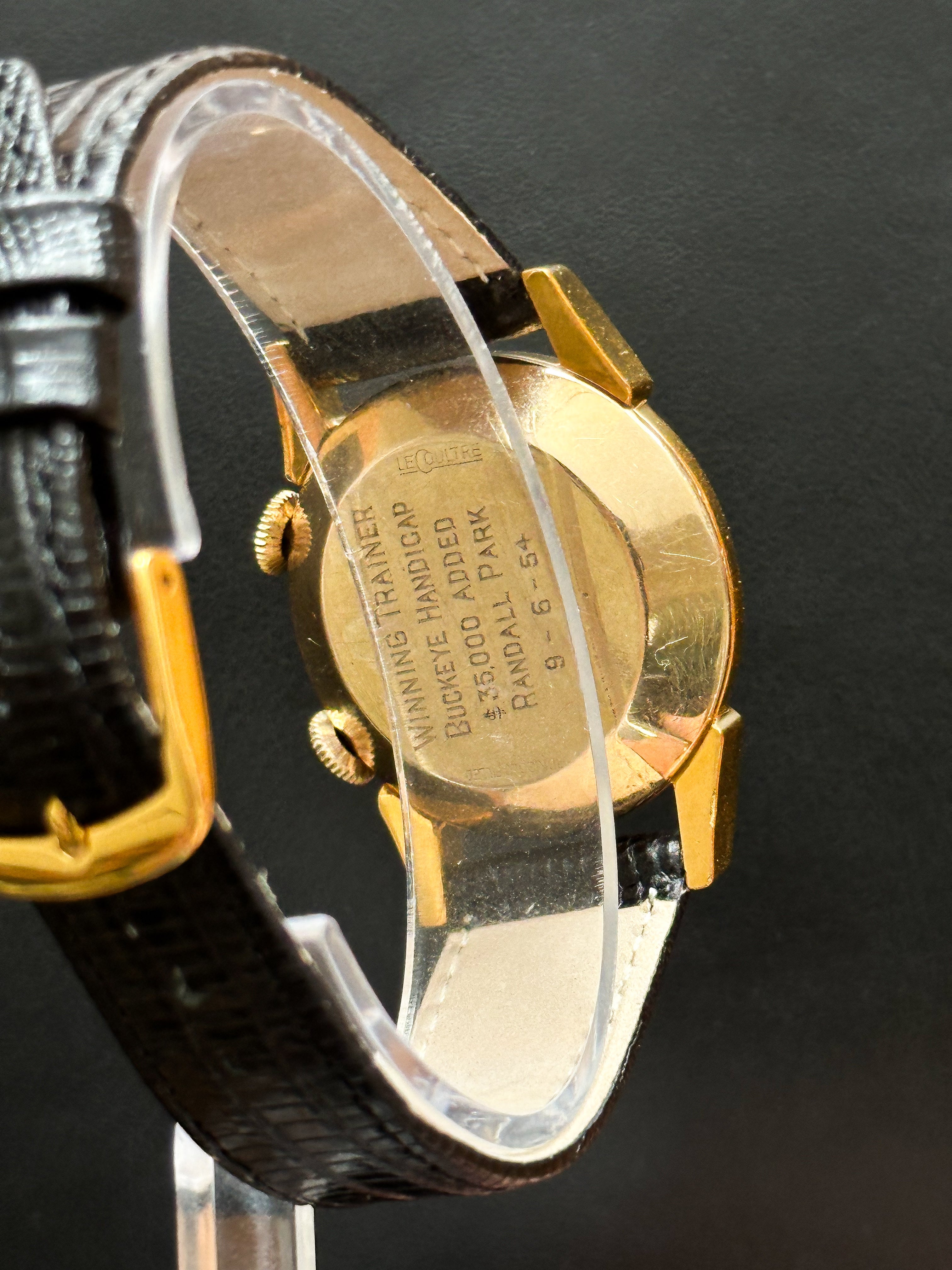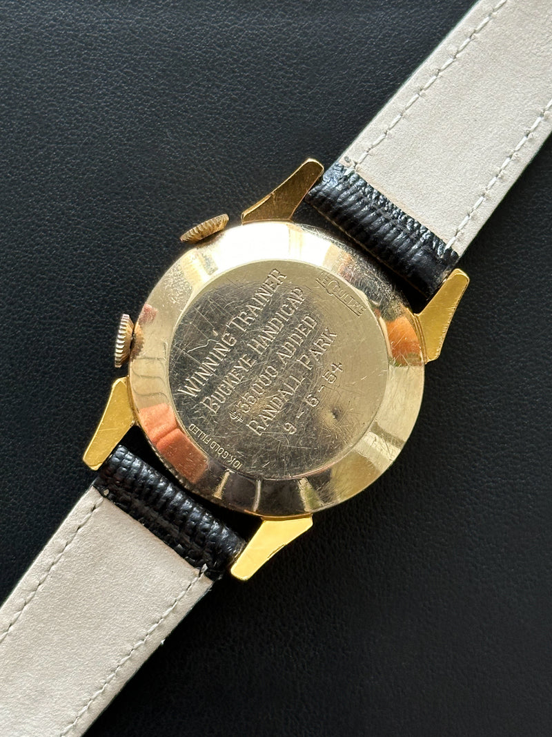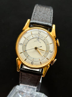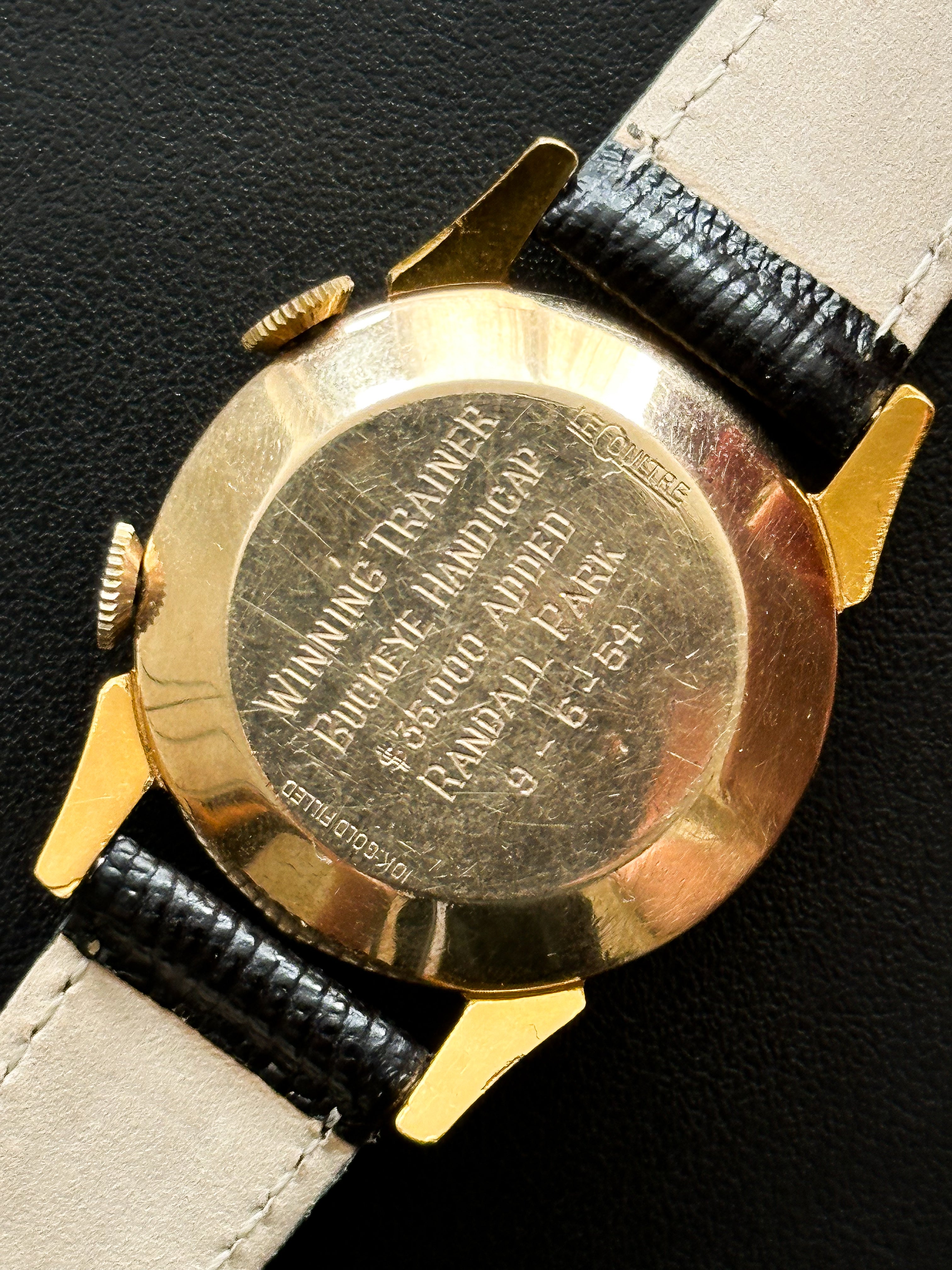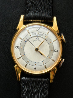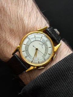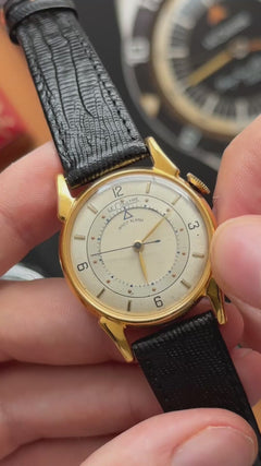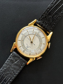 Sehr schöne und einzigartige Jaeger-LeCoultre Memovox aus dem Jahr 1954. Dies ist ein komplett aus 10 Karat Gold gefertigtes „Gold Filed“-Modell. Die Geschichte der Memovox reicht bis ins Jahr 1951 zurück, als JLC unter diesem Namen die erste Alarmarmbanduhr auf den Markt brachte. Dieses stammt aus dem Jahr 1954 und wurde auf der Rückseite der Box eingraviert (als Belohnung für einen Wettbewerb in den USA).