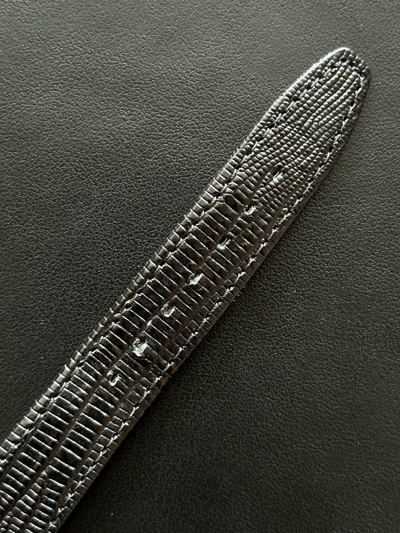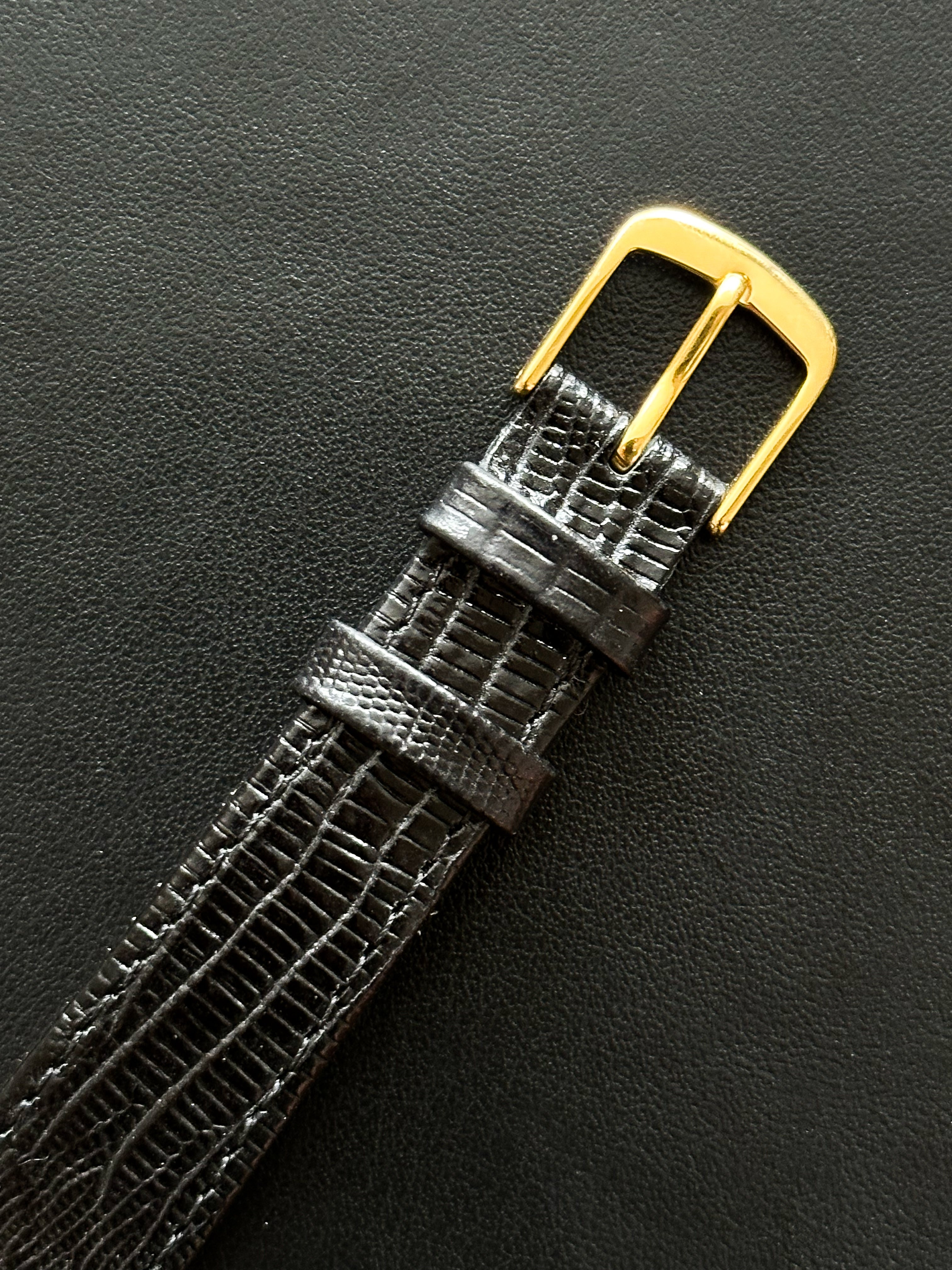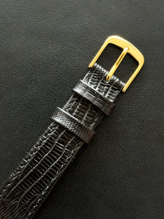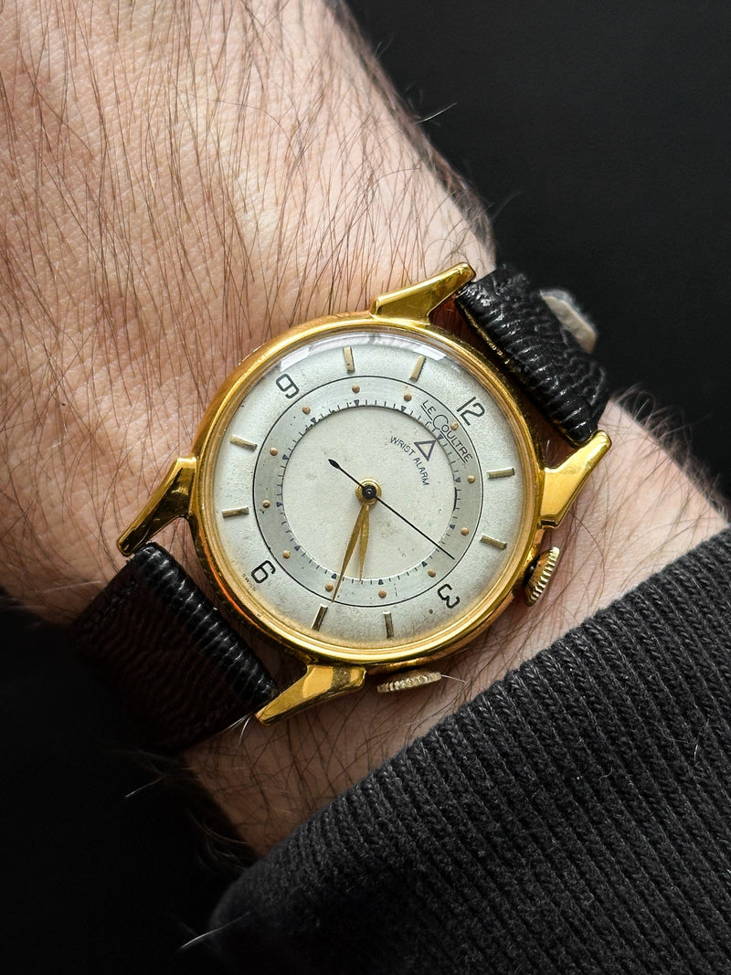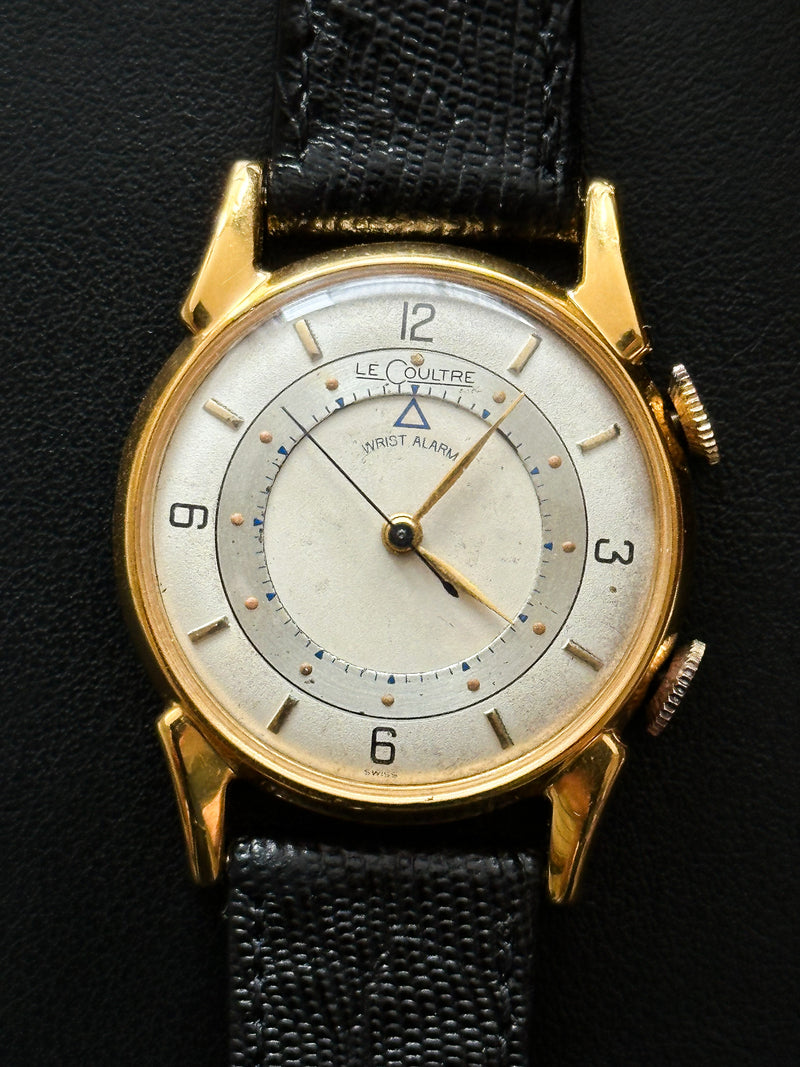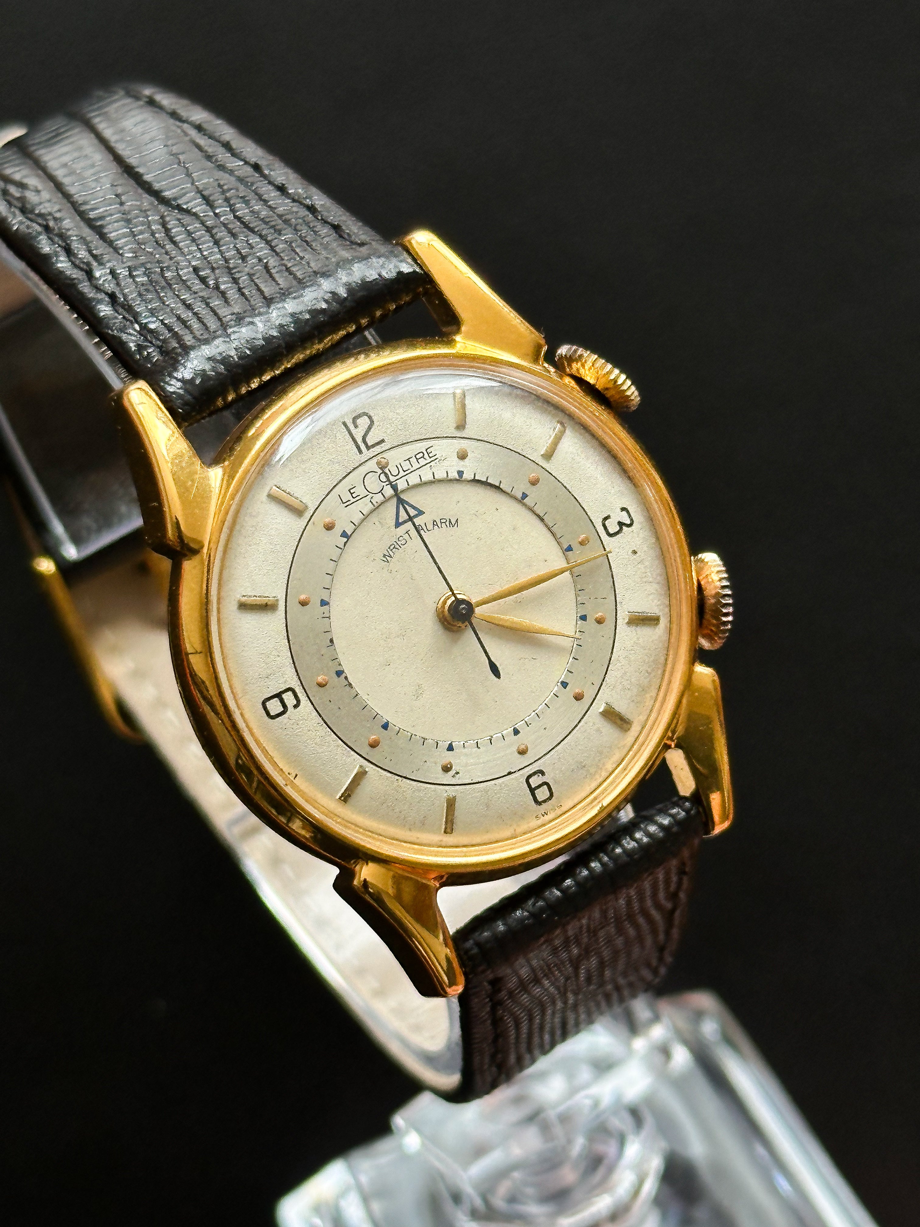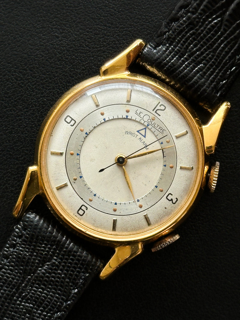 Dieses Modell ist 33 mm groß und wird vom Kaliber JLC E825 angetrieben, einem mechanischen „Bumper“-Uhrwerk mit Handaufzug. Alle Zeiger sind funktionstüchtig und das Kaliber funktioniert wie es soll. Keine sichtbaren Kratzer auf dem Glas. Leichte Patina auf dem Zifferblatt, es ist für sein Alter sehr gut erhalten. Das Zifferblatt ist mit blauen Zeigern versehen. Diese Uhr wird mit ersetzten Kronen und einem klassischen schwarzen Lederarmband geliefert.