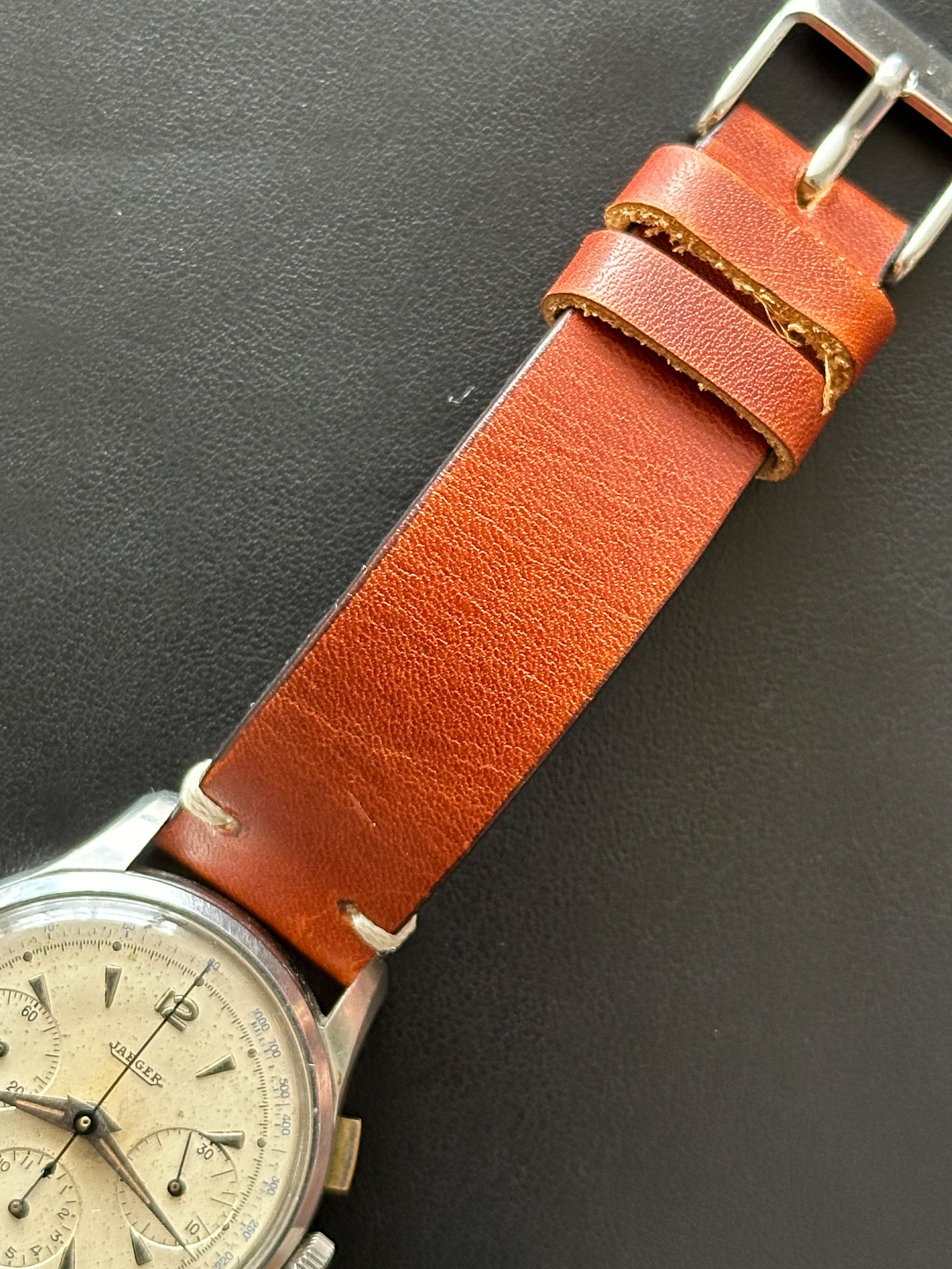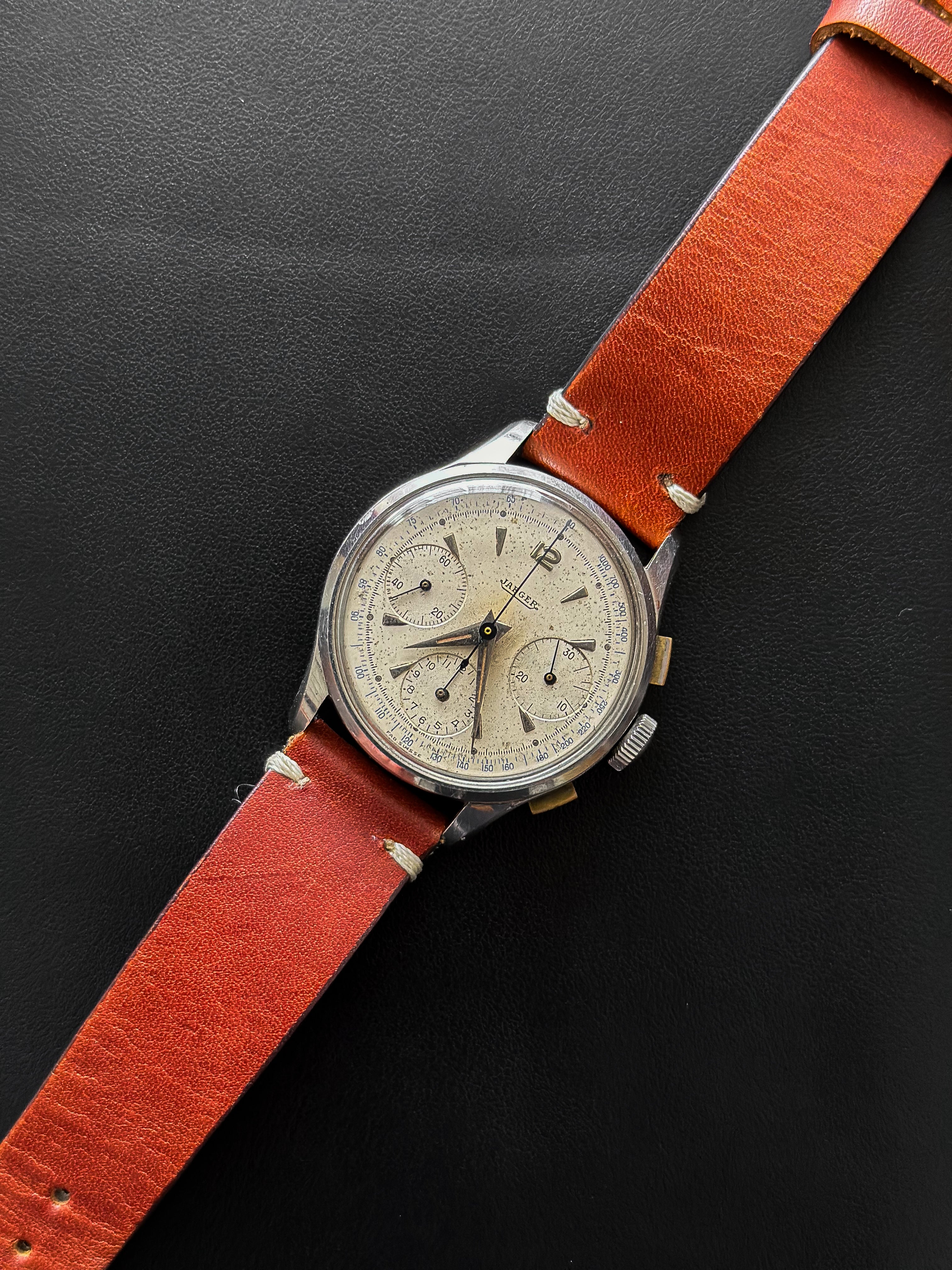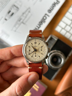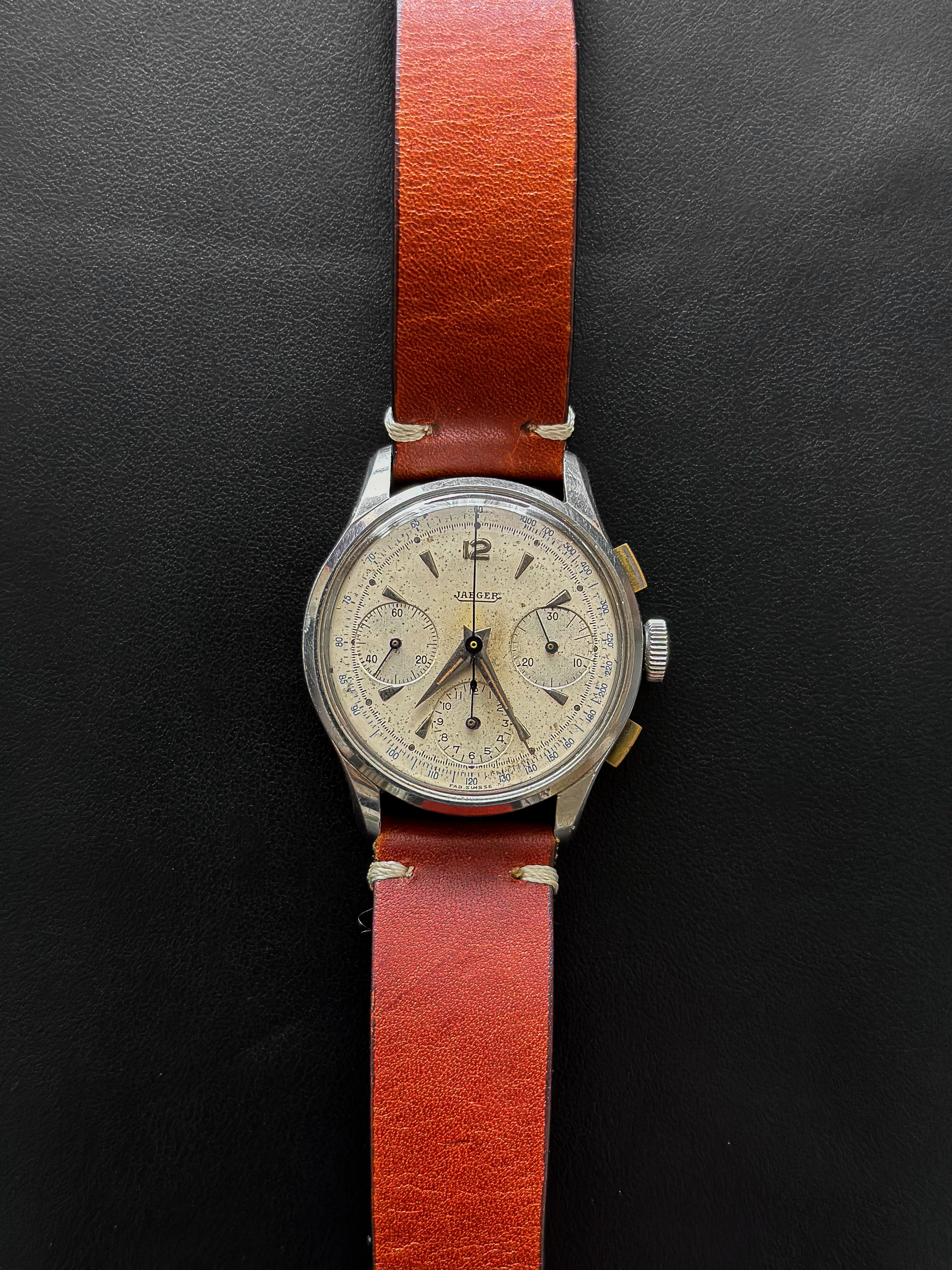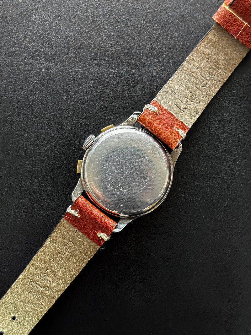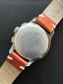 Dieser Chronograph funktioniert perfekt, ebenso wie seine 3 Hilfszifferblätter. Dieses Exemplar wurde sein ganzes Leben lang getragen, ist aber angesichts seines Alters immer noch in einem sehr guten Zustand. Das Gehäuse weist leichte Gebrauchsspuren auf (ungeschliffen), um seine Authentizität weitestgehend zu wahren. Auch das Glas ist in einem sehr guten Zustand. Dieses Stück hat das Originalzifferblatt, die Originalzeiger, die Krone und den Gehäuseboden. Es wird mit einem generischen terrakottafarbenen Lederarmband geliefert, das fast neu ist.