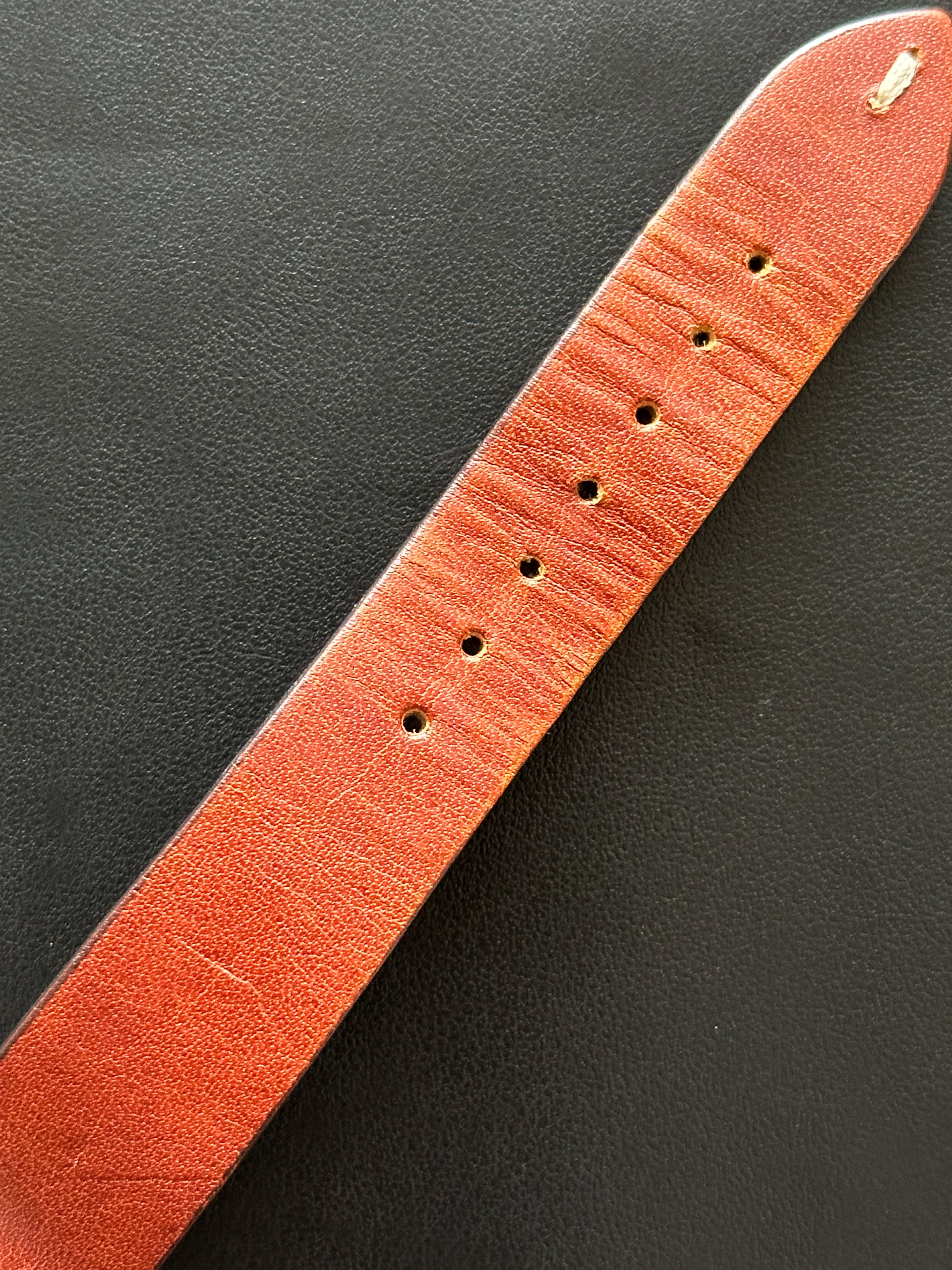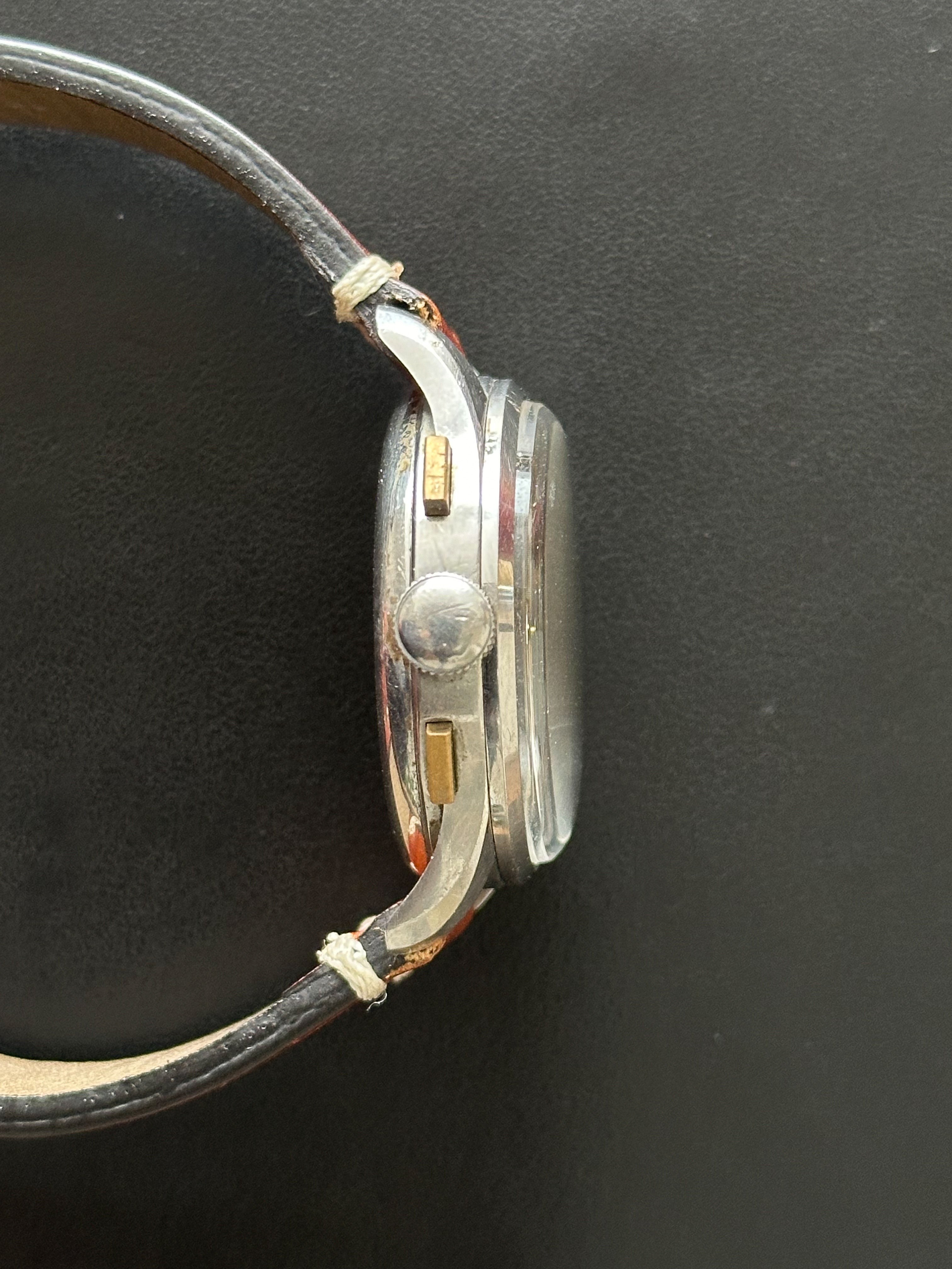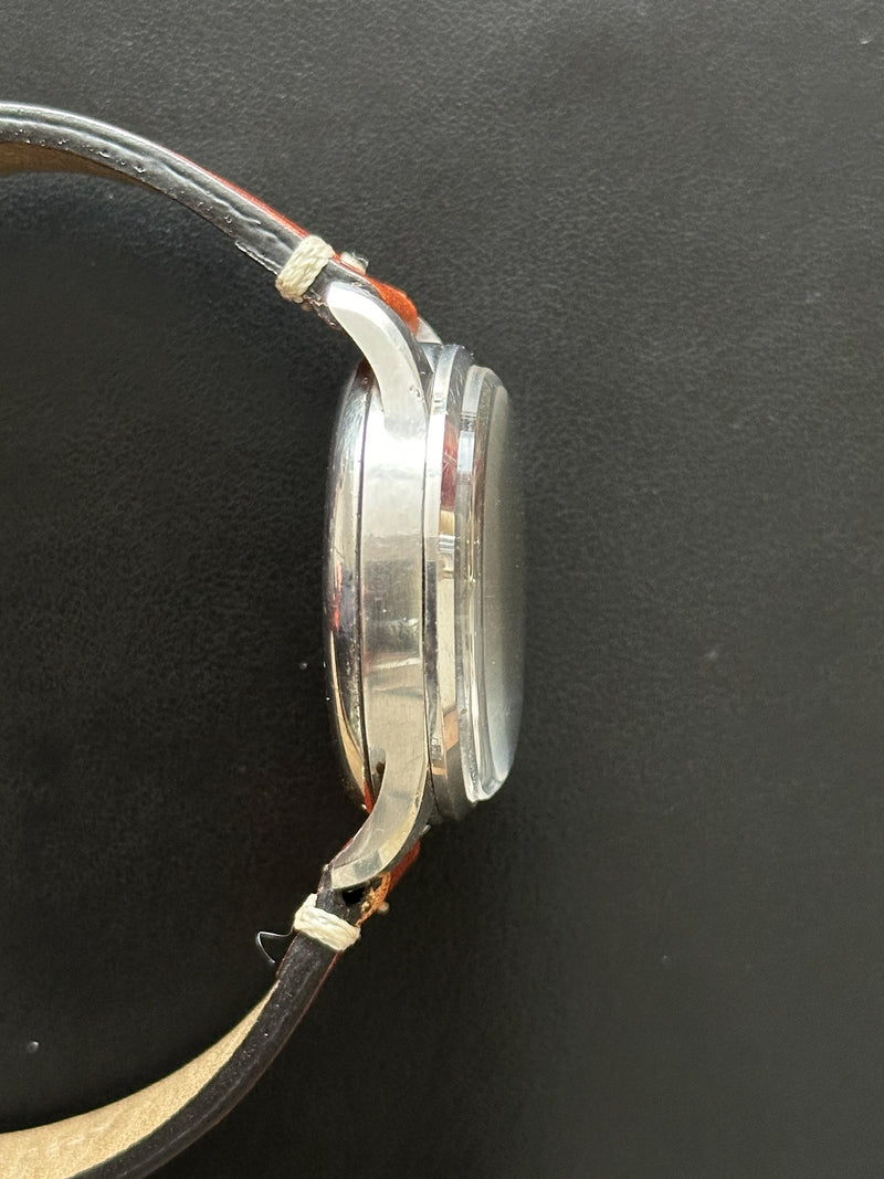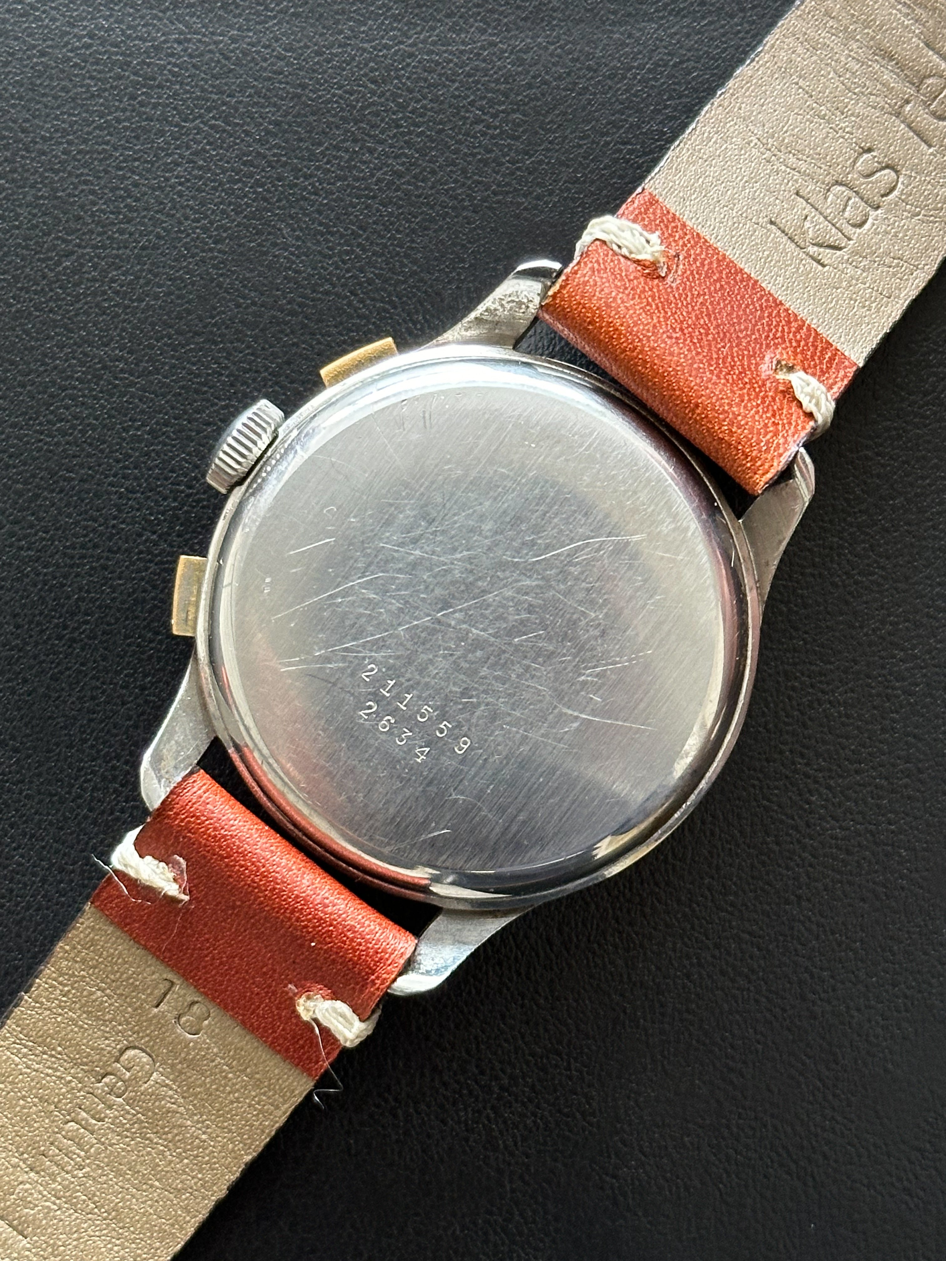 Dieser Chronograph funktioniert perfekt, ebenso wie seine 3 Hilfszifferblätter. Dieses Exemplar wurde sein ganzes Leben lang getragen, ist aber angesichts seines Alters immer noch in einem sehr guten Zustand. Das Gehäuse weist leichte Gebrauchsspuren auf (ungeschliffen), um seine Authentizität weitestgehend zu wahren. Auch das Glas ist in einem sehr guten Zustand. Dieses Stück hat das Originalzifferblatt, die Originalzeiger, die Krone und den Gehäuseboden. Es wird mit einem generischen terrakottafarbenen Lederarmband geliefert, das fast neu ist.