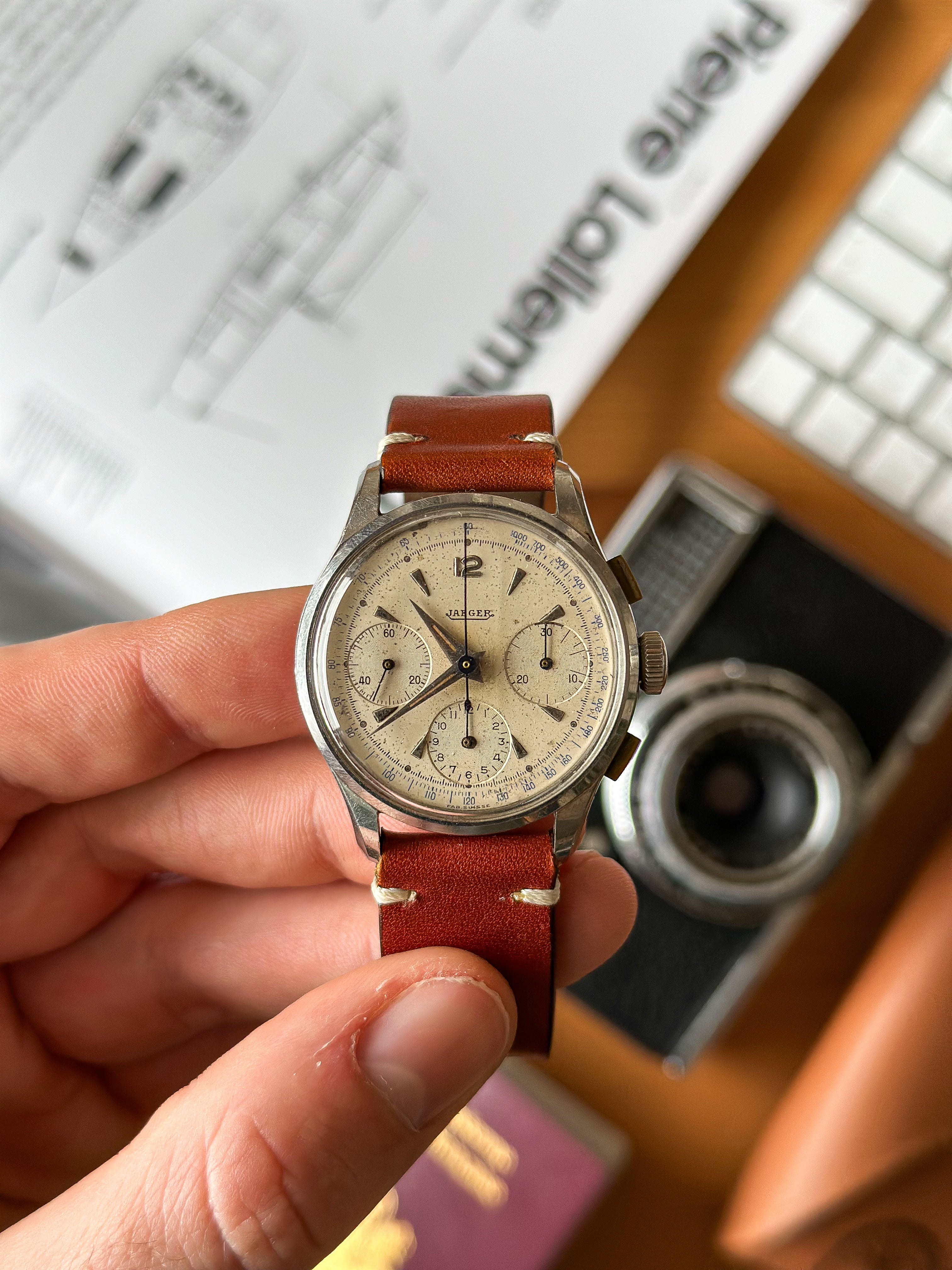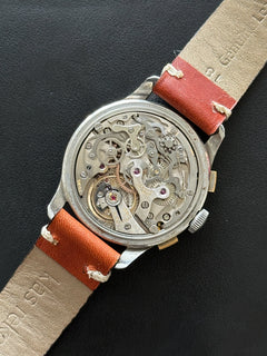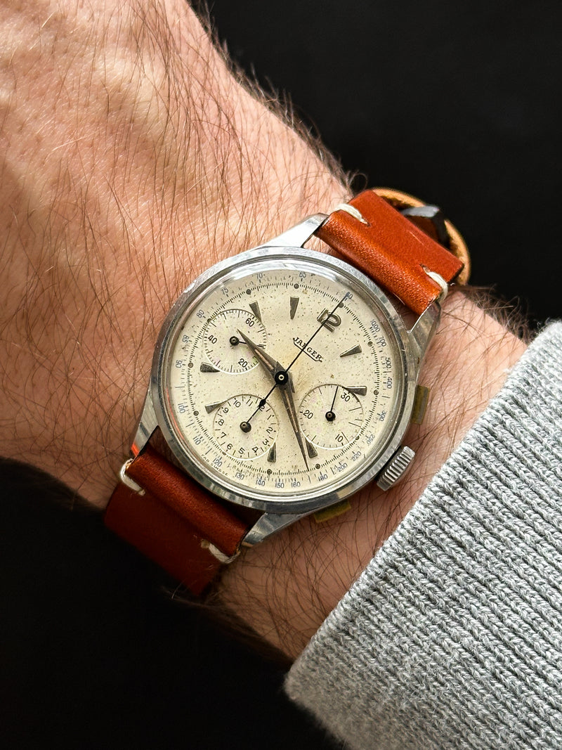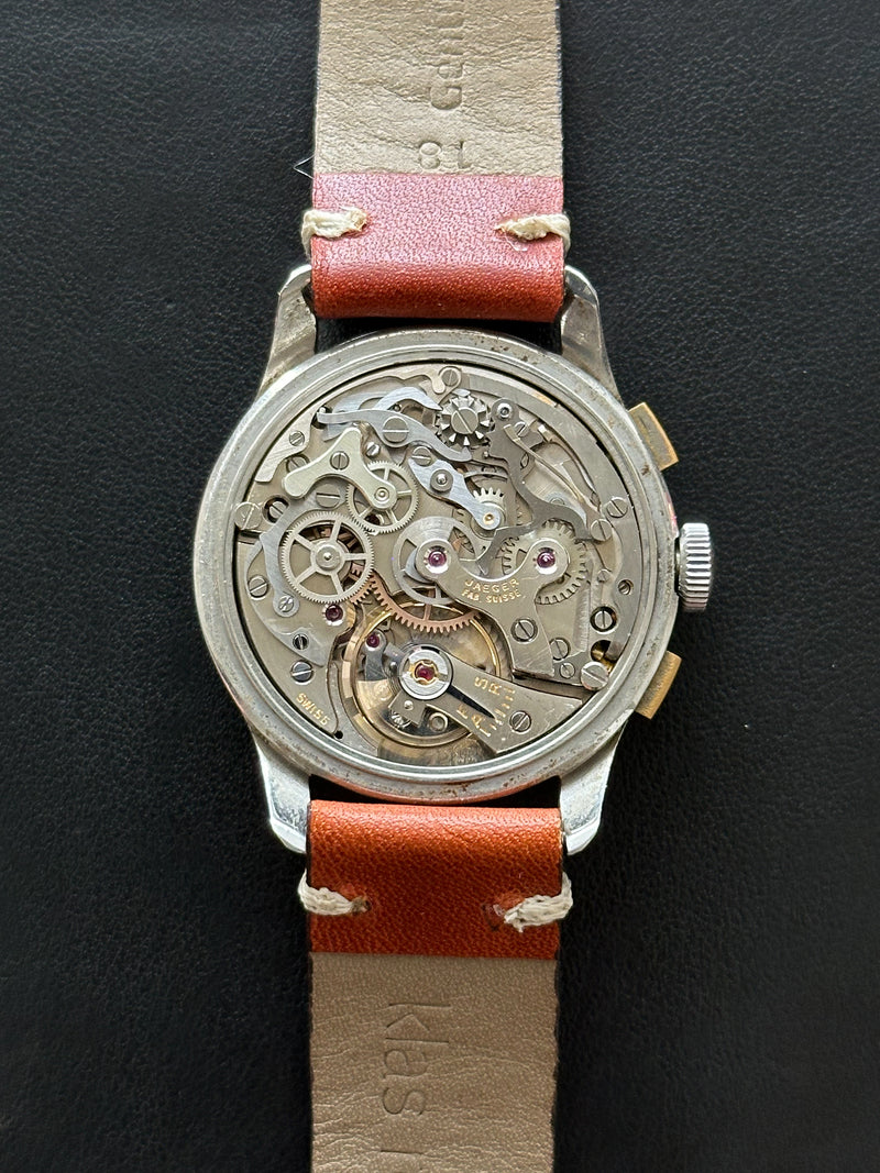 Dieses 35-mm-Stück wird von einem Valjoux 72-Uhrwerk mit Jaeger-Signatur angetrieben. Das Valjoux 72 ist vor allem am Abstand der verschiedenen Drücker zur Krone zu erkennen (der untere Drücker ist etwas weiter entfernt). Diese Uhr kann mit einem Cousin-Modell oder einer Variante des JLC Chronographen Ref. E335 mit gebläuten Stahlzeigern verglichen werden, die für den amerikanischen Markt bestimmt sind.