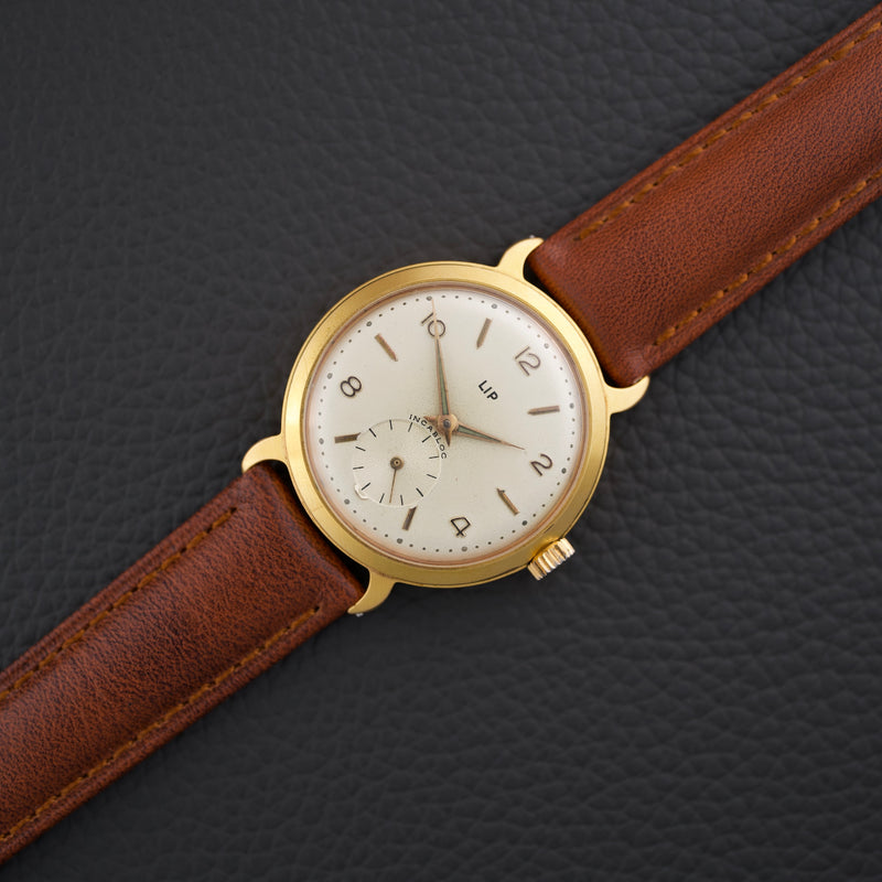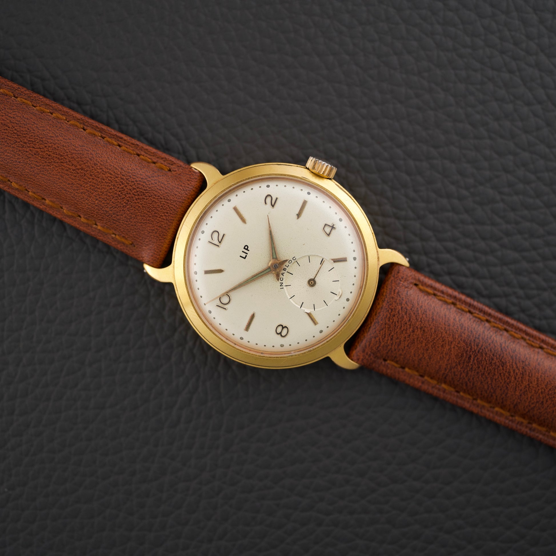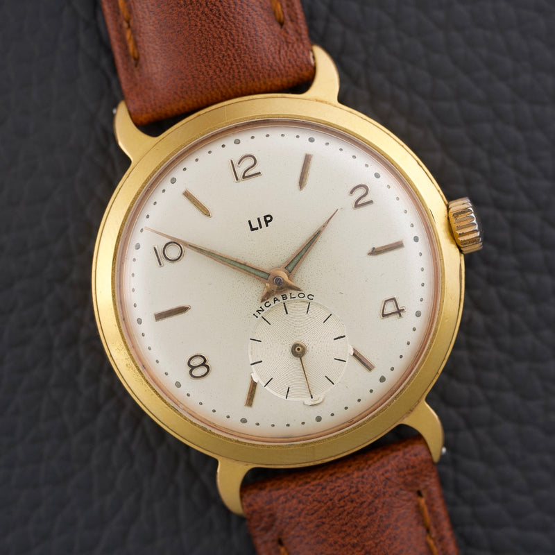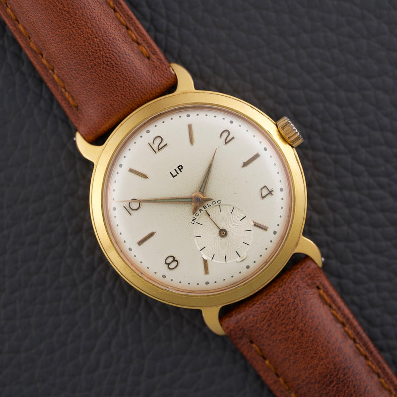Als Symbol französischer Uhrmacherkunst der Nachkriegszeit spiegelt diese mechanische Lip-Uhr aus den 1950er-Jahren perfekt den eleganten und funktionalen Stil der Manufaktur jener Zeit wider. Mit ihrem gelbgoldplattierten Gehäuse und der kleinen Sekunde bei 6 Uhr verkörpert sie die klassische Ästhetik der eleganten Uhren der Mitte des 20. Jahrhunderts: dezent, schlank, raffiniert und dank des Incabloc-Stoßsicherungssystems, das bereits als Maßstab für Robustheit galt, stets alltagstauglich.