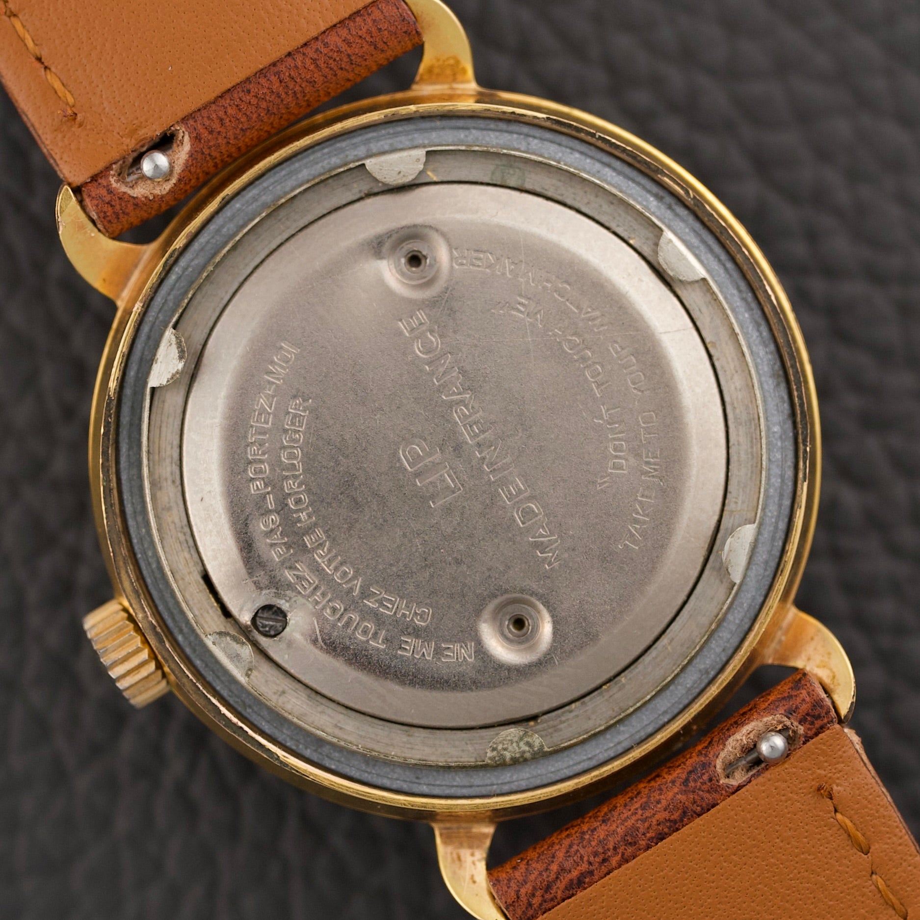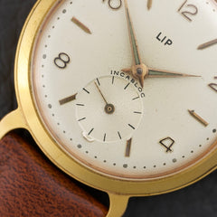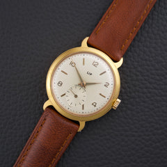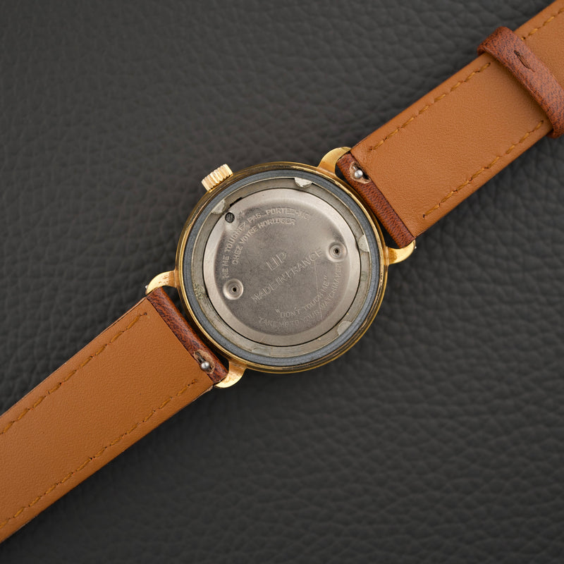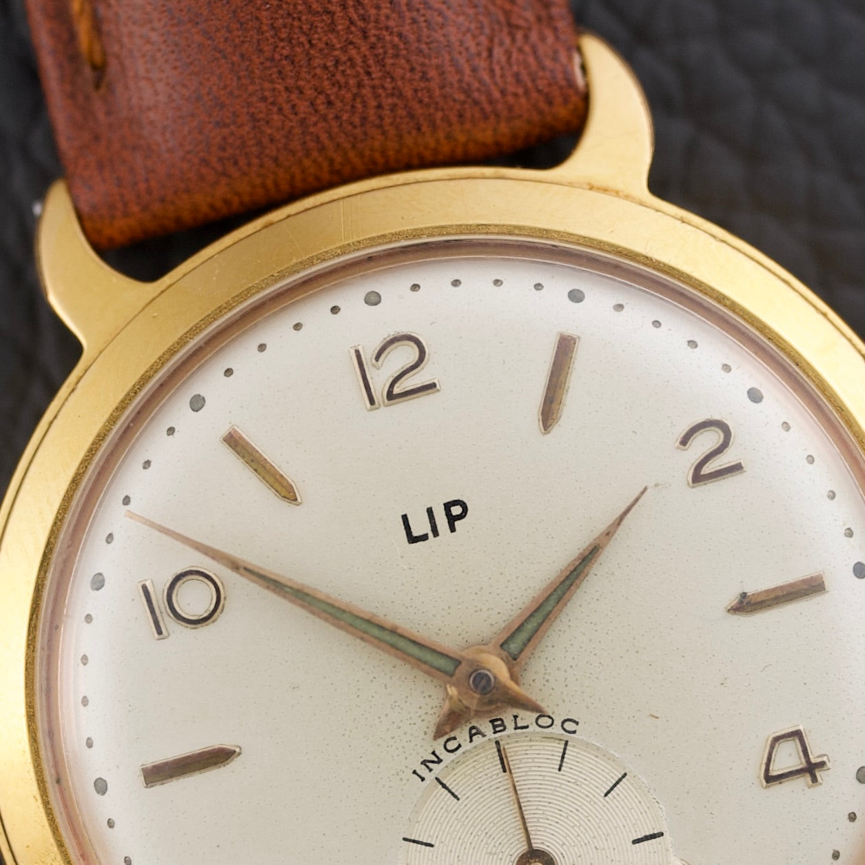 Als Symbol französischer Uhrmacherkunst der Nachkriegszeit spiegelt diese mechanische Lip-Uhr aus den 1950er-Jahren perfekt den eleganten und funktionalen Stil der Manufaktur jener Zeit wider. Mit ihrem gelbgoldplattierten Gehäuse und der kleinen Sekunde bei 6 Uhr verkörpert sie die klassische Ästhetik der eleganten Uhren der Mitte des 20. Jahrhunderts: dezent, schlank, raffiniert und dank des Incabloc-Stoßsicherungssystems, das bereits als Maßstab für Robustheit galt, stets alltagstauglich.