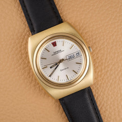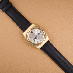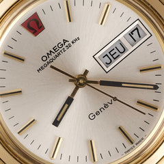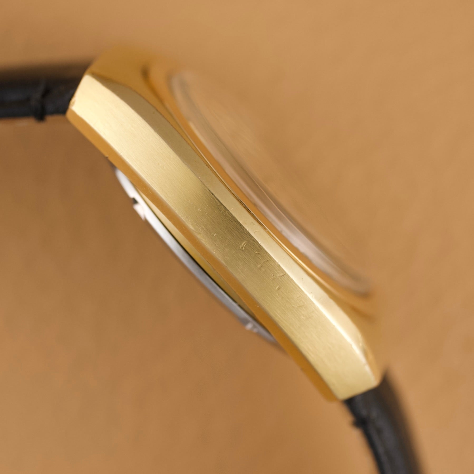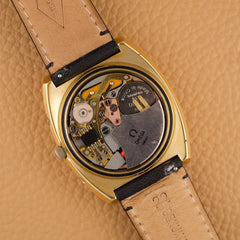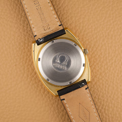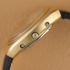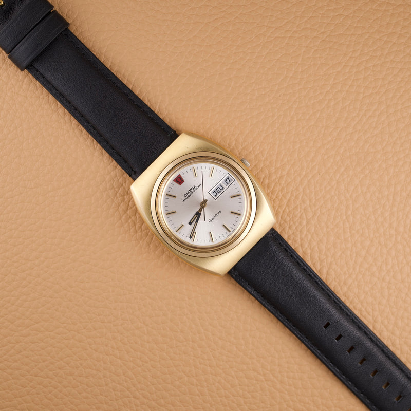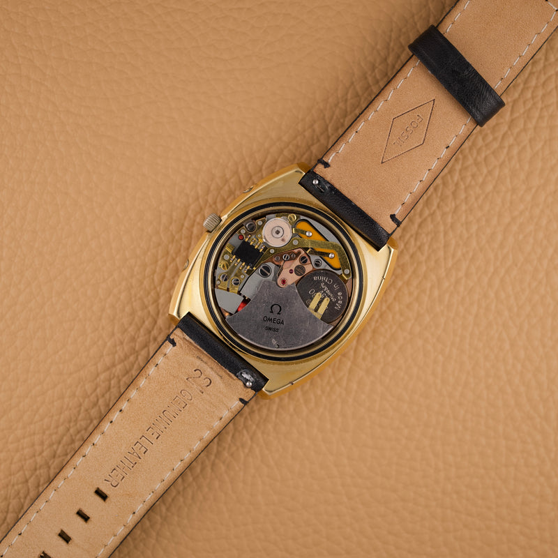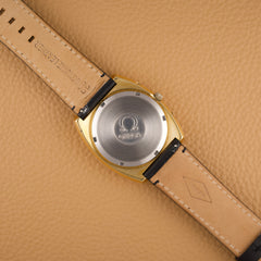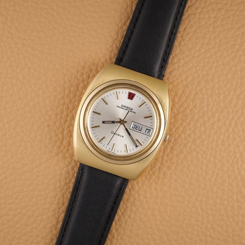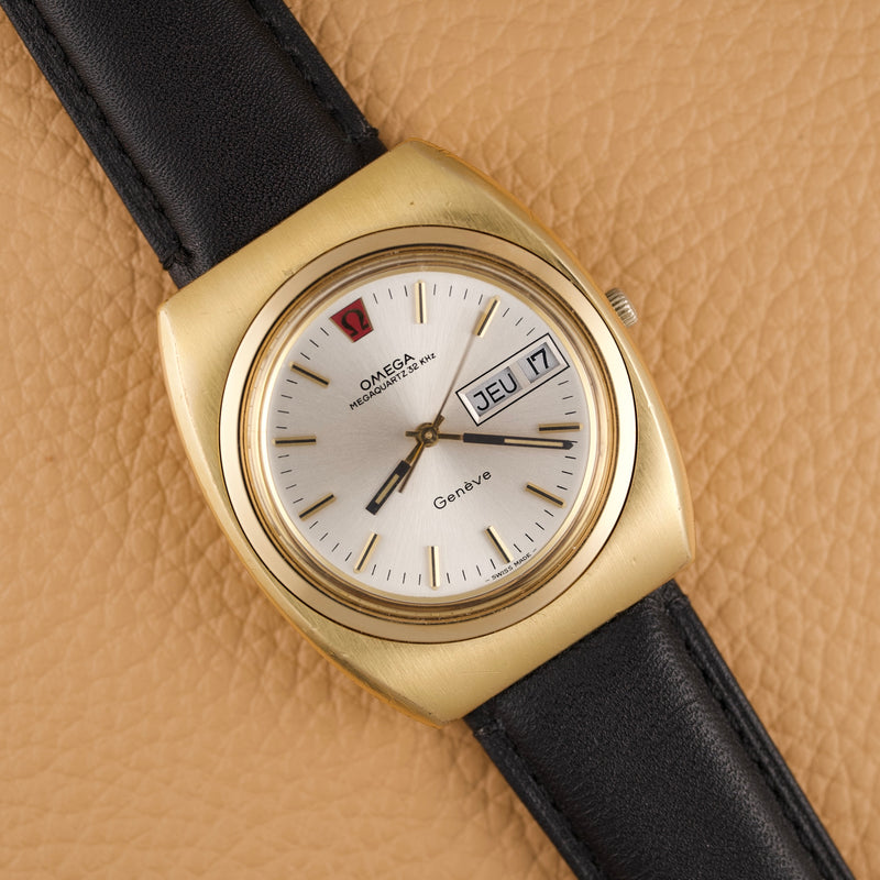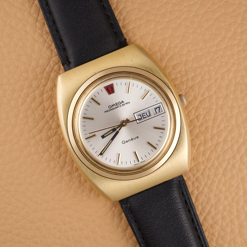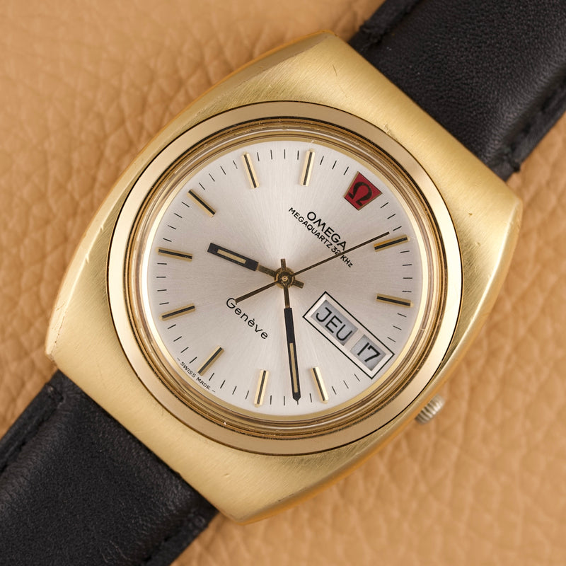 Als seltener Vertreter des goldenen Zeitalters der Schweizer Quarzuhren verkörpert diese Omega Genève Megaquartz 32 kHz Omegas Antwort auf die technologische Revolution der 1970er Jahre. Mit ihrem 39 mm großen, mit 14 Karat Gelbgold (20 Mikrometer) vergoldeten Gehäuse und den für das Jahrzehnt typischen klaren, kantigen Linien weist diese Uhr einen entschieden retro-futuristischen Charakter auf. Dieses Exemplar aus dem Jahr 1972 ist in nahezu perfektem Zustand.
