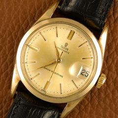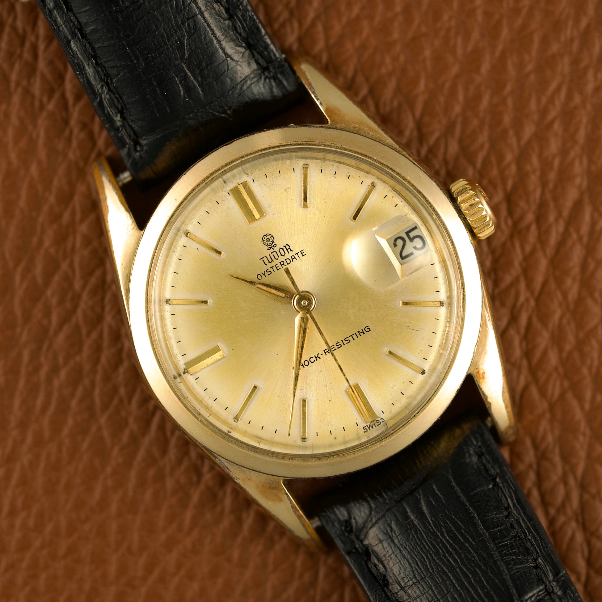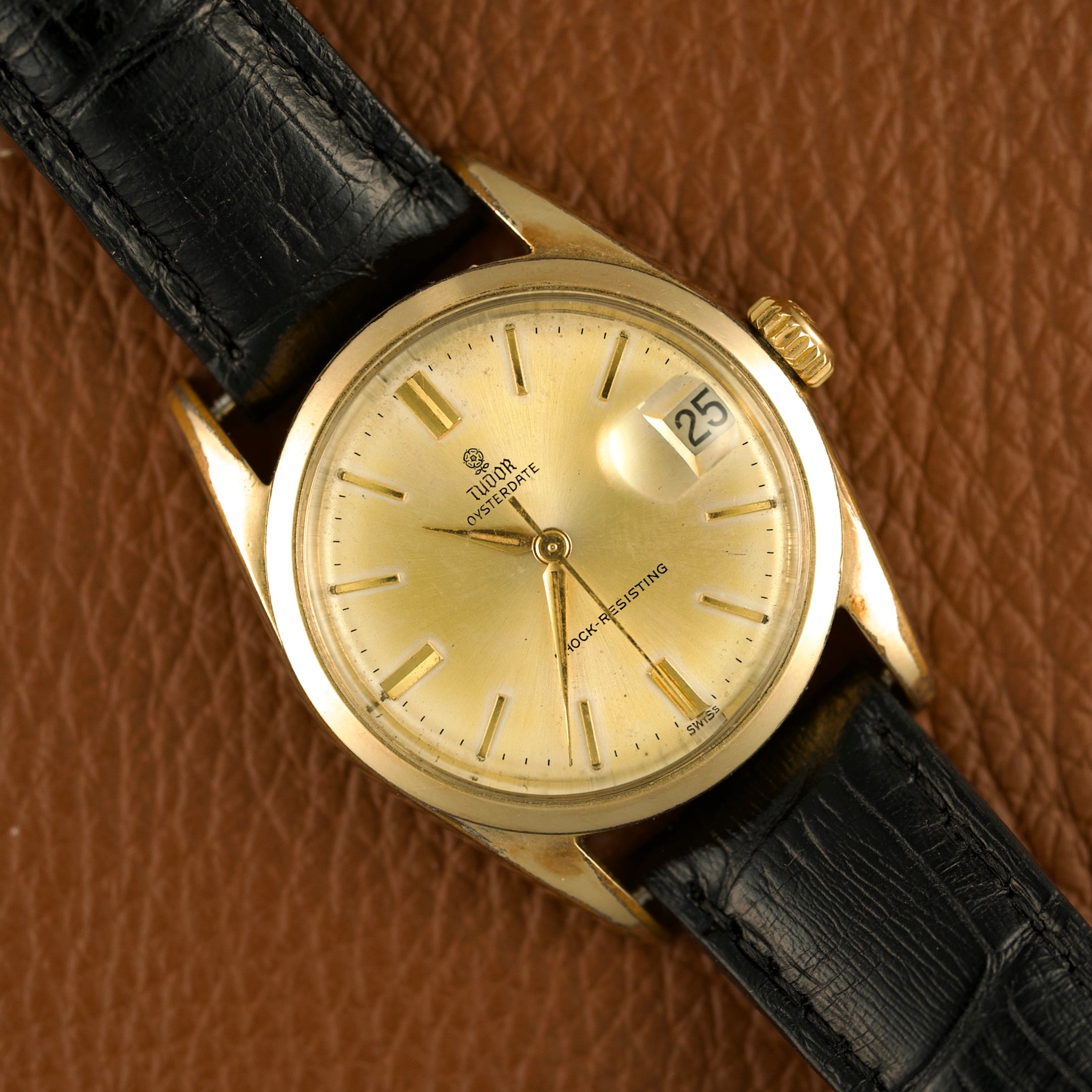 Wir bieten Ihnen diese schöne Tudor Oysterdate Ref. 7962 aus dem Jahr 1965 mit Rolex Oyster-Gehäuse und verschraubter Krone, signiert von Rolex.