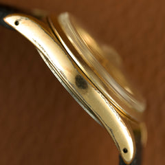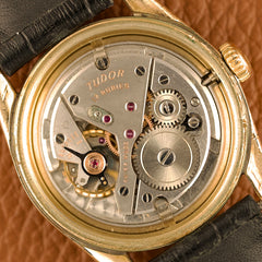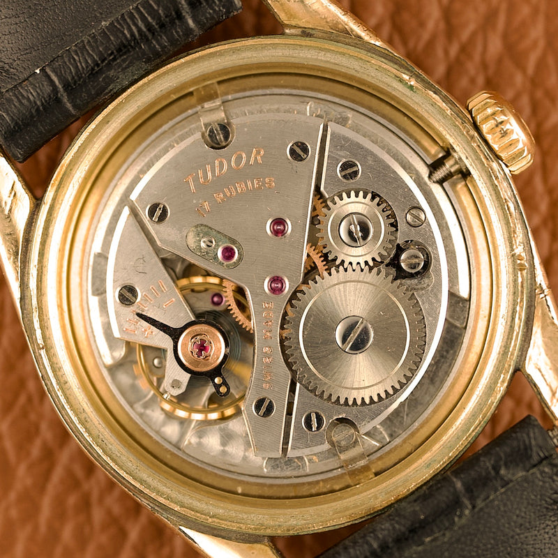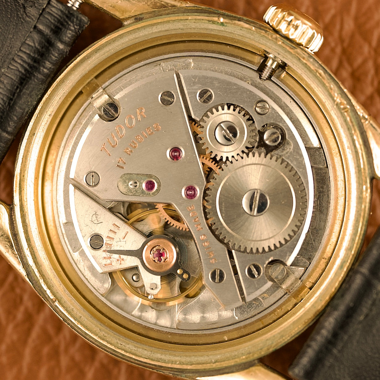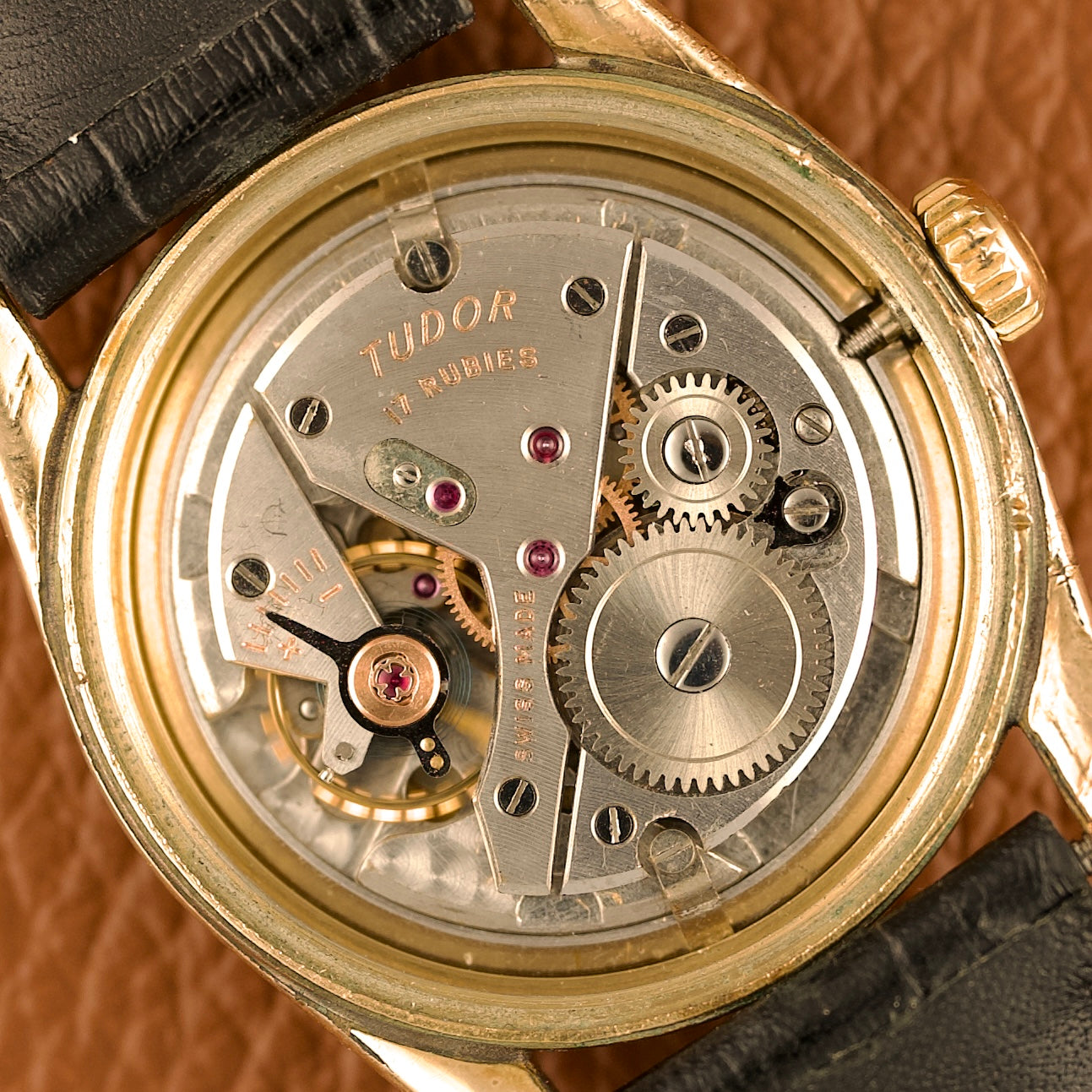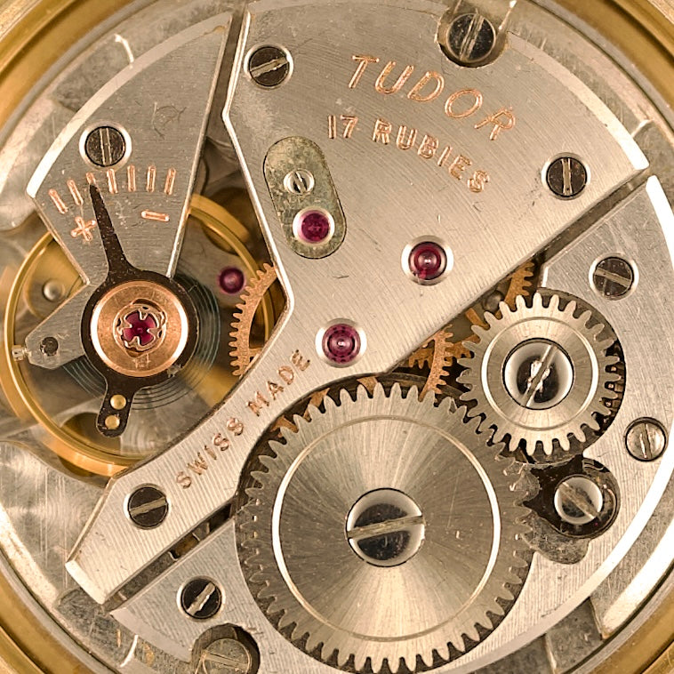 Ihr Durchmesser von 34 mm erinnert an die Beliebtheit schlanker Dresswatches der 50er/60er Jahre. Das goldene Zifferblatt hat eine cremefarbene Patina mit Tendenz zu Silber, die dieser Tudor-Uhr einen attraktiven Vintage-Stil verleiht. Sie ist mit einem Handaufzugswerk, Kaliber 2403, ausgestattet, das ihr eine Gangreserve von rund vierzig Stunden verleiht.