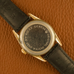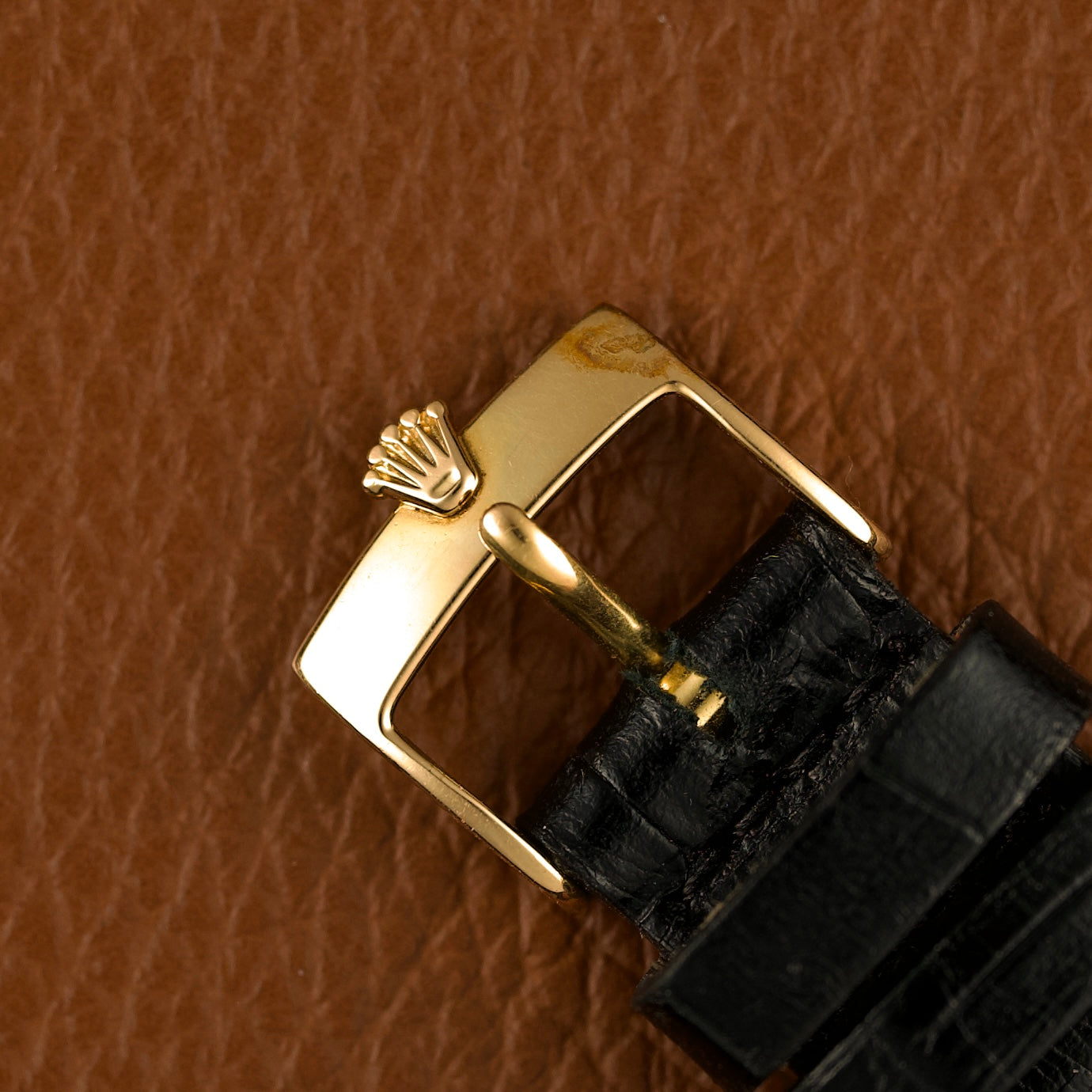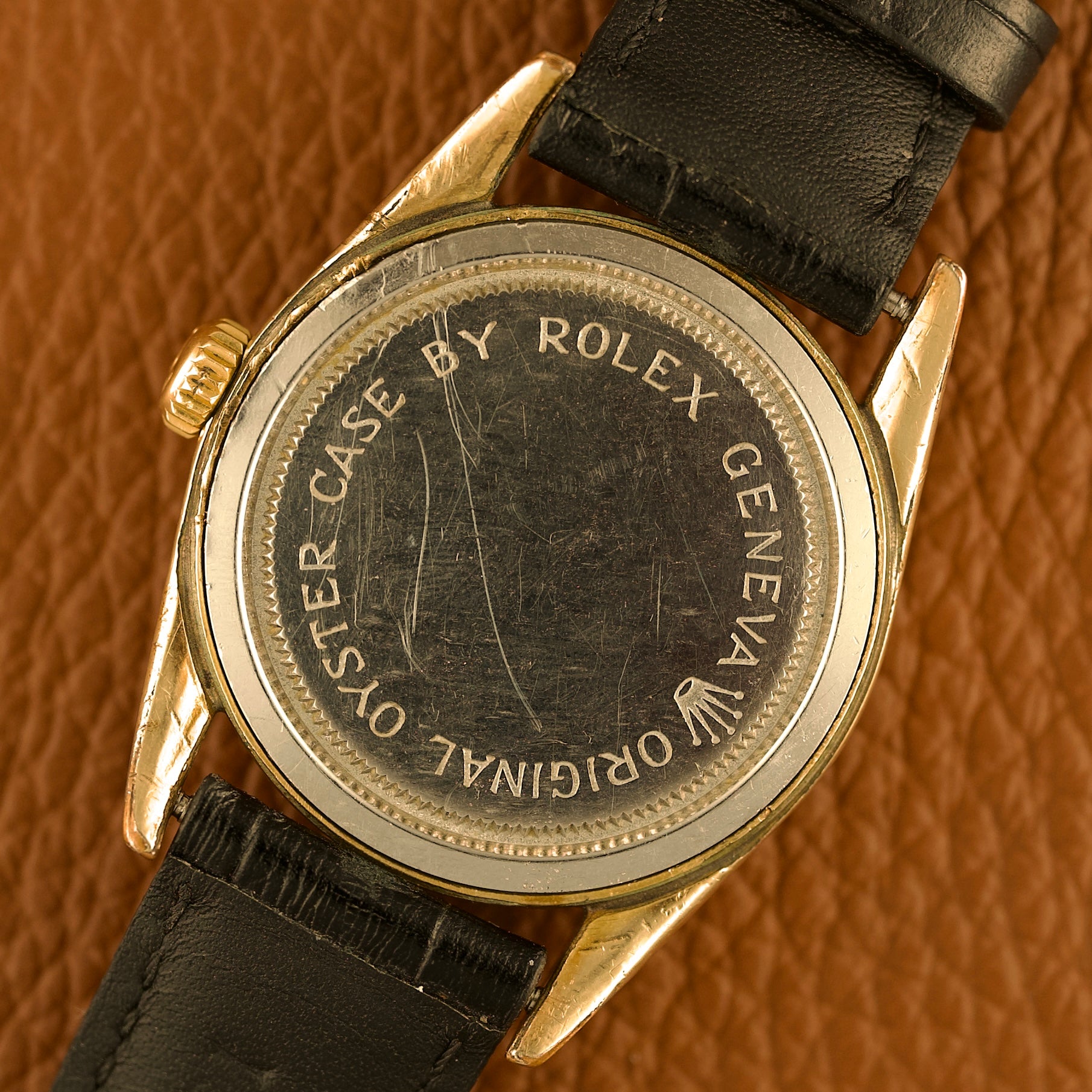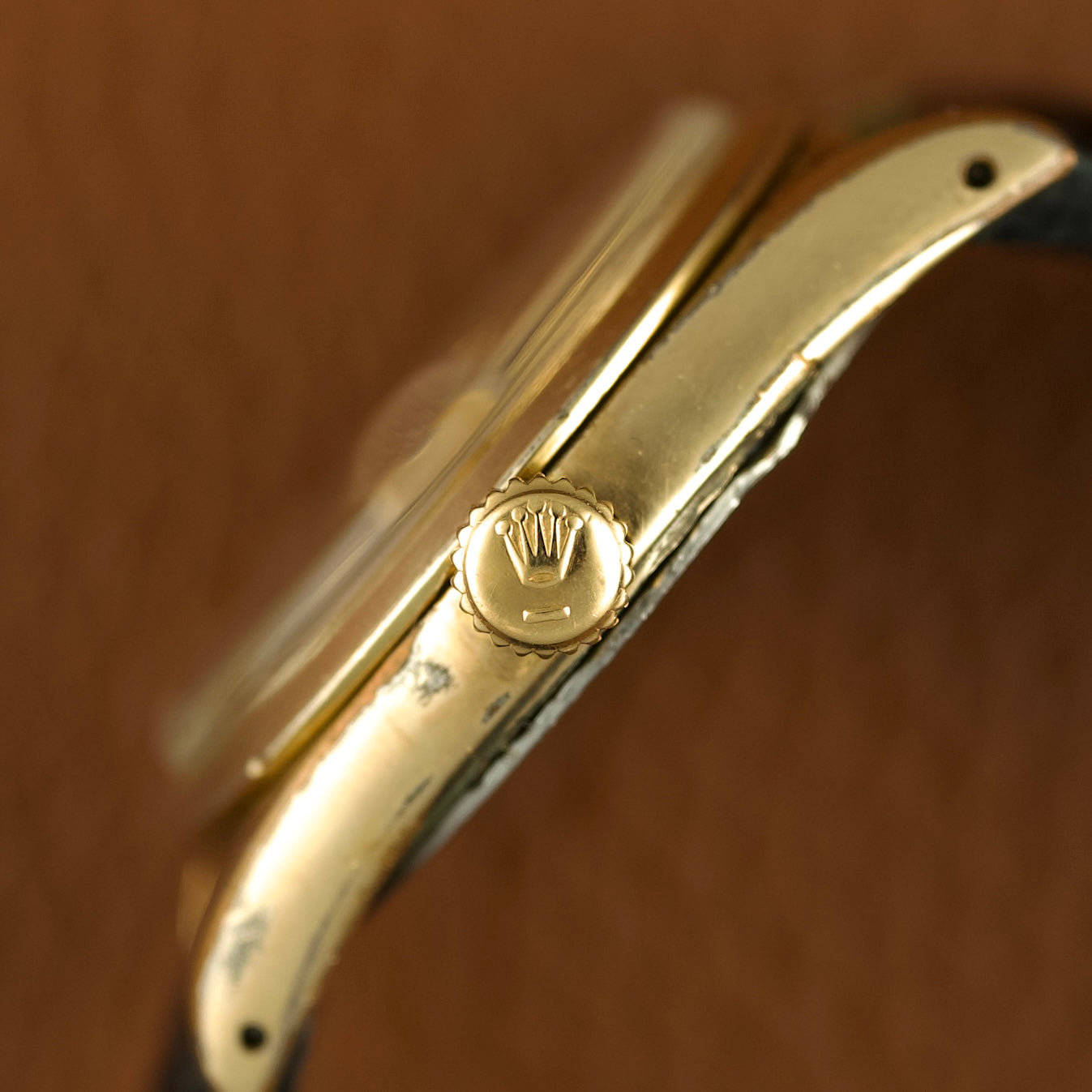 Auf dem Gehäuse sind einige Gebrauchsspuren sichtbar, es wurde nicht poliert, um seine Geschichte und Authentizität zu bewahren. Das Zifferblatt ist in sehr gutem Zustand und gleichmäßig patiniert. Sie verfügt über alle Originalteile (Zifferblatt, Zeiger, Krone, Gehäuseboden) und wird von einem klassischen schwarzen Lederarmband mit Rolex-Schließe begleitet.