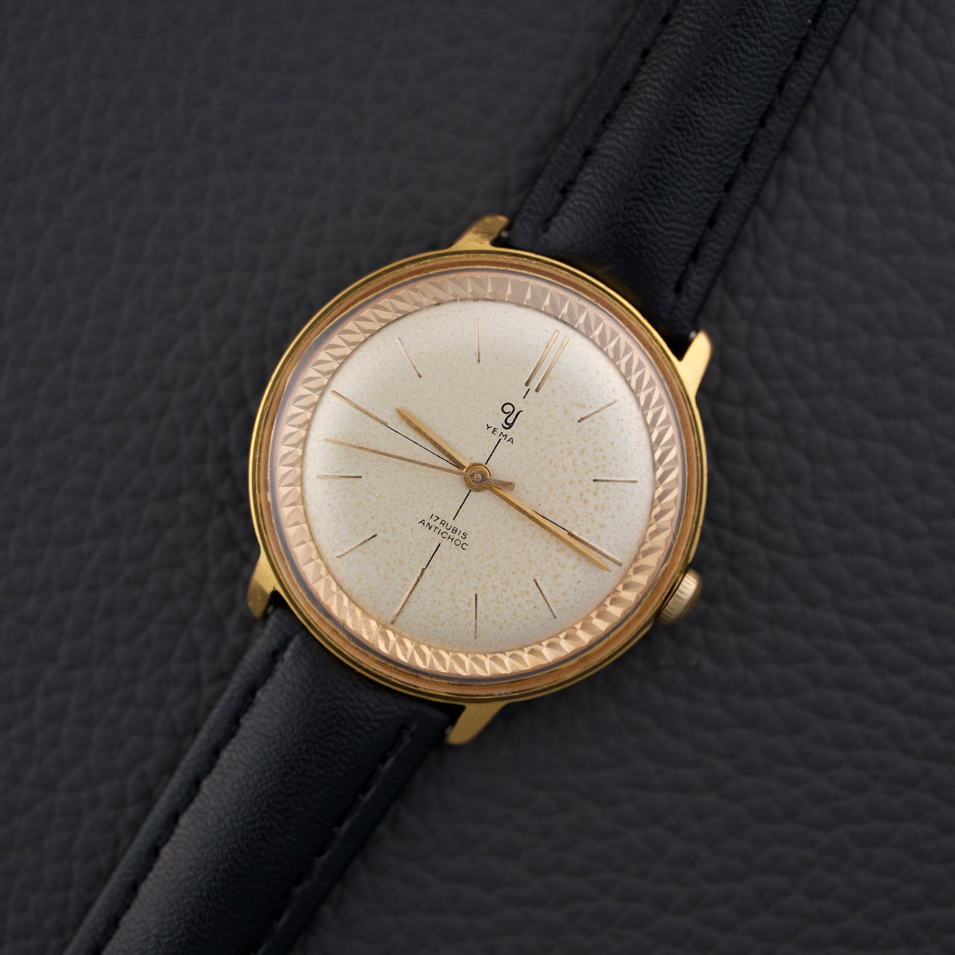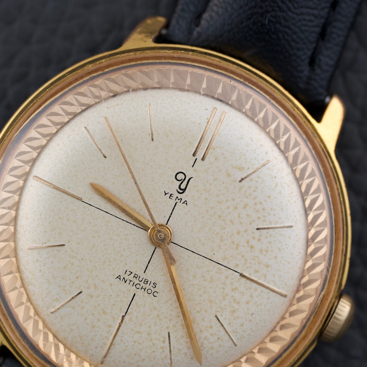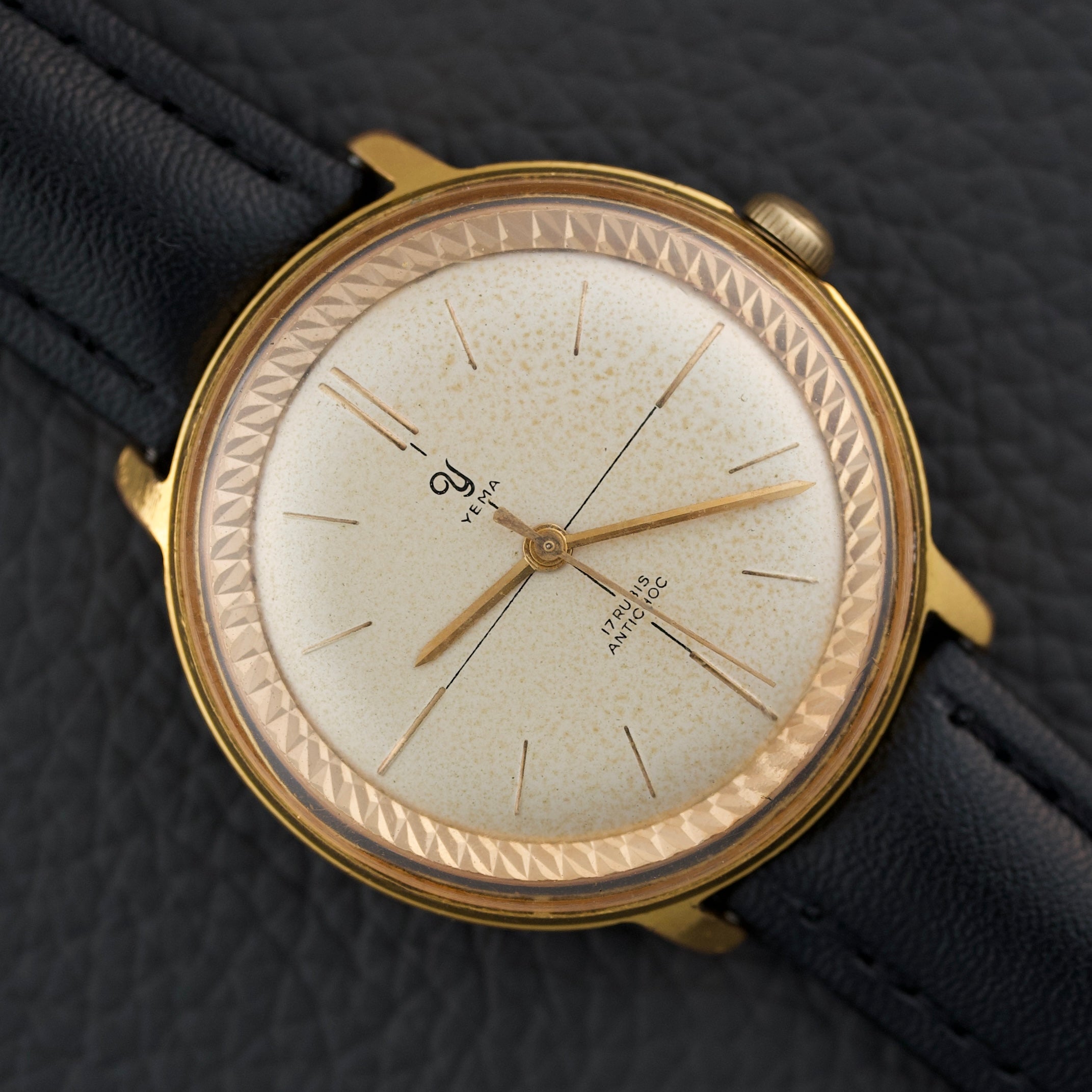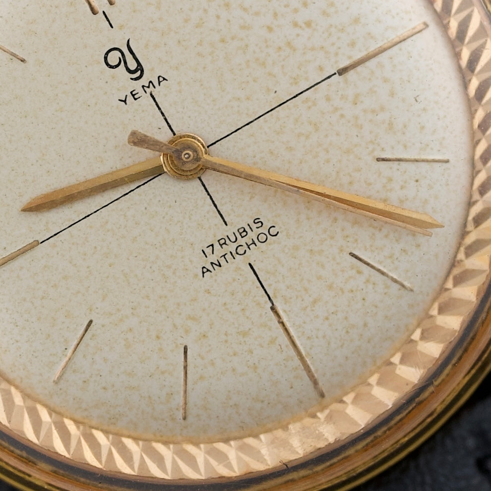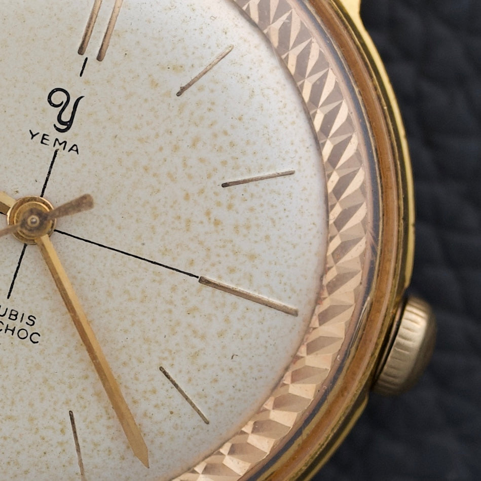 Das schlichte Zifferblatt mit seinen feinen Stabindizes unterstreicht die elegante Schlichtheit, die typisch für die Mitte des 20. Jahrhunderts war. Angetrieben von einem Handaufzugswerk und ausgestattet mit einem Stoßschutz – ein wichtiges Merkmal funktionaler Uhren jener Zeit – vereint diese Yema Vintage-Charme, Eleganz und Funktionalität.