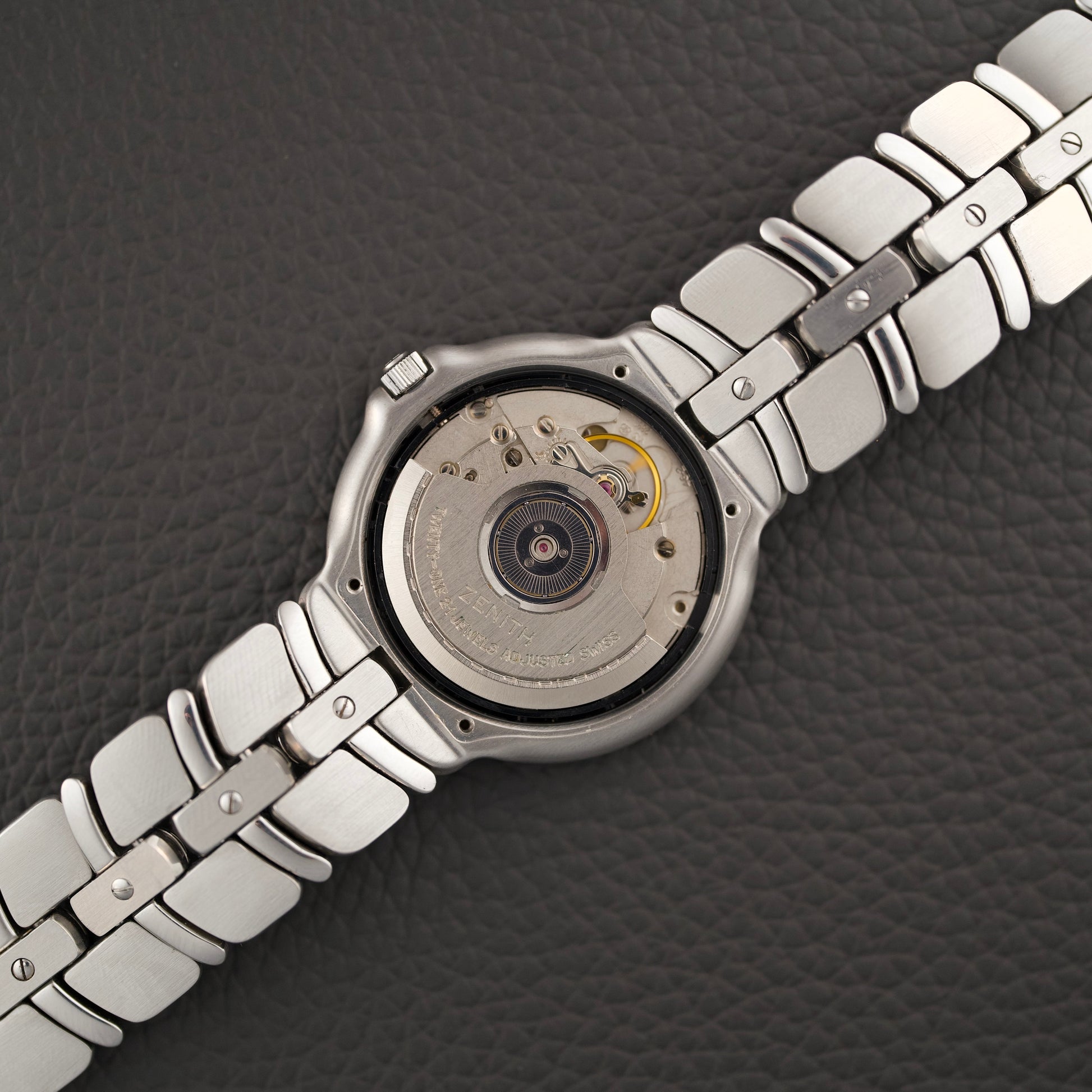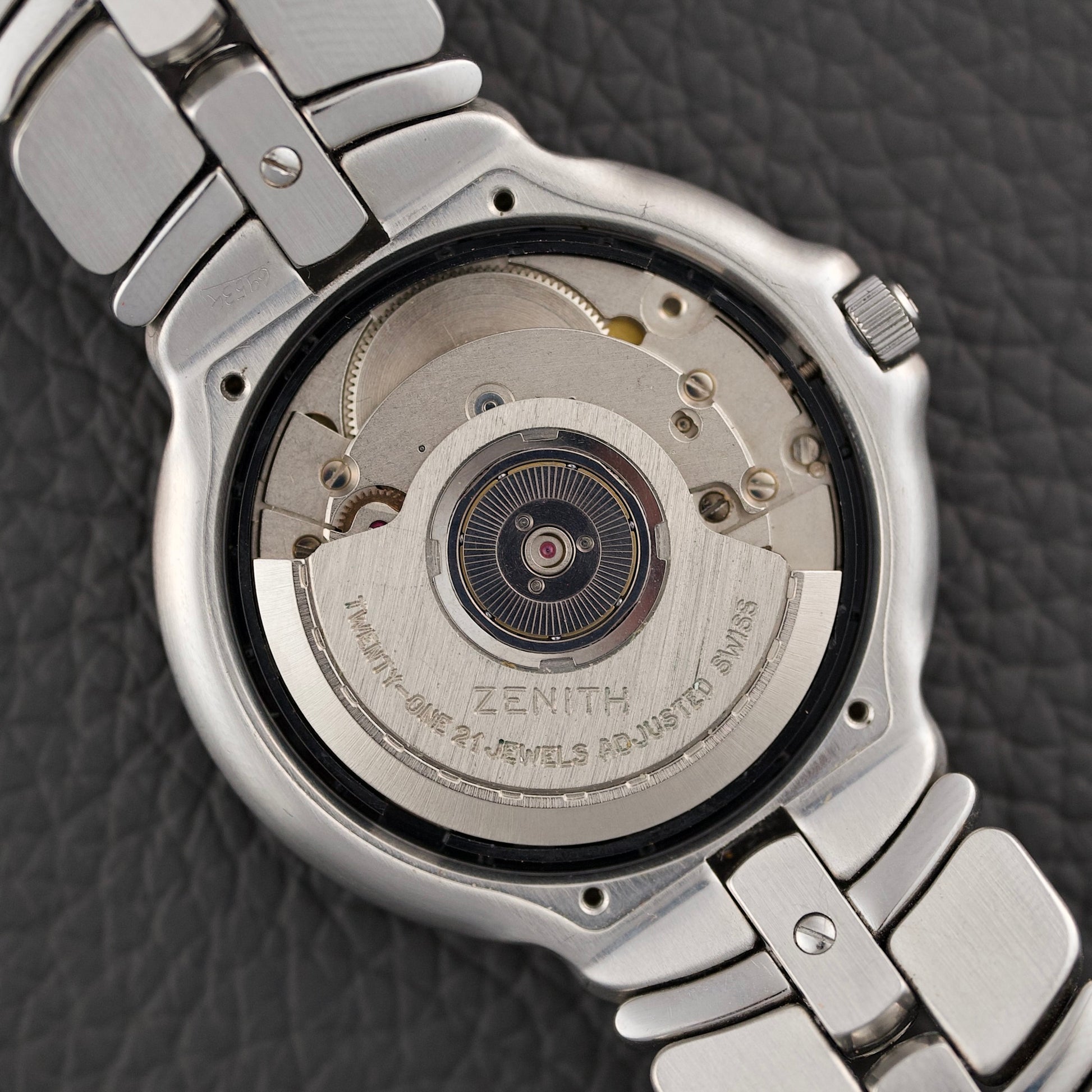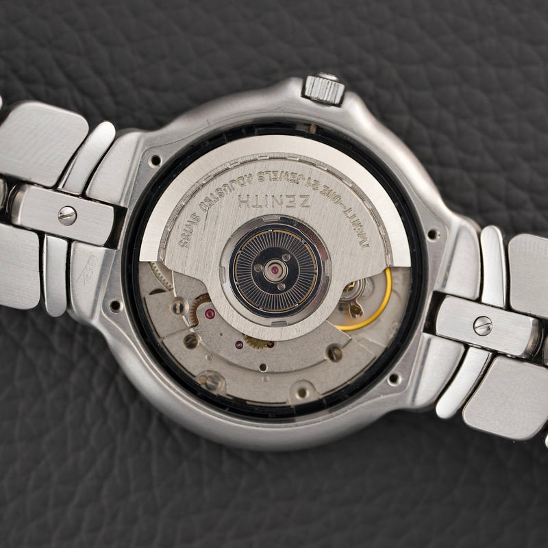 Die Uhr beherbergt das Zenith-Kaliber 46-2, basierend auf dem renommierten ETA 2892-2, einem der zuverlässigsten und elegantesten Automatikwerke seiner Zeit. Diese Wahl unterstreicht Zeniths Bestreben, Robustheit und mechanische Finesse zu vereinen und gleichzeitig die unverwechselbare ästhetische Identität der Marke zu bewahren.