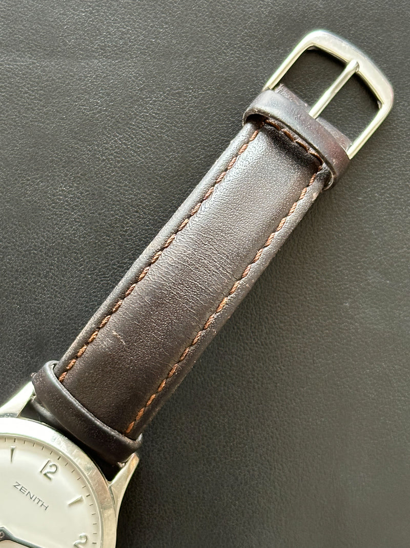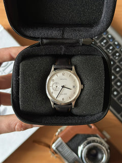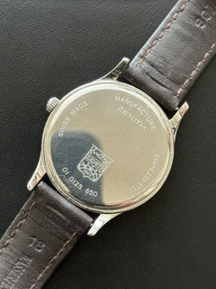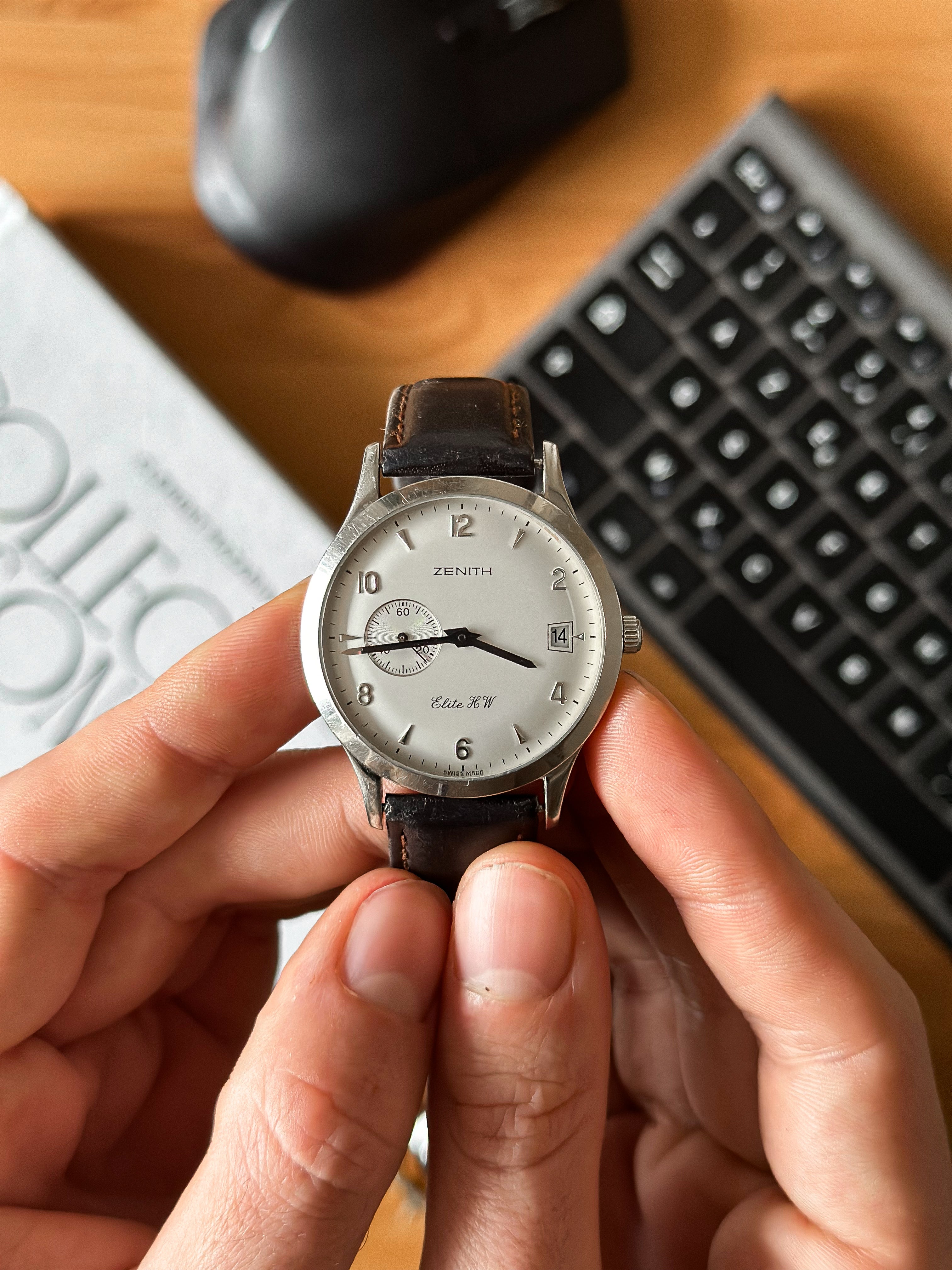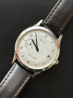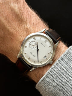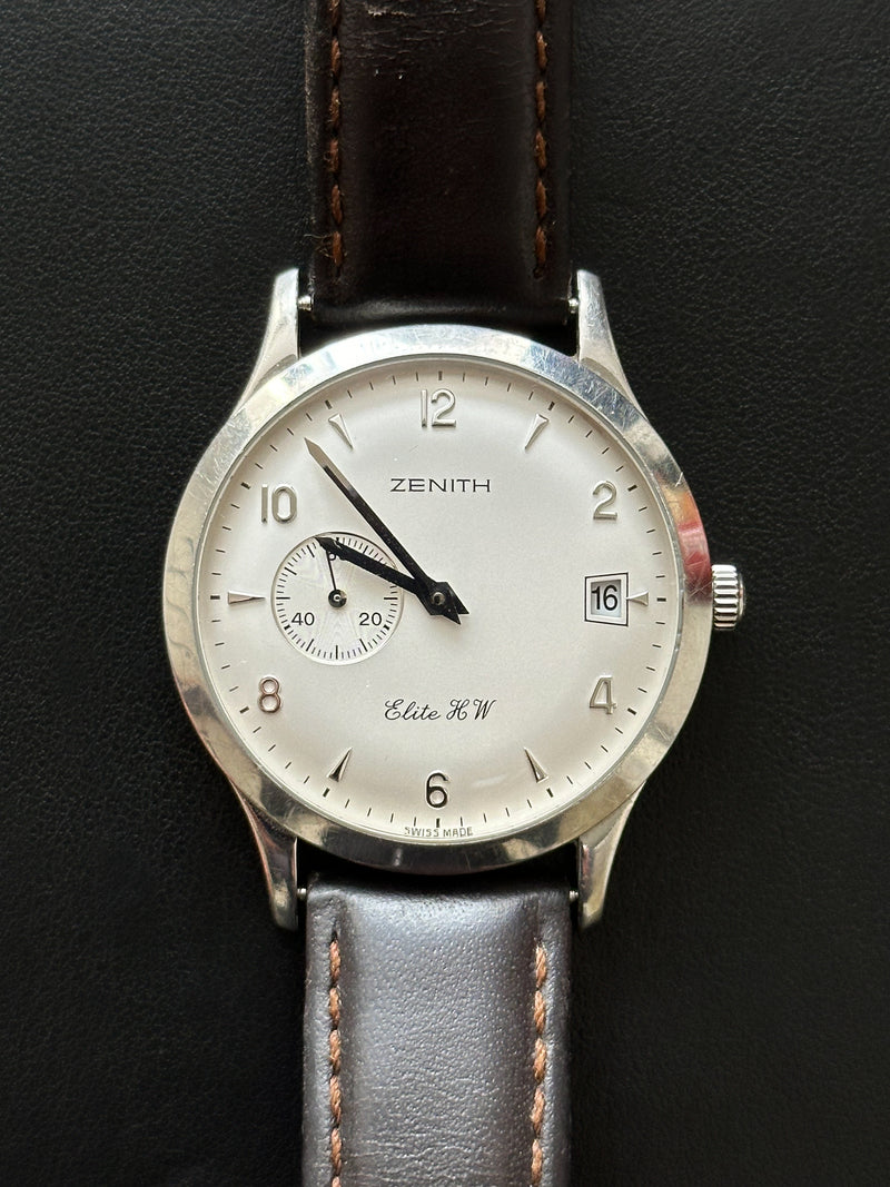 Sehr elegante Zenith Elite HW aus dem Jahr 2000 mit kleiner Sekunde bei 9 Uhr. Die Angabe HW steht für „Handaufzug“. Hierbei handelt es sich um die Zenith Elite mit Handaufzug, wodurch sie ein noch dünneres Gehäuse als das Automatikmodell hat. Dieses Modell wurde 1997 auf den Markt gebracht und sein klassischer Stil erinnert gut an diese Jahre.