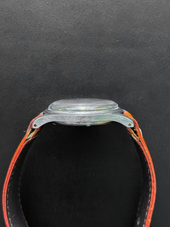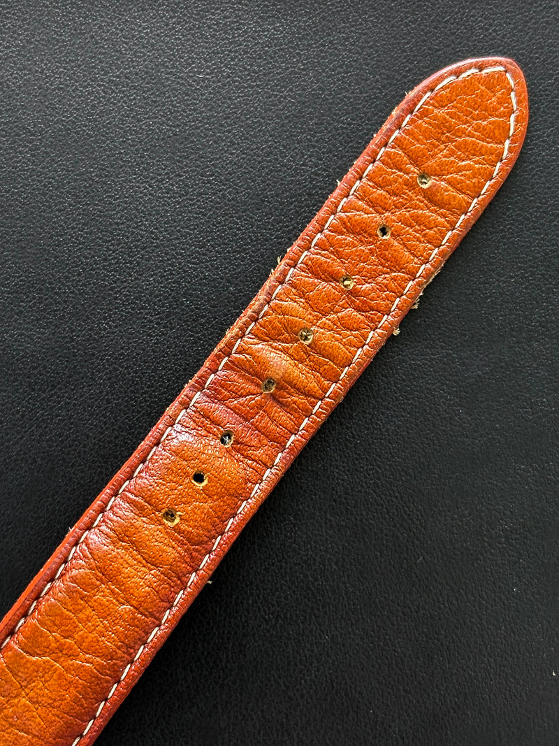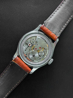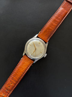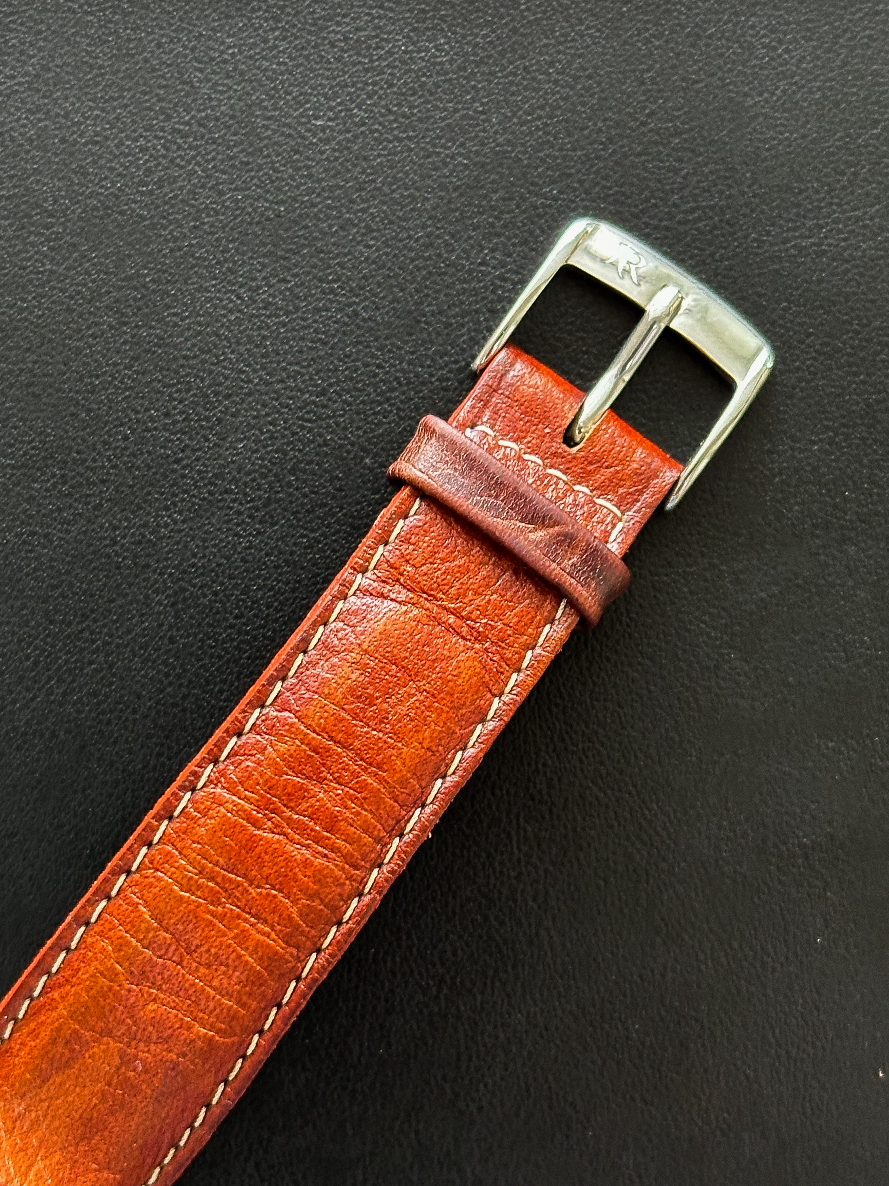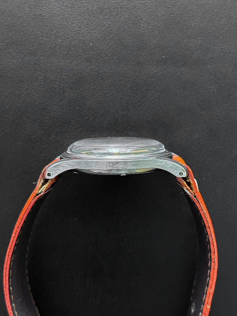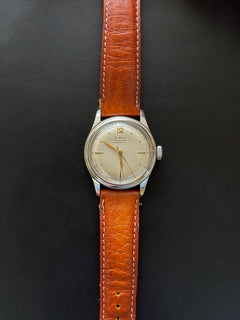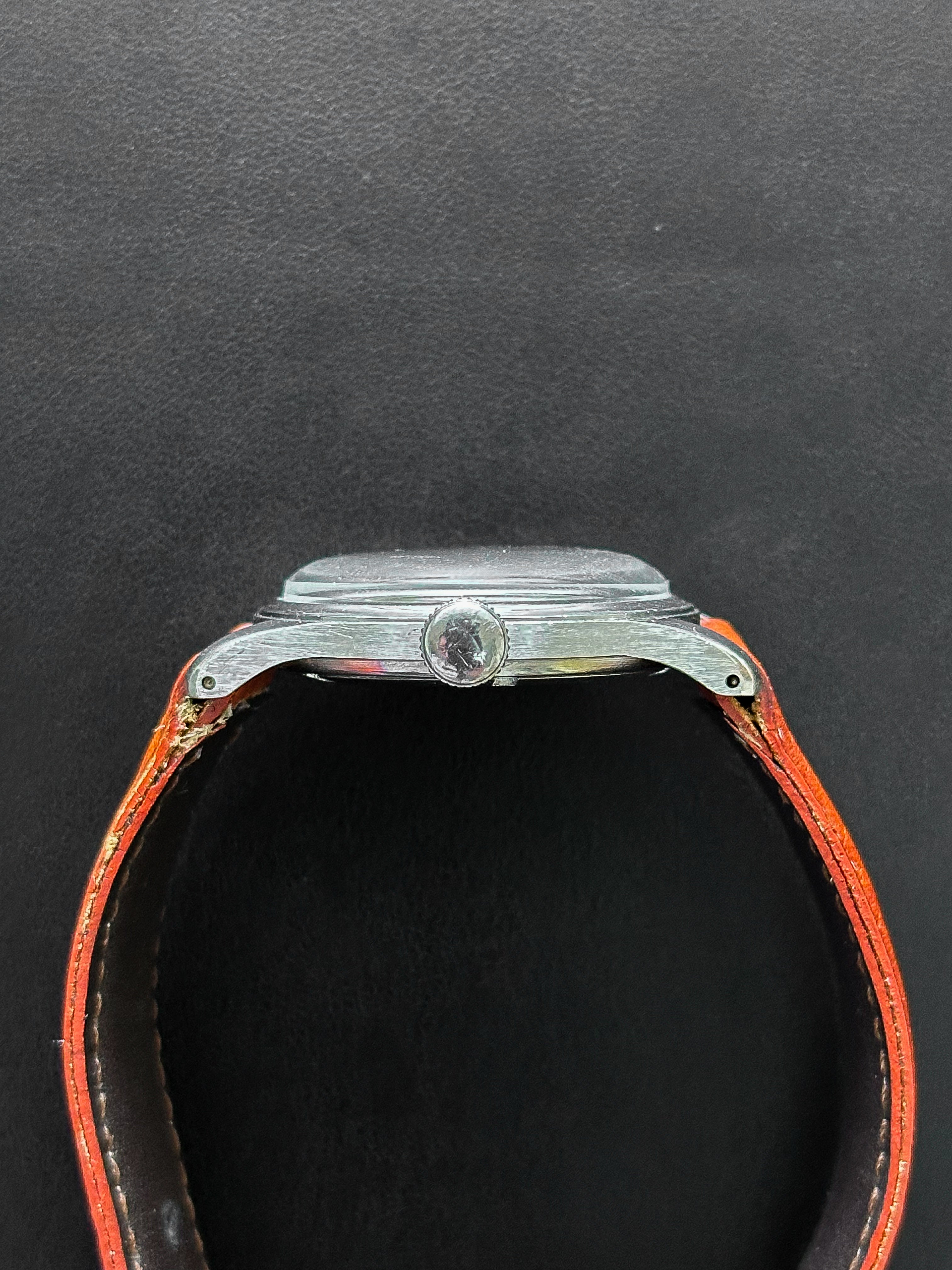 Sie ist mit einem Handaufzugswerk Kaliber 1080 von ETA ausgestattet. Außerdem wird sie mit einem generischen Lederarmband in sehr gutem Zustand geliefert, um diesen Vintage-Look zu vervollständigen.