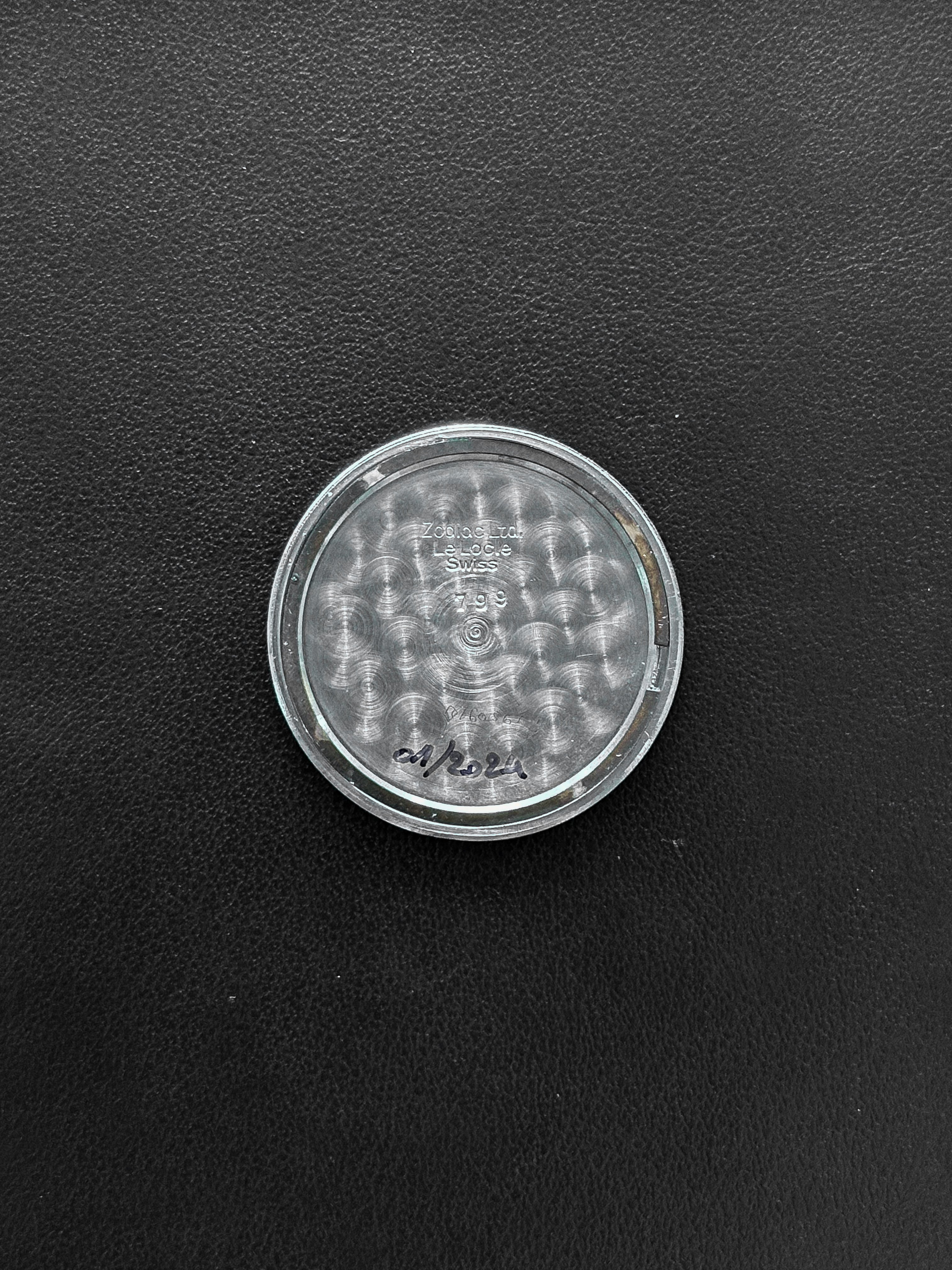 Es hat ein kleines 32,5-mm-Gehäuse und ist nur 9 mm dick. Das cremefarbene Zifferblatt dieser Uhr gibt den Blick auf Indizes und goldene Zeiger frei. Auf der Rückseite der Box trägt dieser Zodiac die Referenz 799.