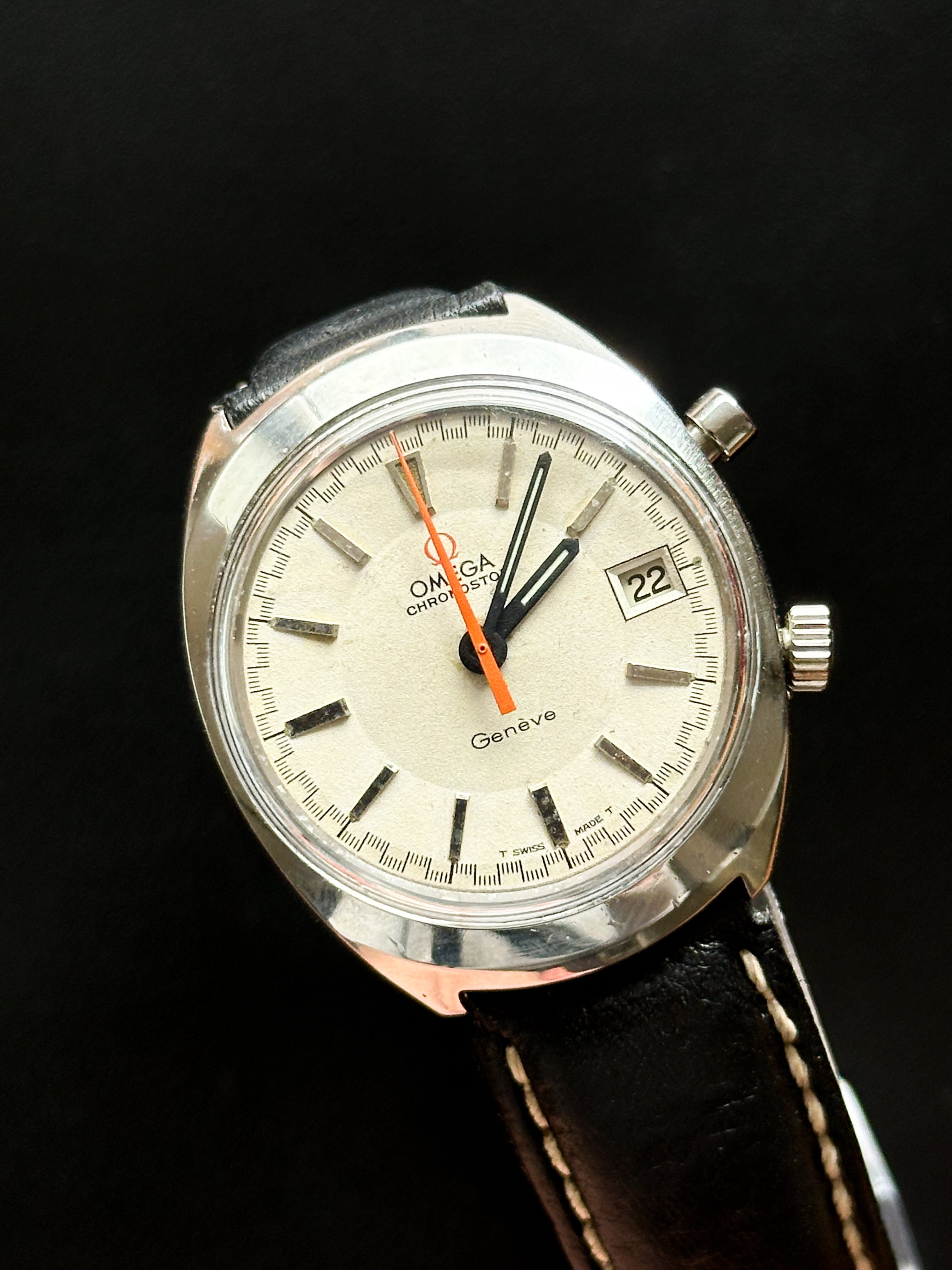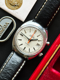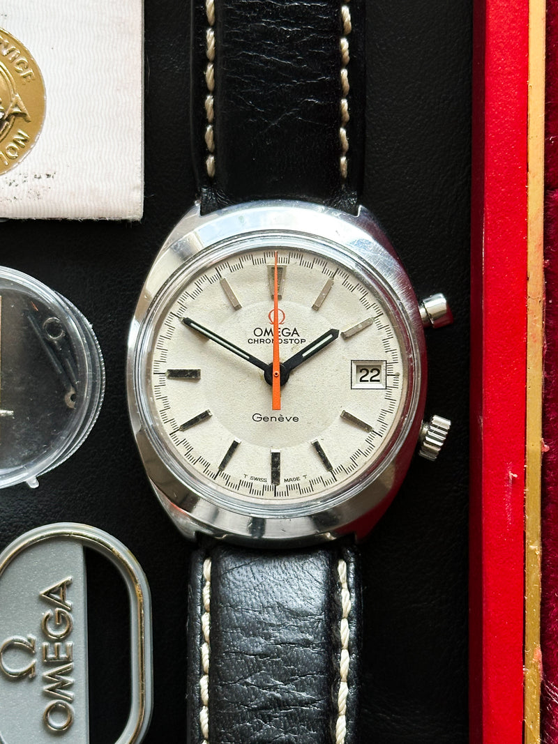 The Omega Chronostop is a unique chronograph, launched in 1966, distinguished by its simplicity and bold design. Unlike traditional chronographs, it has a single central 60-second hand (often orange) and a single pusher, allowing only short intervals of up to 60 seconds to be timed.