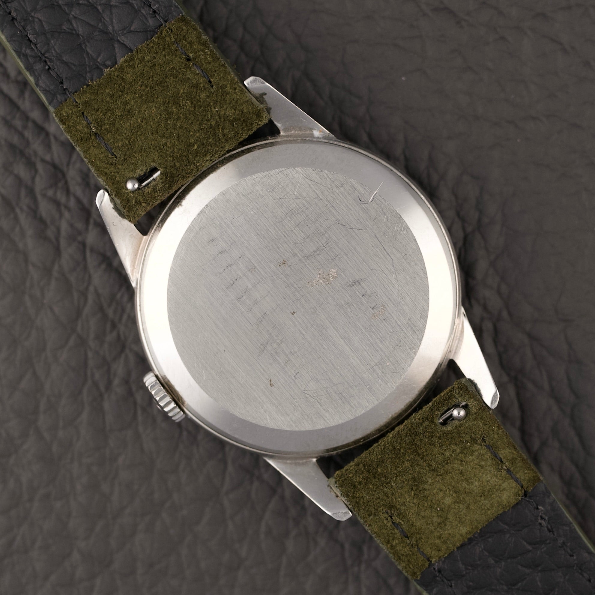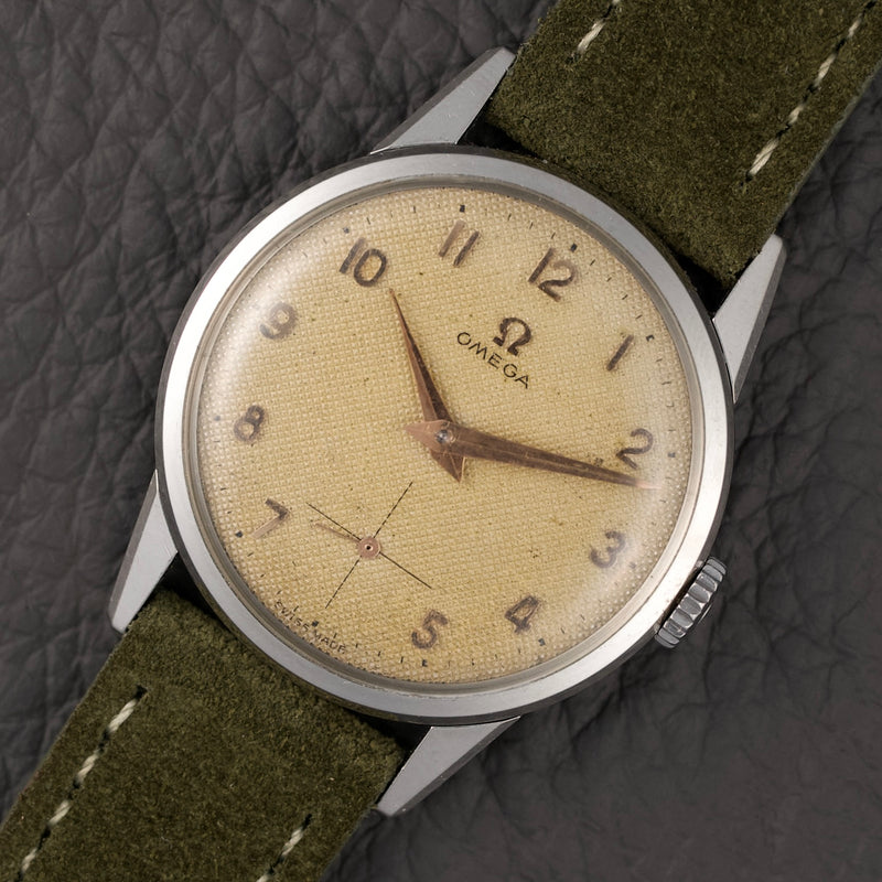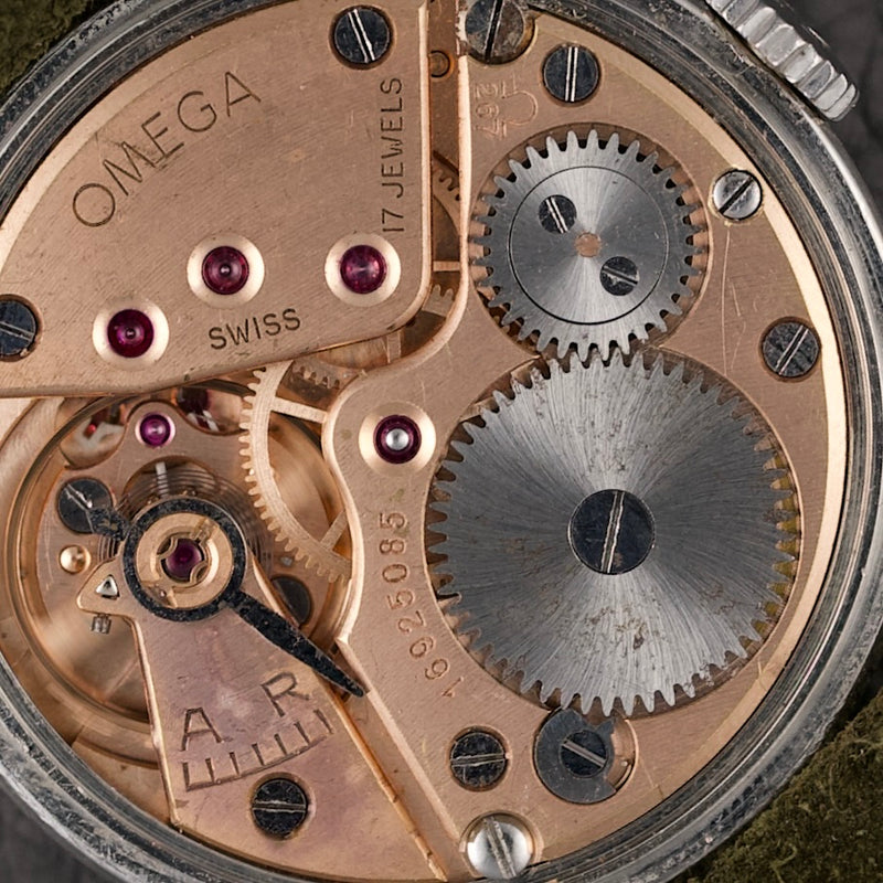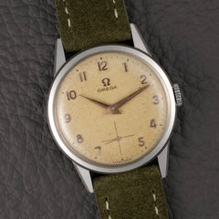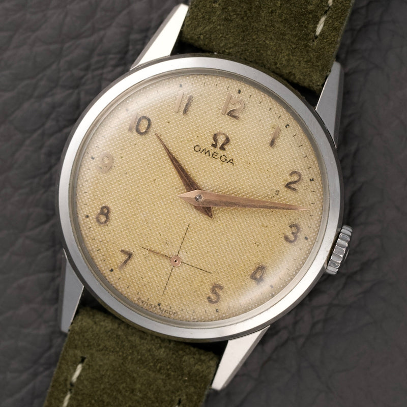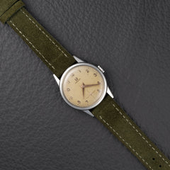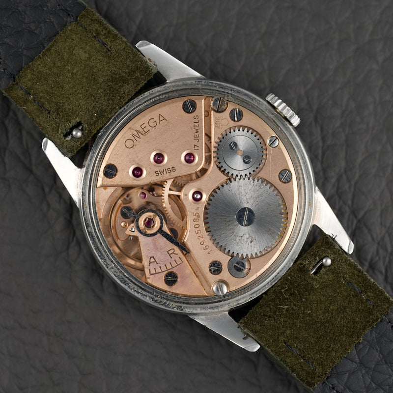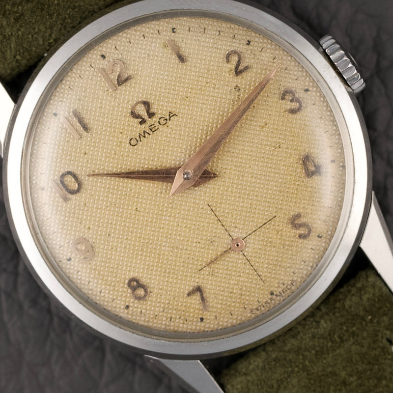 It is equipped with the caliber 267, known for its reliability and small size. It is a mechanical movement of the Omega brand, produced in the 1950s and 1960s. It announces a power reserve of up to 40 hours. This model retains its original Omega crown. The dial is in rather good condition, despite the patina that has been created over time.