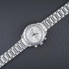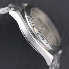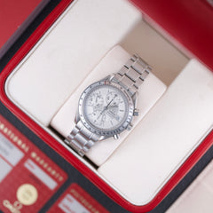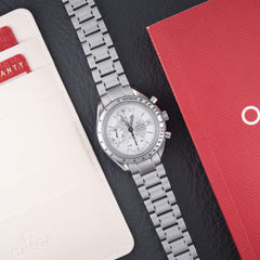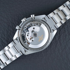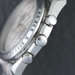 With its 39 mm diameter and 14 mm thickness, it offers an excellent compromise between sportiness and comfort on the wrist. Released in the 1990s, this version incorporates the main features of the Speedmaster: tachymeter bezel, steel case, classic pushers and sapphire crystal, while distinguishing itself by its vertical tricompax silver dial and date window at 3 o'clock.