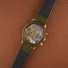 It is powered by a Valjoux 7730 hand-wound chronograph. The service history is unknown. The watch runs smoothly, with all chrono functions functioning as intended.