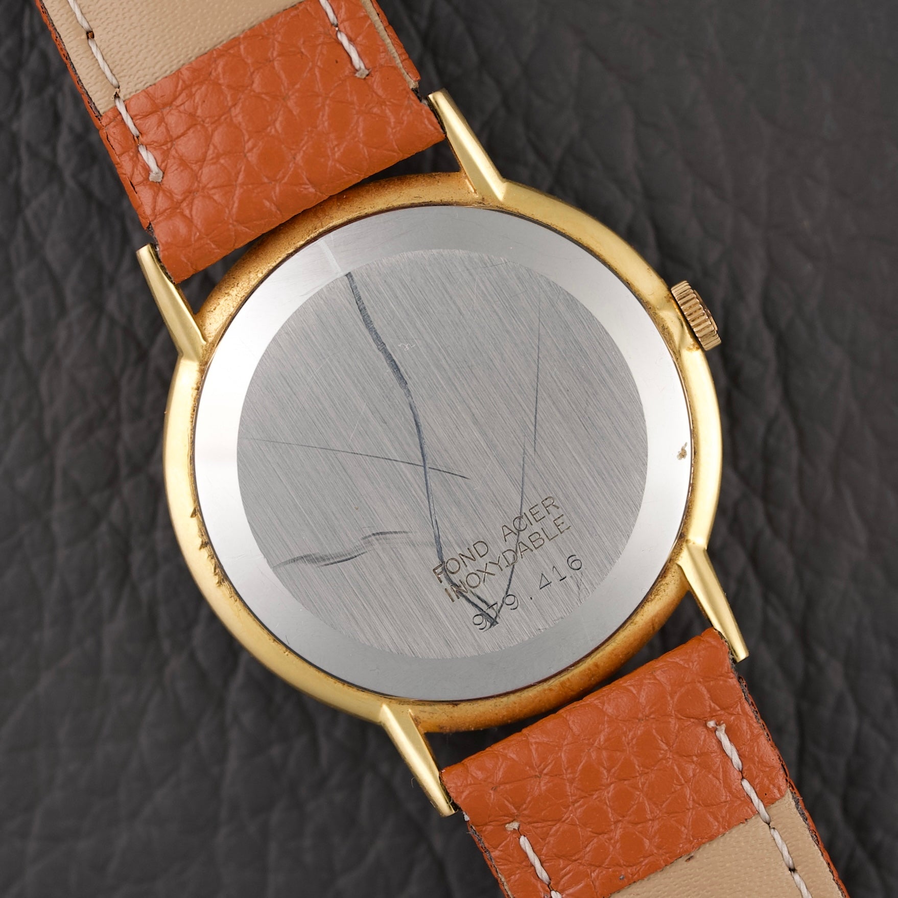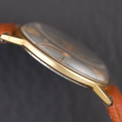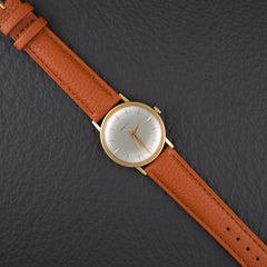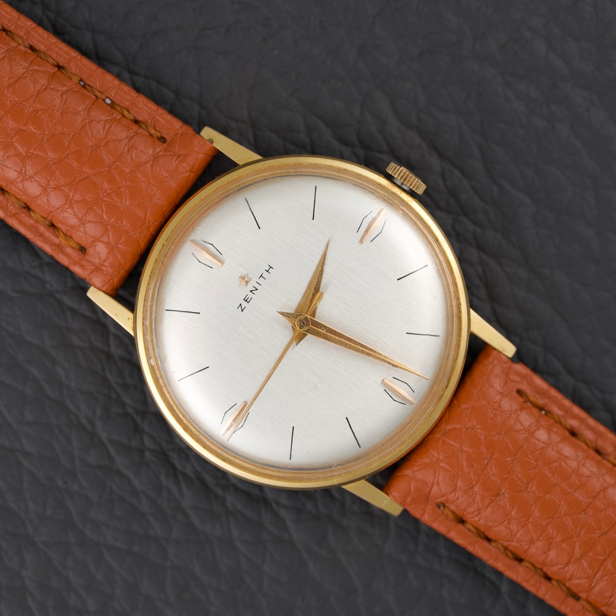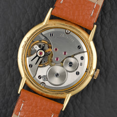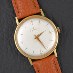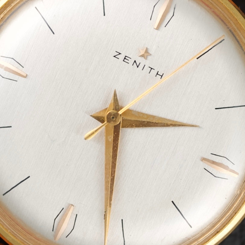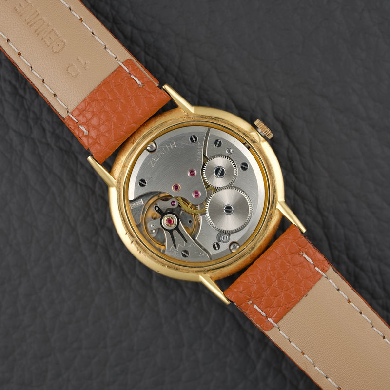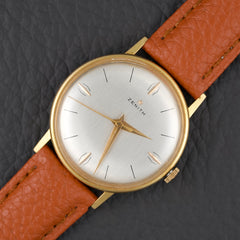 Beautiful dress watch from Zenith dating from the early 1960s. It features a slim 34mm 14k gold-plated (20 microns) case that is only 6mm thick. The dial of this particular example features a beautiful ivory finish with minimalist indexes and Dauphine-style hands also plated in 14k gold. This Zenith is reference 979.416.
