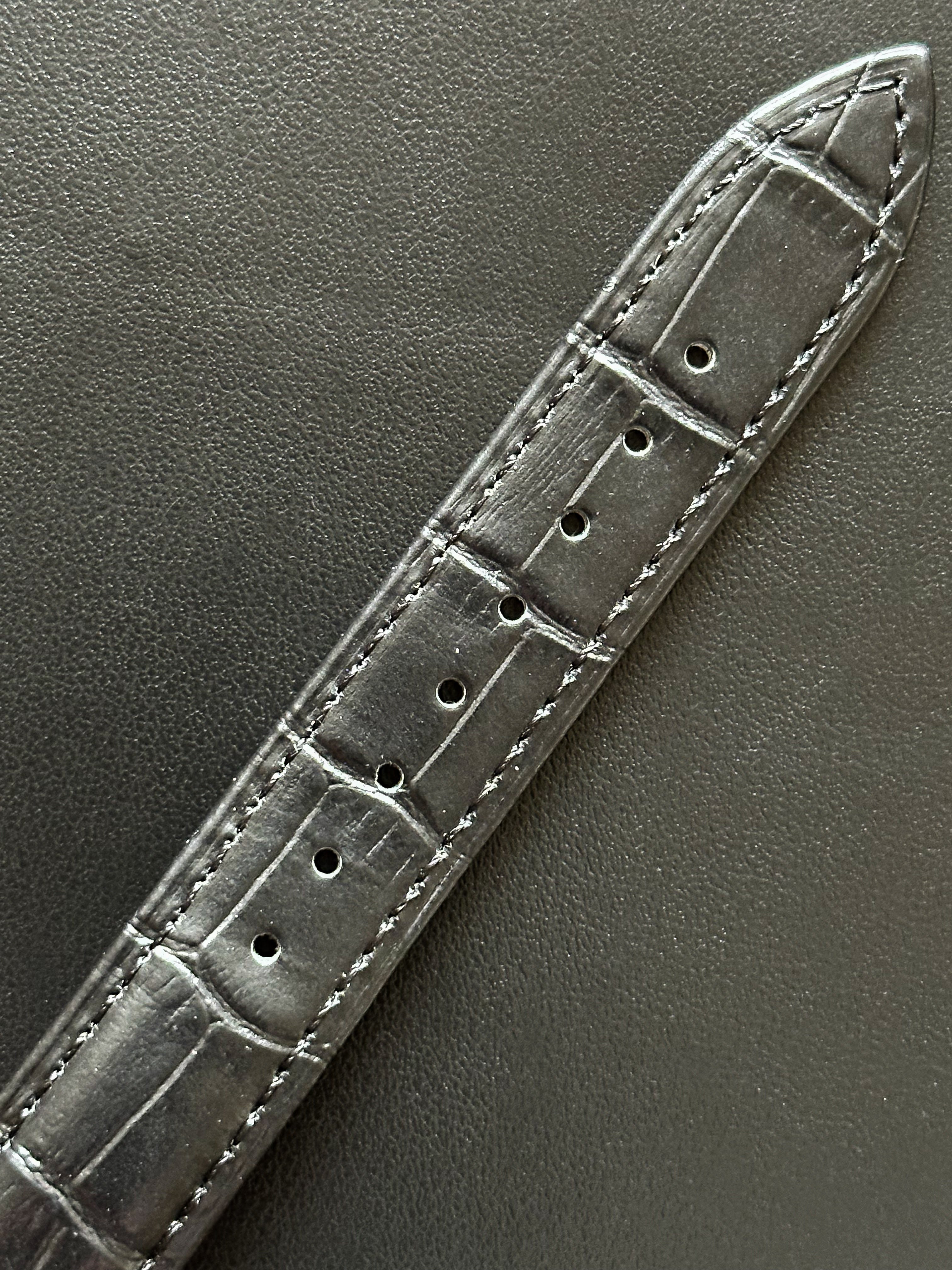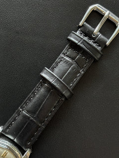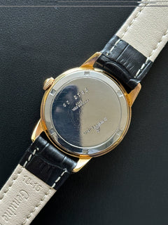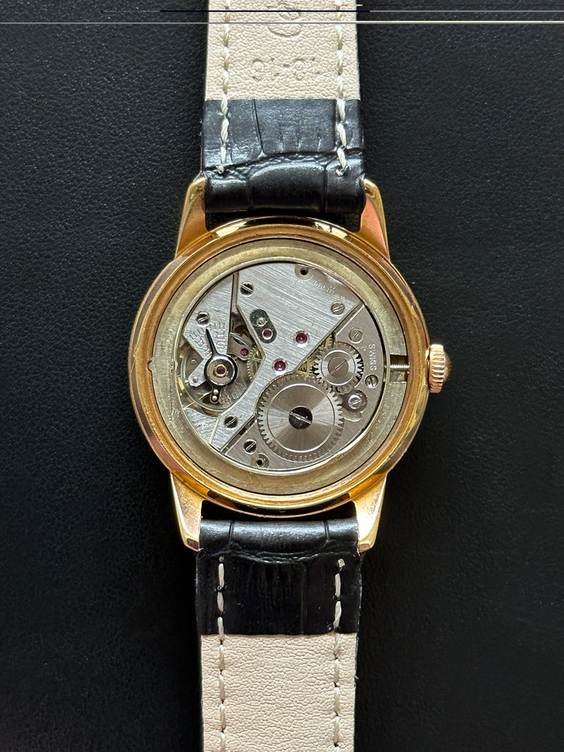 Concernant le boîtier, de légères traces d’utilisation sont présentes et une légère perte du plaquage rose sur les anses. Le cadran est quant à lui dans une belle condition, seule une minime trace noire est visible sur le côté droit. Elle dispose de ses aiguilles, cadran, couronne d’origine et est accompagnée d’un bracelet en cuir noir générique.