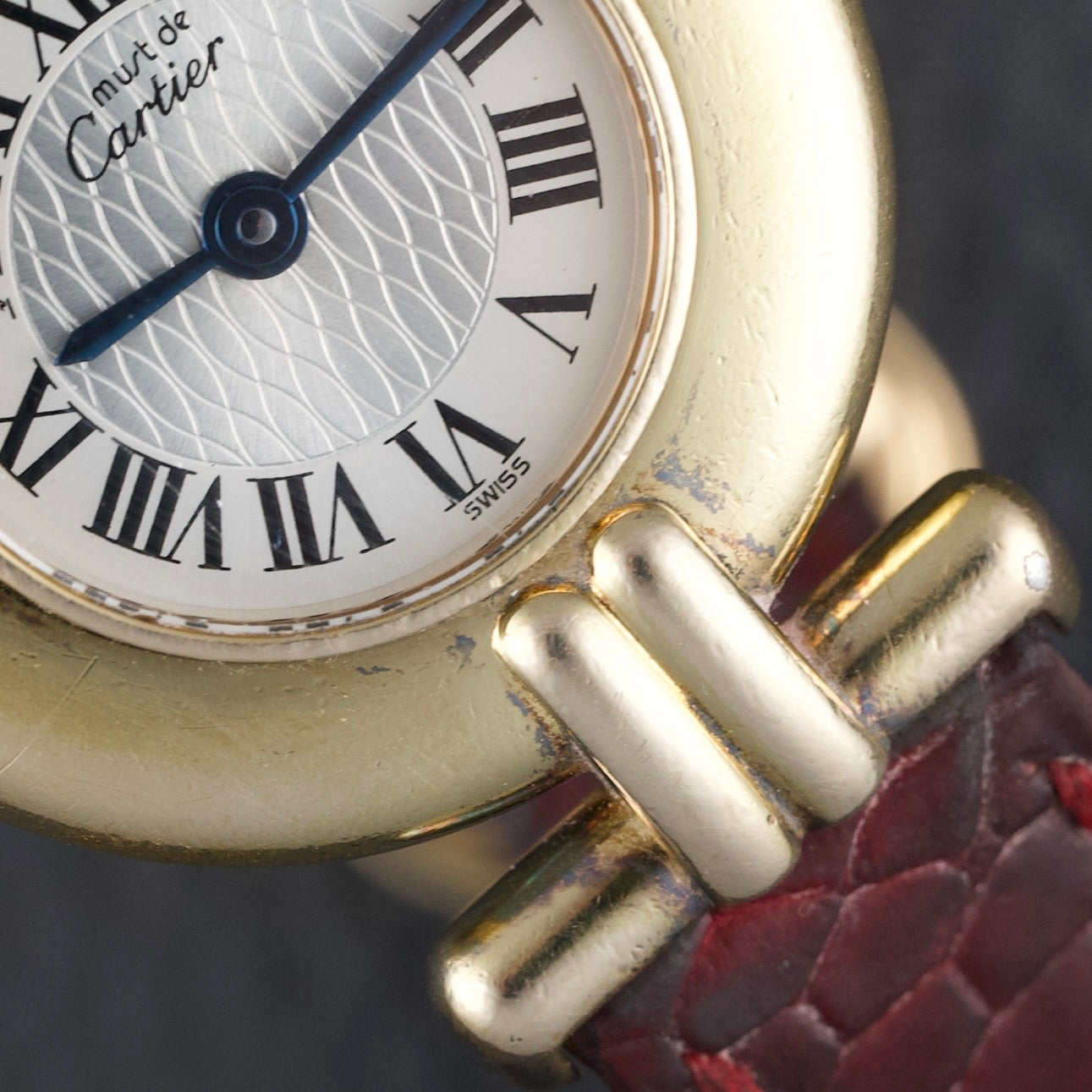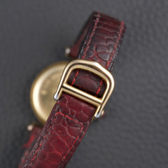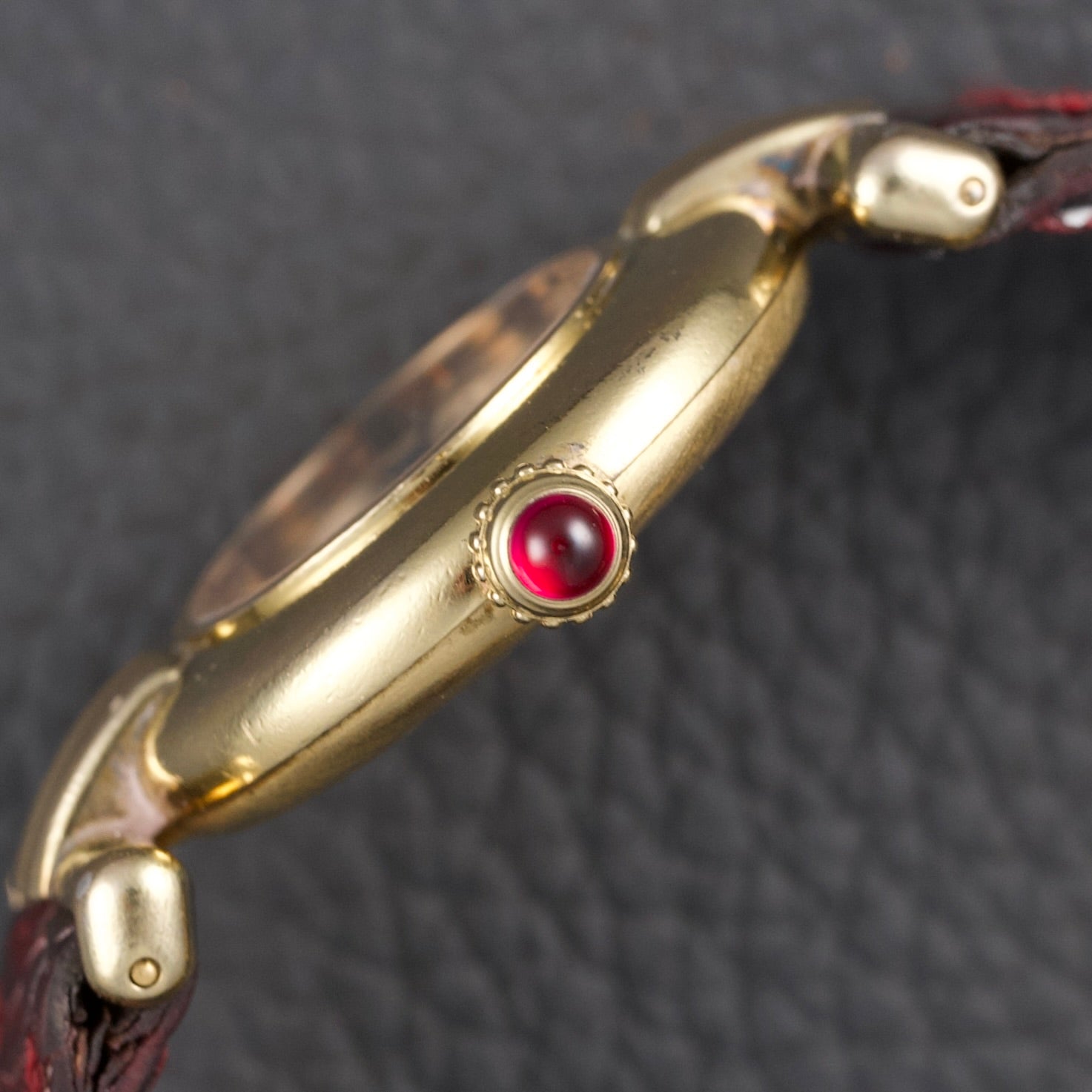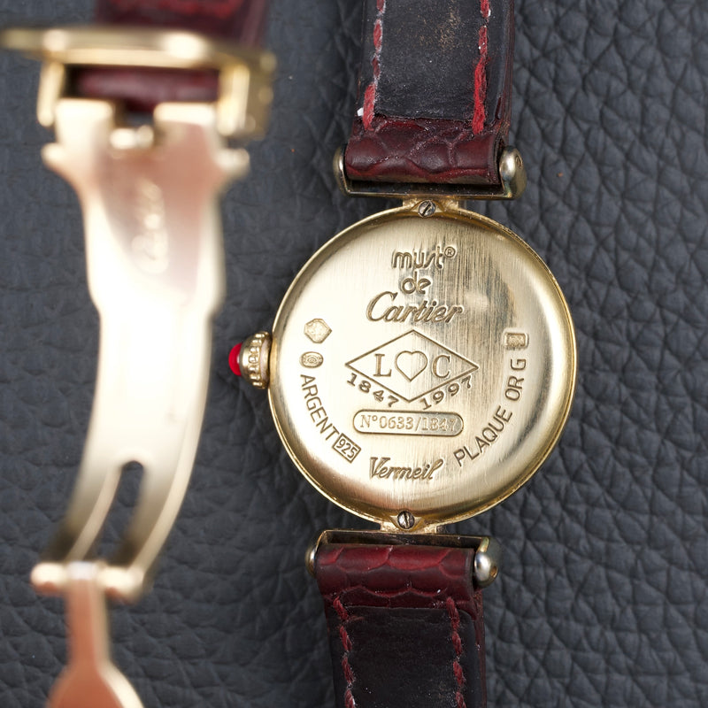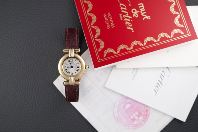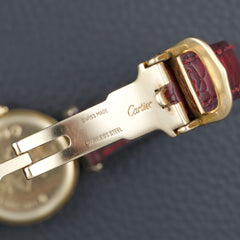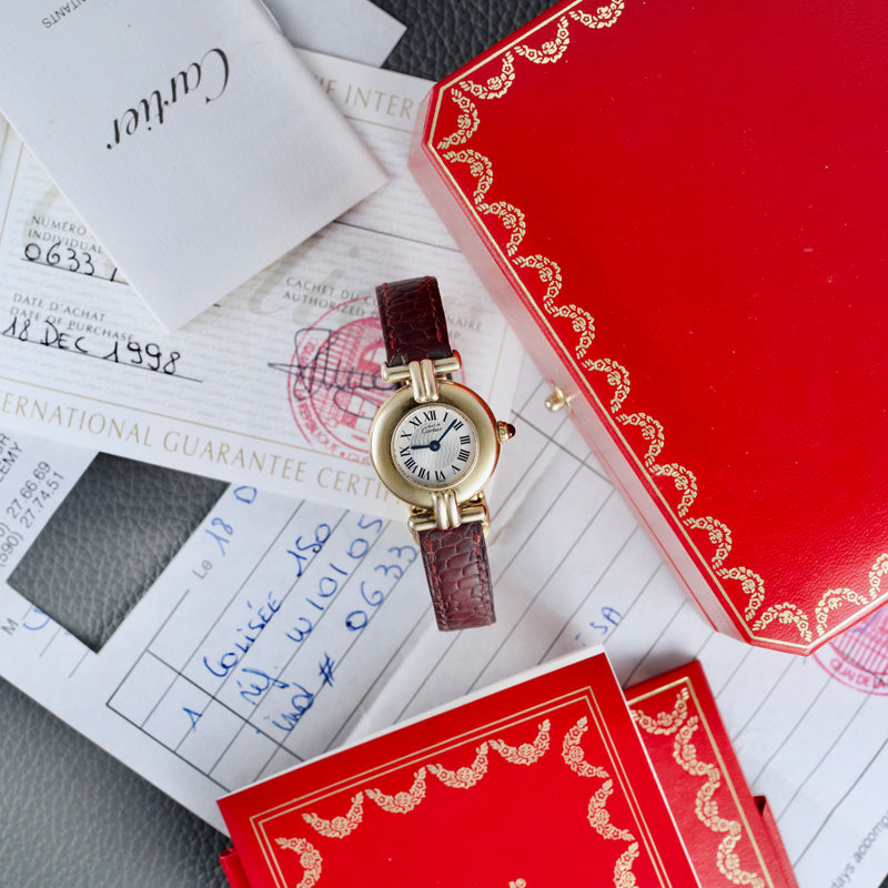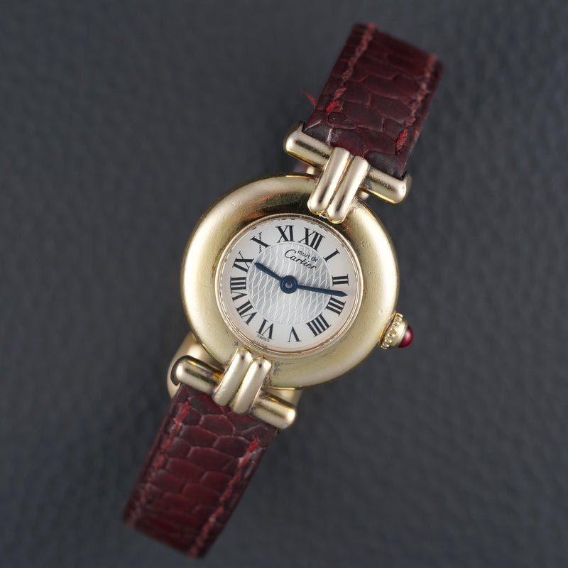 La Colisée se distingue par son boîtier rond aux lignes douces et élégantes, typique du design Cartier des années 90. Réalisé en vermeil (argent massif 925 plaqué or jaune). Le cadran blanc à chiffres romains, associé aux aiguilles bleuies et à la célèbre couronne ornée d’un cabochon spécifiquement rouge ici, signe immédiatement l’identité Cartier.