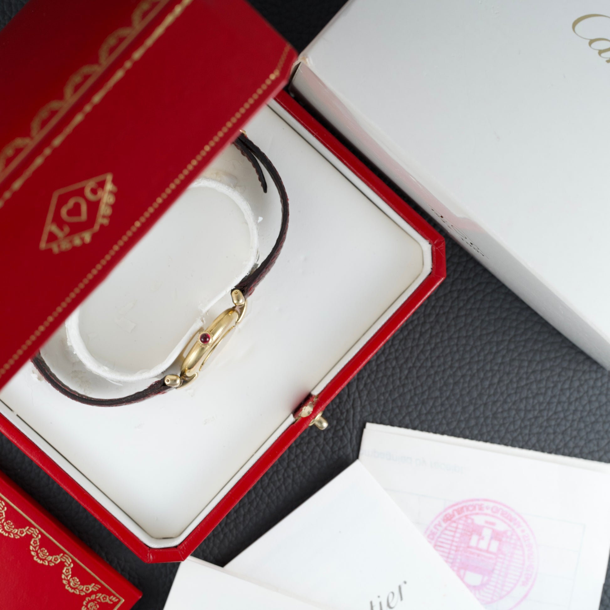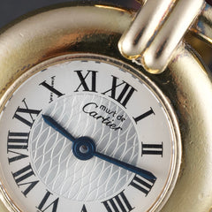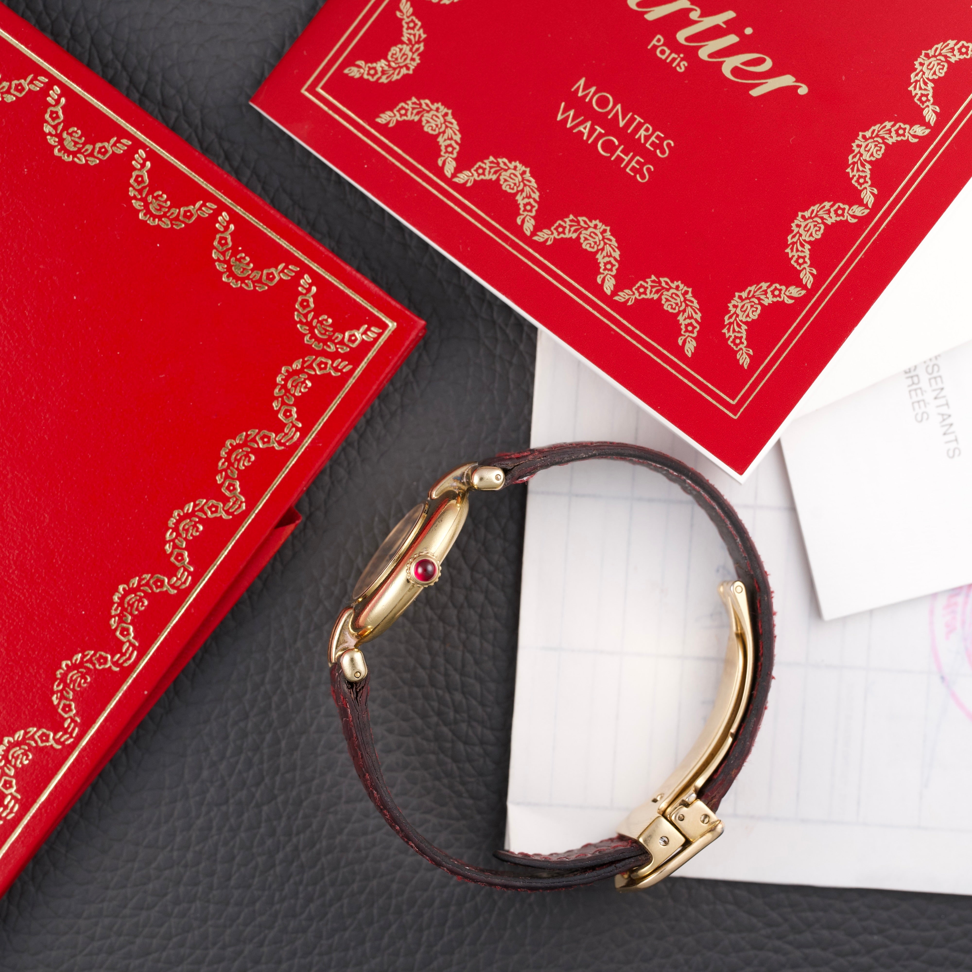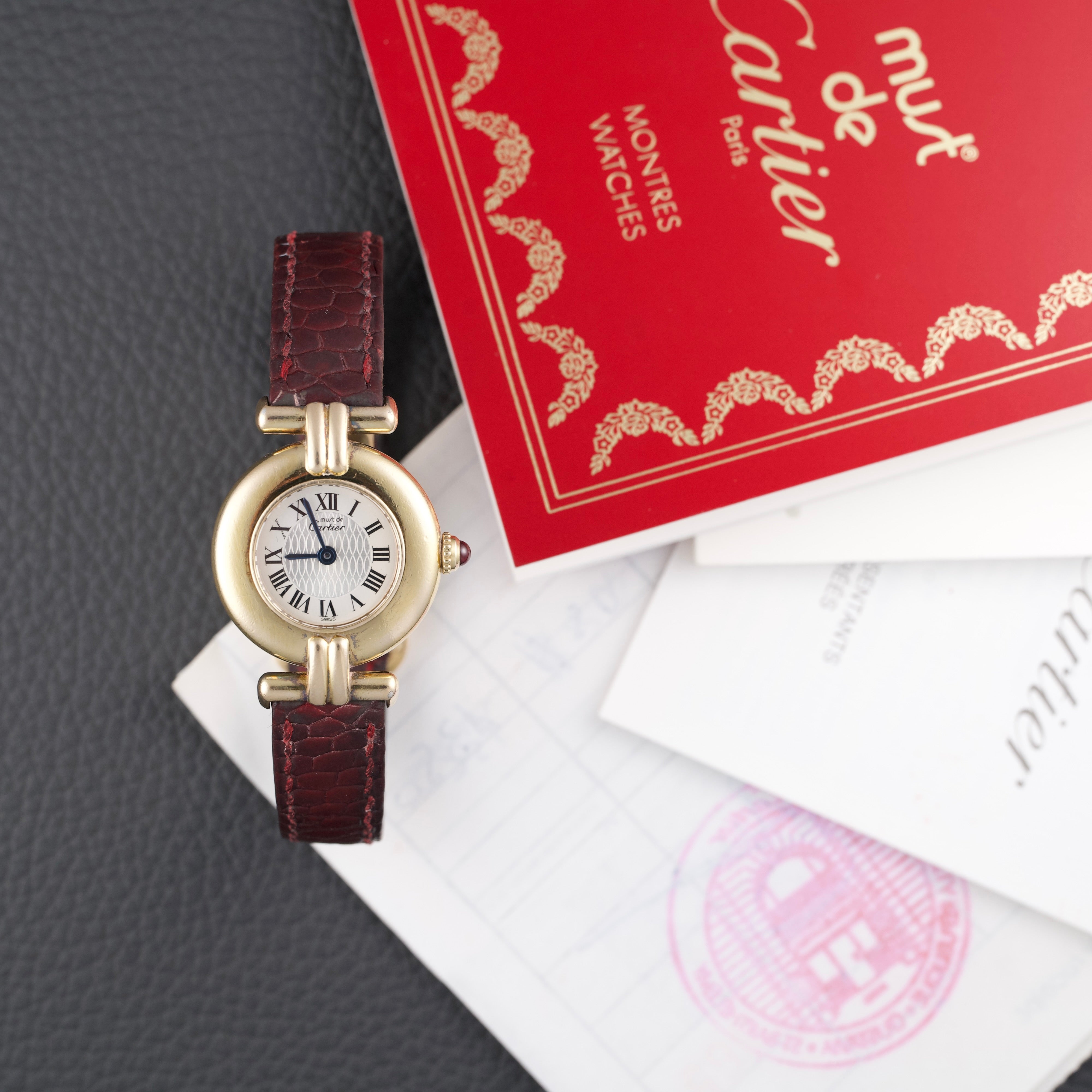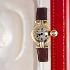 La Colisée se distingue par son boîtier rond aux lignes douces et élégantes, typique du design Cartier des années 90. Réalisé en vermeil (argent massif 925 plaqué or jaune). Le cadran blanc à chiffres romains, associé aux aiguilles bleuies et à la célèbre couronne ornée d’un cabochon spécifiquement rouge ici, signe immédiatement l’identité Cartier.