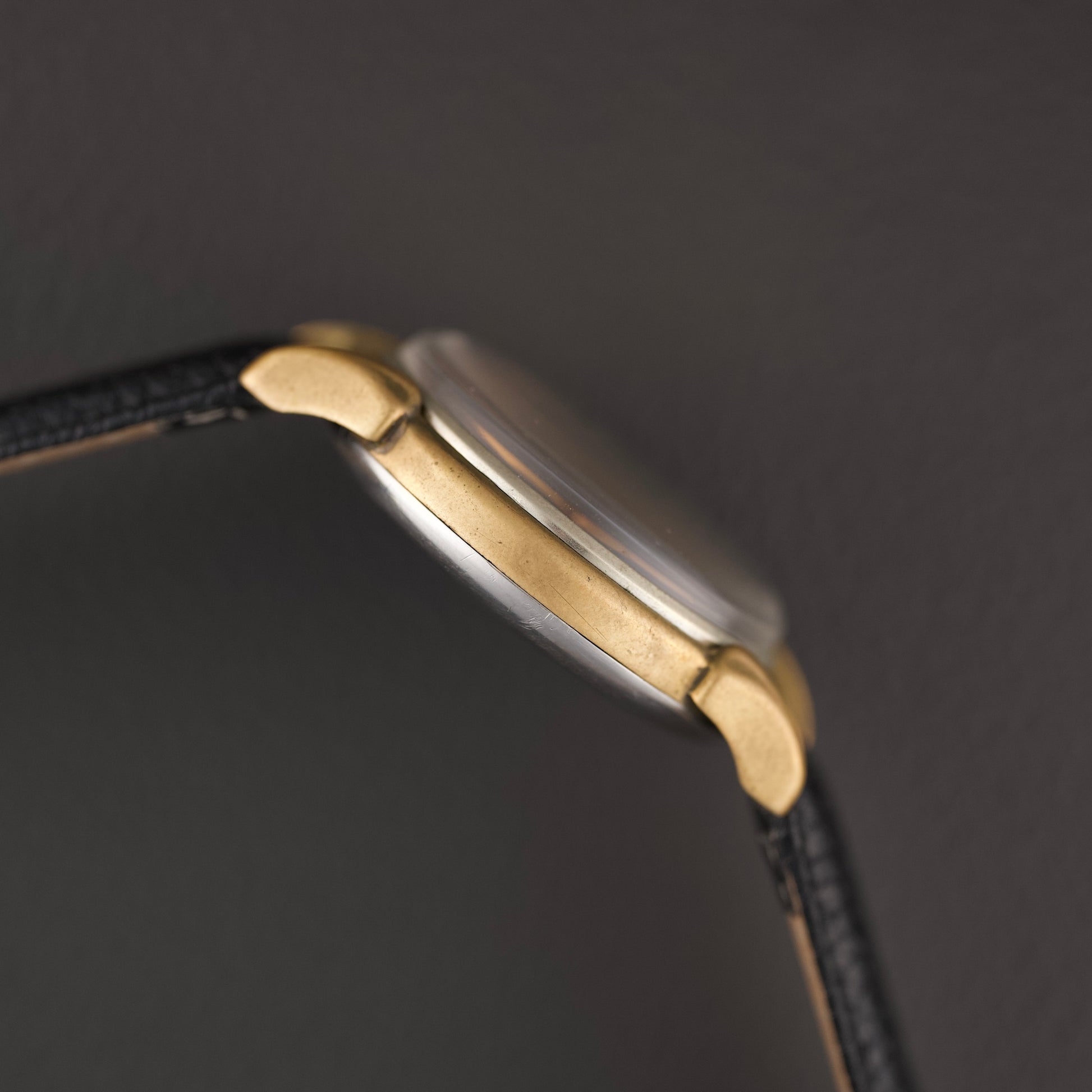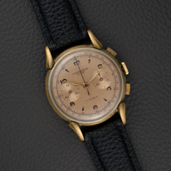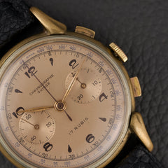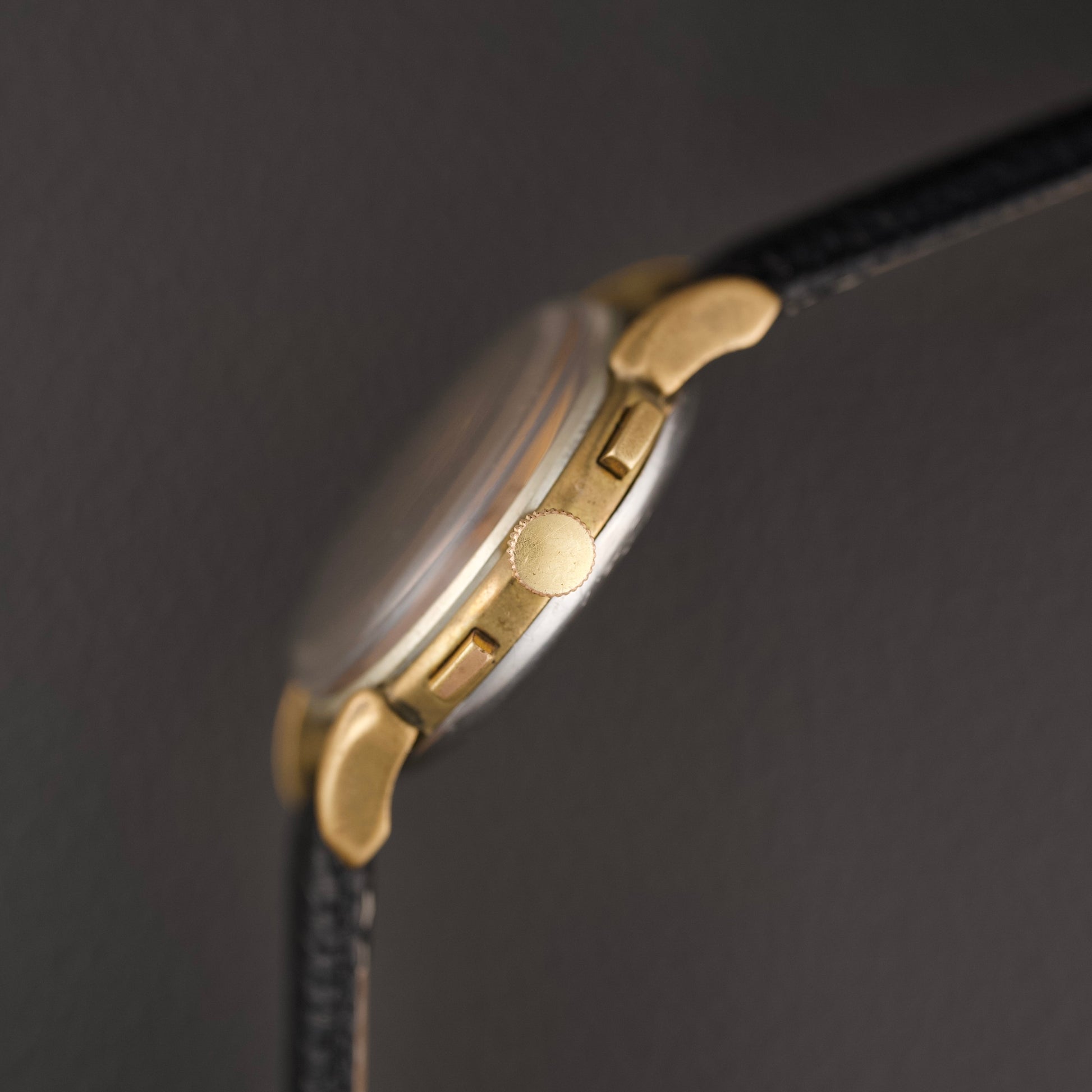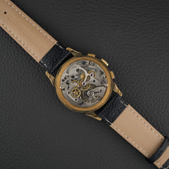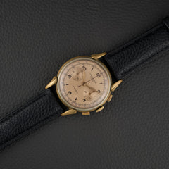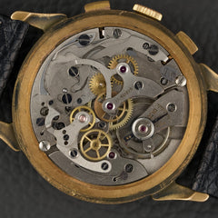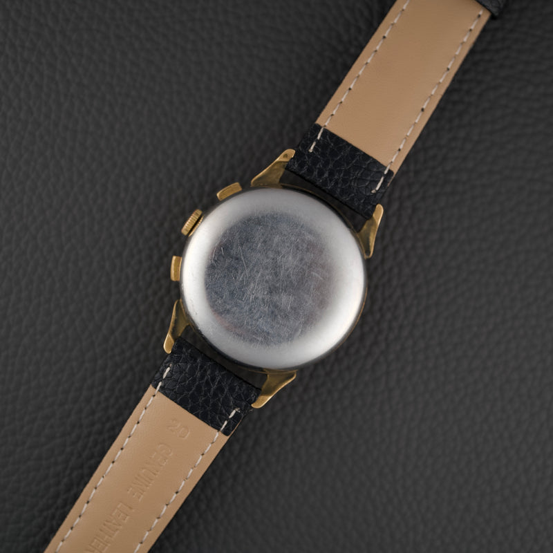 Fabriqué dans les années 1950, il est animé par le calibre Landeron 48. Un mouvement à remontage manuel emblématique de l’époque, réputé pour sa fiabilité et son rôle majeur dans la démocratisation des chronographes. Son boîtier plaqué or jaune de 37 mm de diamètre présente un équilibre idéal au poignet, complété par un cadran d’origine au ton chaleureux, offrant une belle patine homogène et discrète.