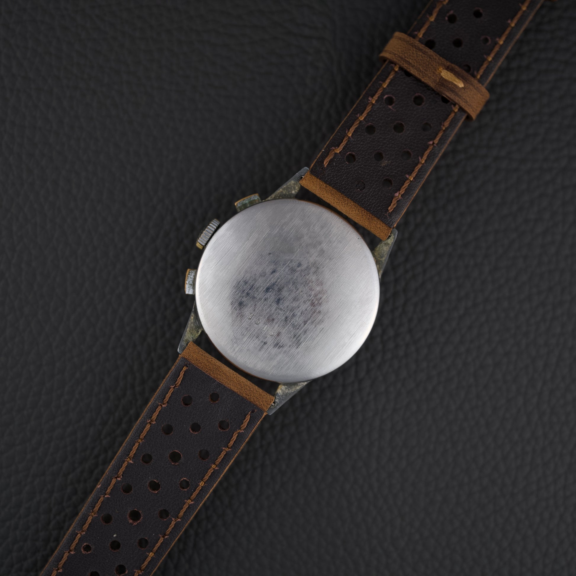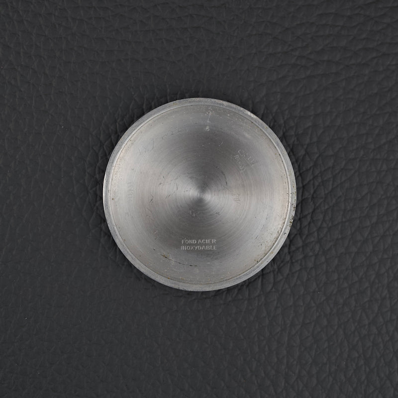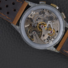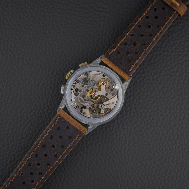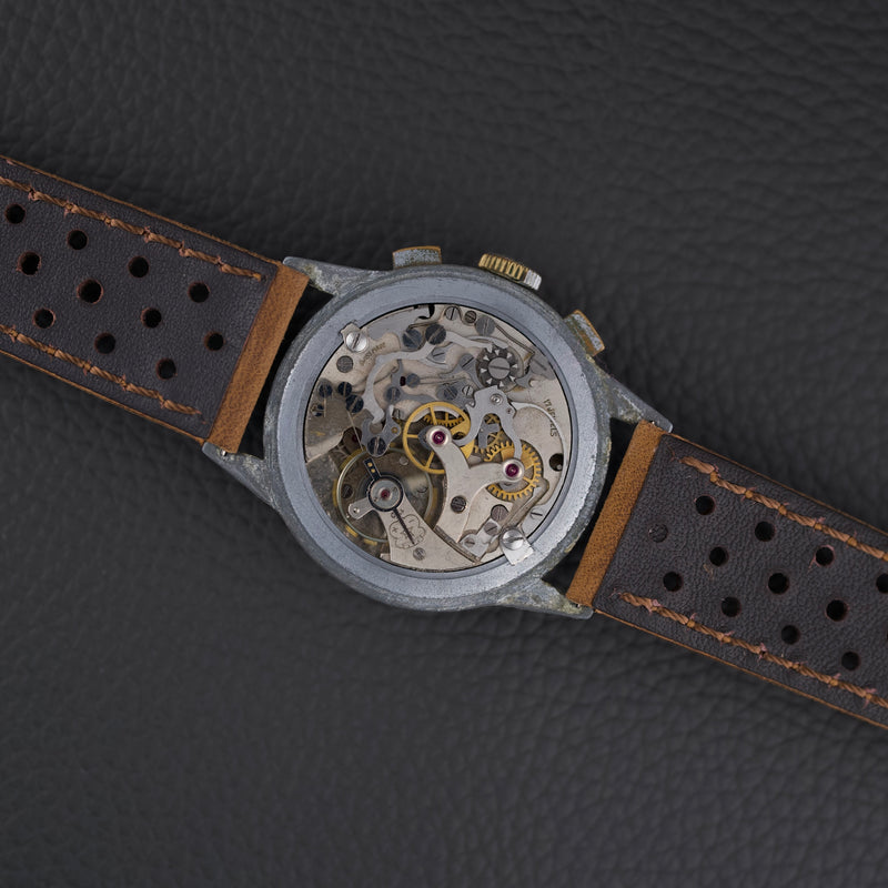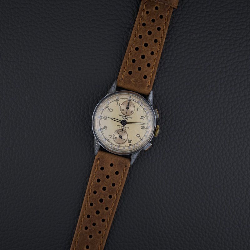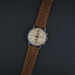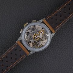 Ce chronographe des années 1950 embarque le calibre Venus 170, un chronographe à roue à colonnes à remontage manuel, reconnu pour sa robustesse. Le cadran d’origine arbore une patine homogène et chaleureuse. Le boîtier chromé de 36 mm présente de nombreuses traces d’usage, mais conserve une belle présence au poignet.
