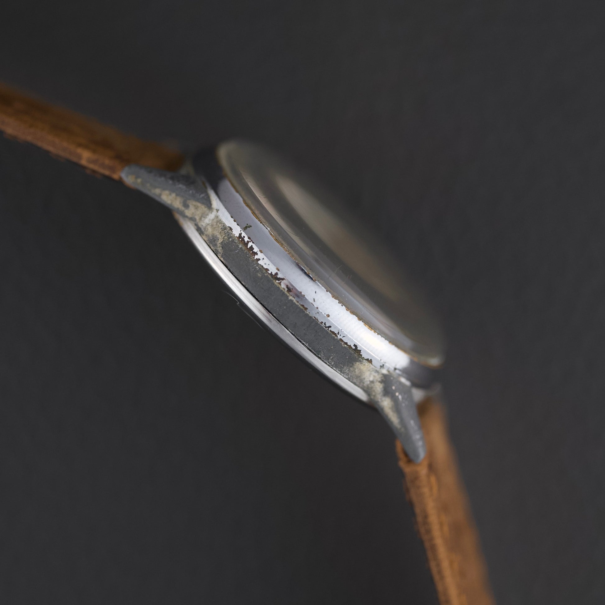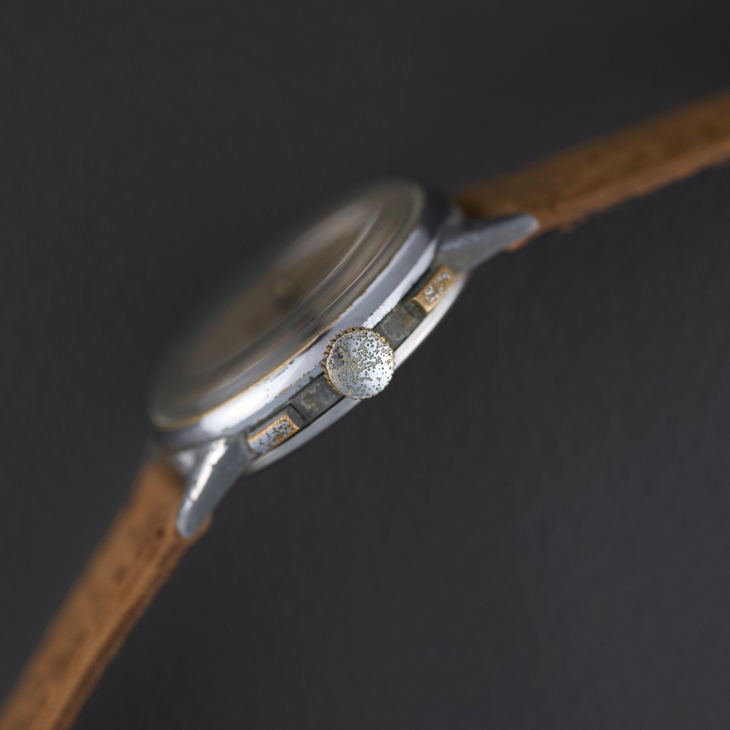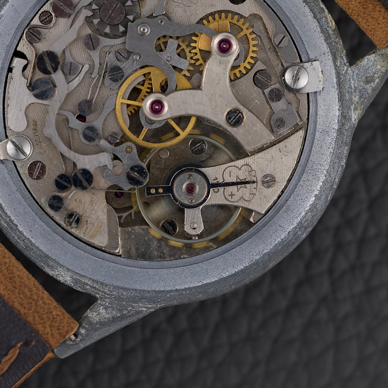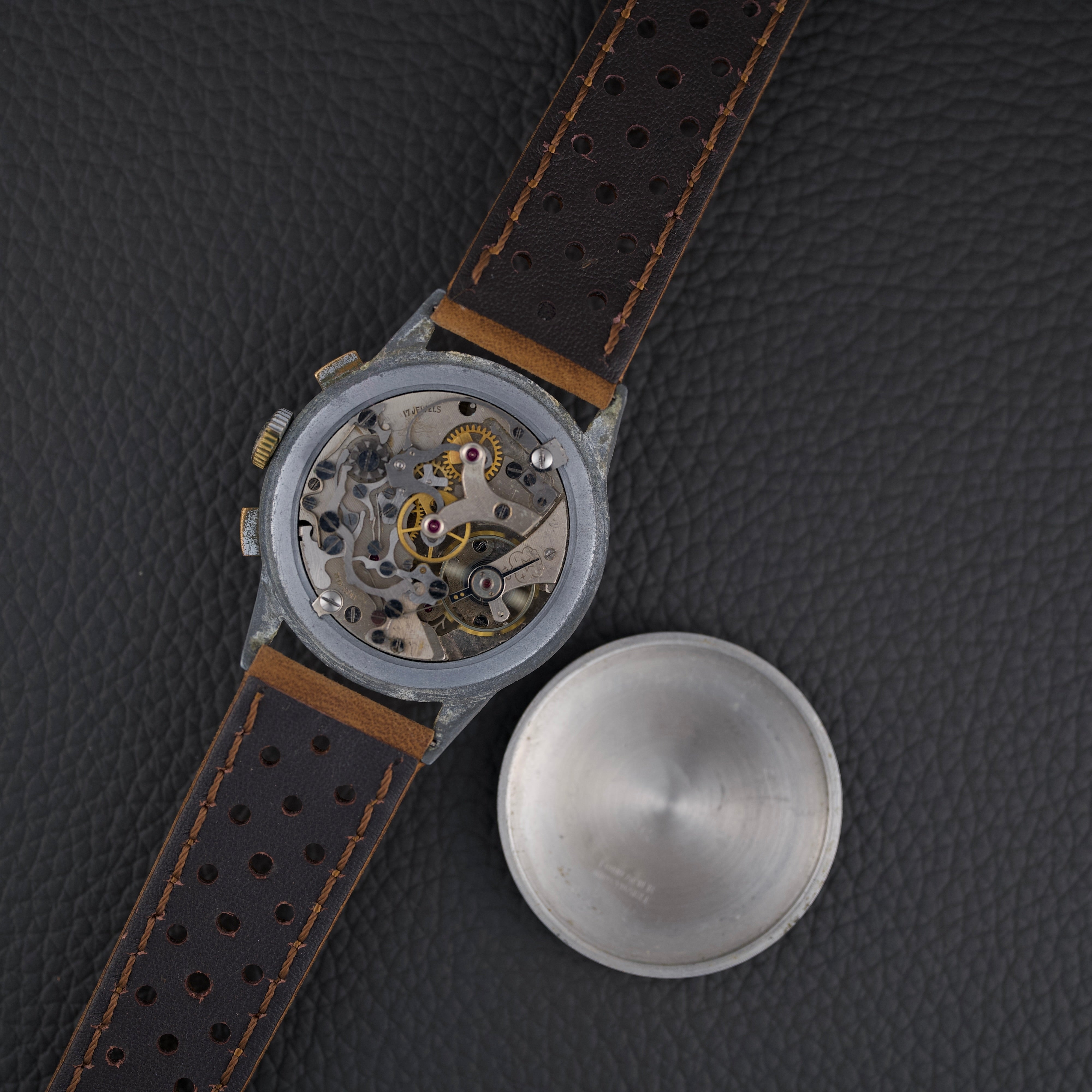 Ce chronographe des années 1950 embarque le calibre Venus 170, un chronographe à roue à colonnes à remontage manuel, reconnu pour sa robustesse. Le cadran d’origine arbore une patine homogène et chaleureuse. Le boîtier chromé de 36 mm présente de nombreuses traces d’usage, mais conserve une belle présence au poignet.