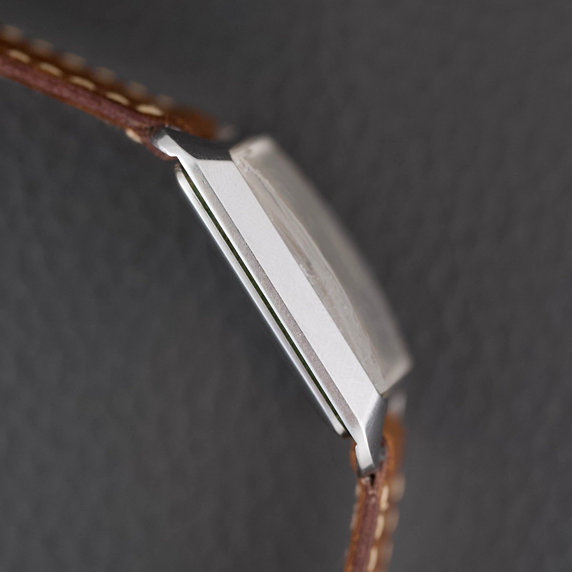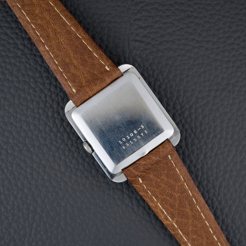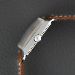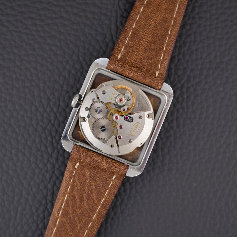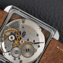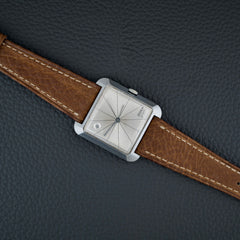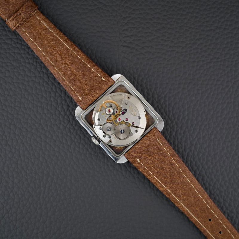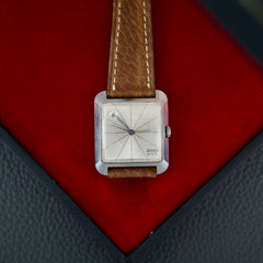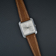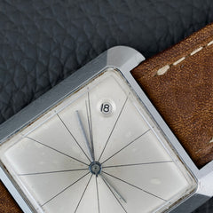Cette montre incarne un véritable tournant esthétique pour l’époque, avec un design inspiré du mouvement Bauhaus et de l’architecture moderniste du milieu du XXe siècle. Notre exemplaire est dans un bel état de conservation (légèrement patiné) et vient accompagné de sa boîte d’oigne.