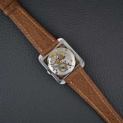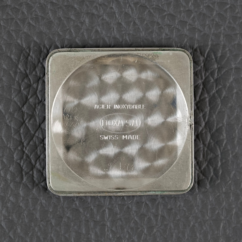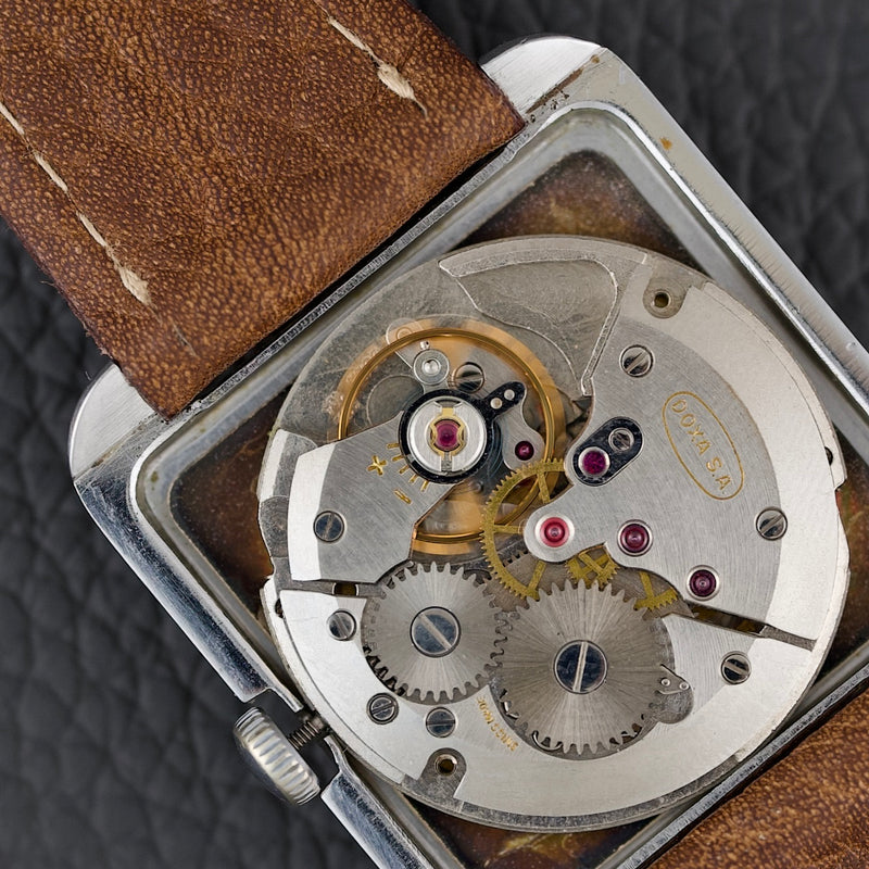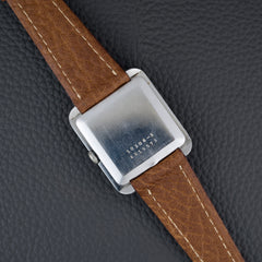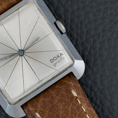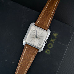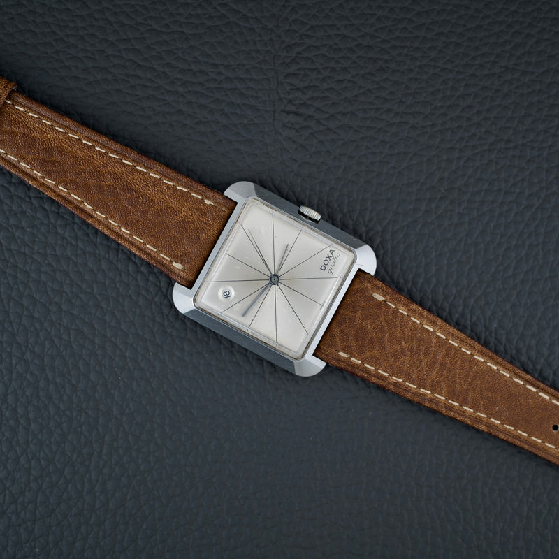 Son boîtier rectangulaire en acier, discret et élégant, est mis en valeur par une couronne intégrée dans la carrure. Le cadran épuré, avec ses croisillons géométriques (crosshair dial) et ses index stylisés, incarne l’élégance sobre de la modernité naissante. Cette pièce est alimentée par le calibre Doxa 104, sur base de A. Shild 1130.