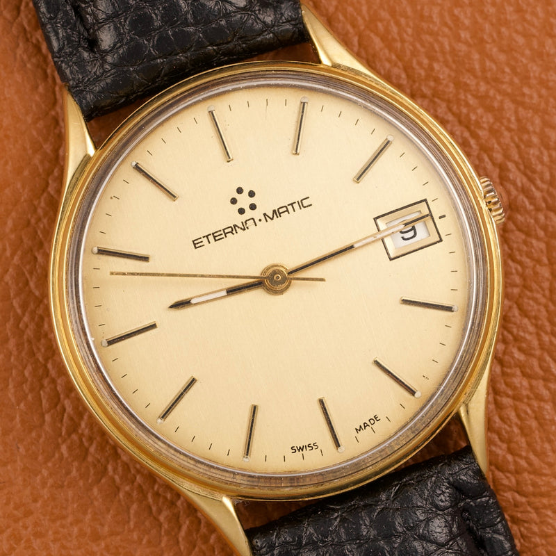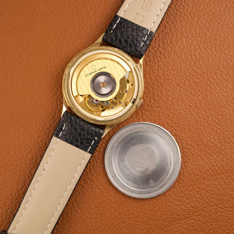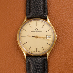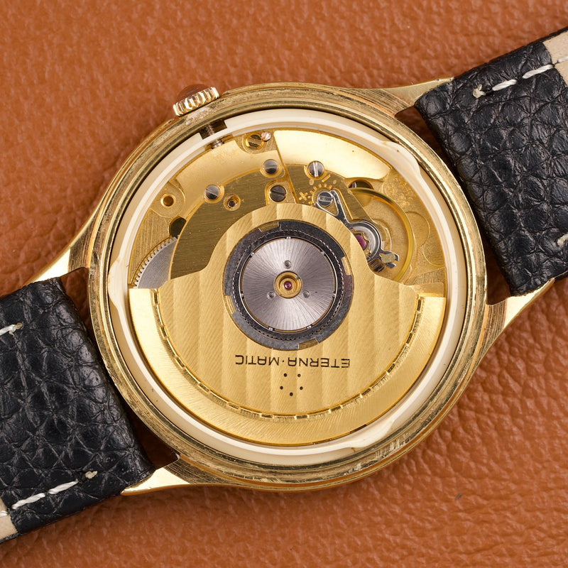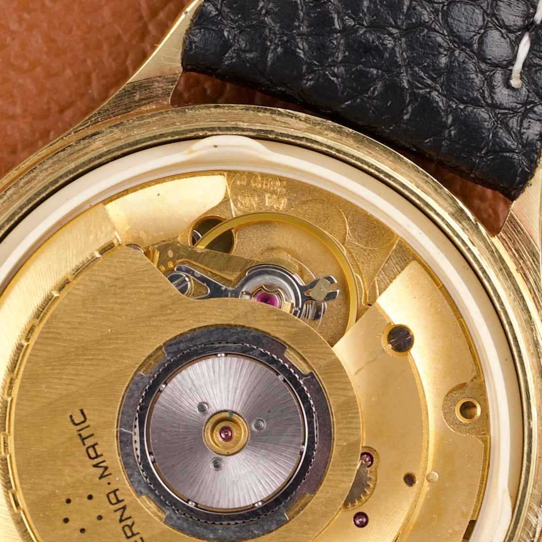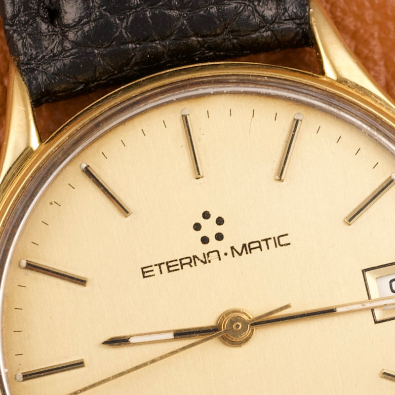 Cette Eterna-Matic référence 13405, produite dans les années 1980, est animée par le réputé calibre ETA 2892-2, ici plaqué en or jaune. Ce mouvement automatique est reconnu pour sa grande finesse, sa précision et sa robustesse, et il servira par la suite de base à de nombreux calibres haut de gamme chez d’autres manufactures suisses.