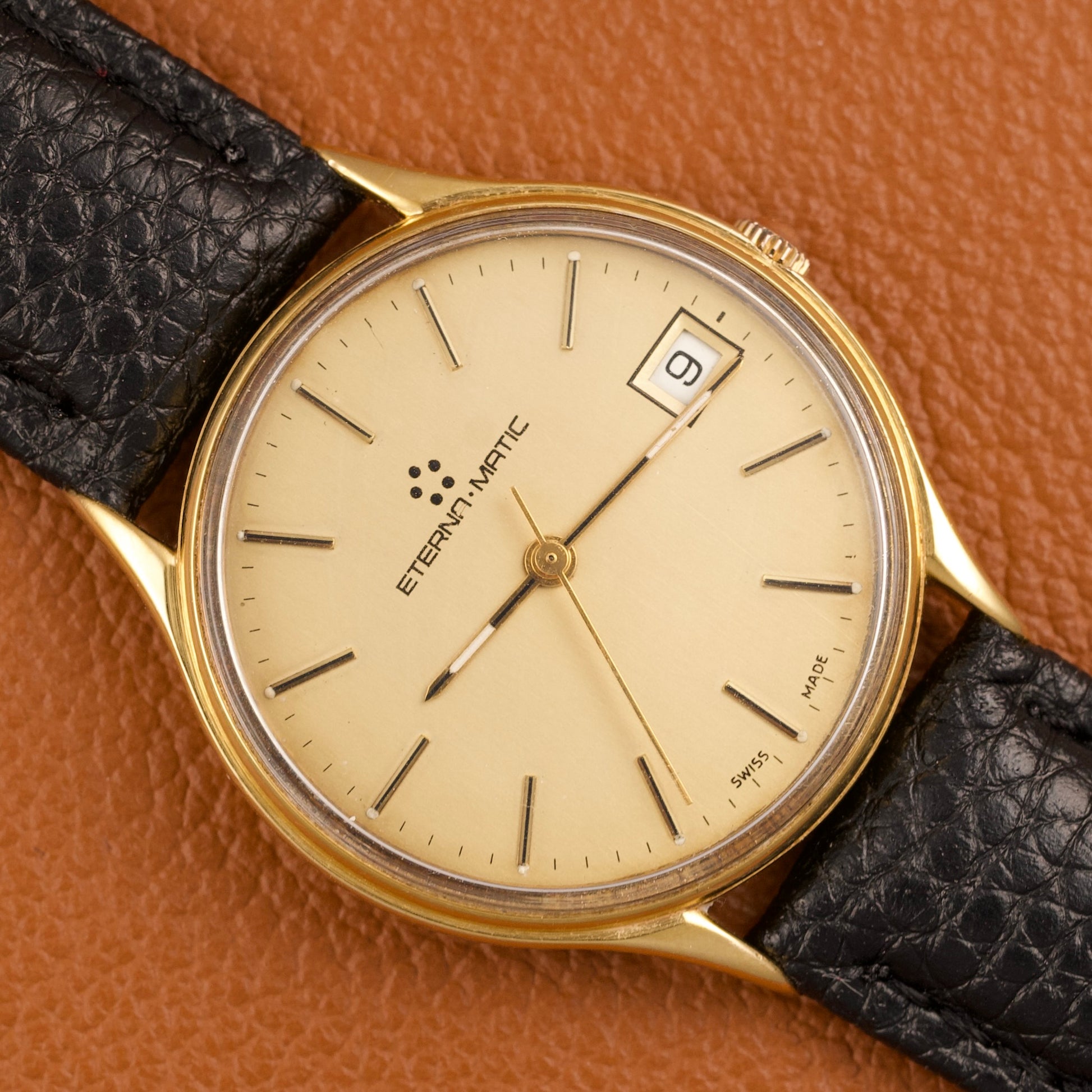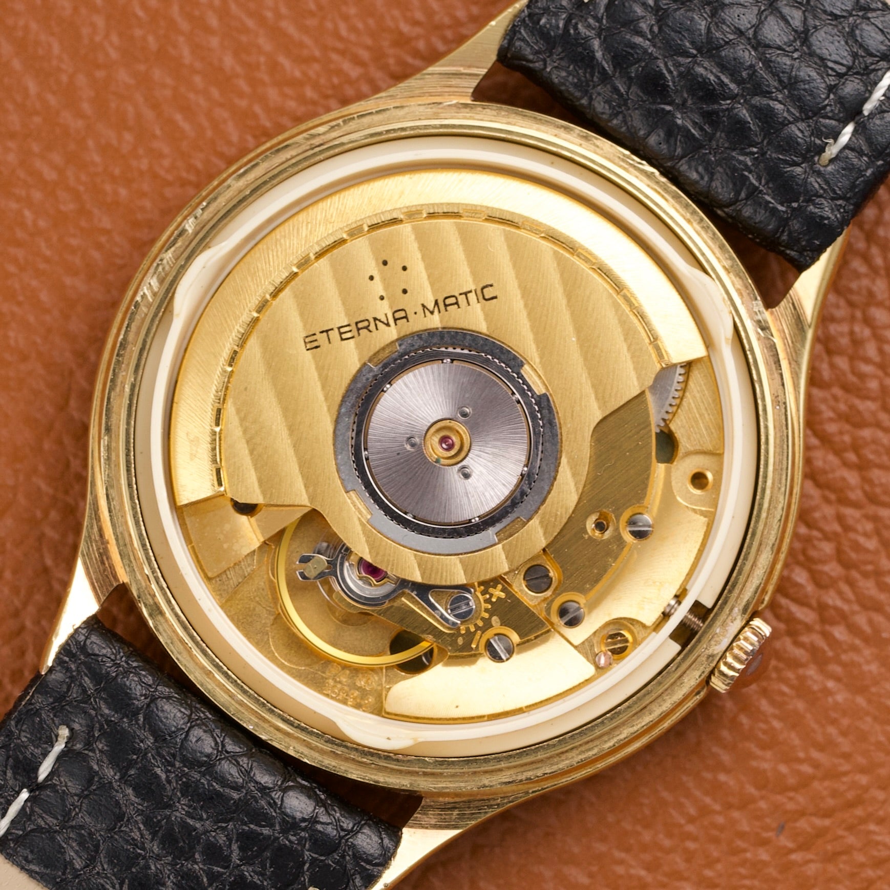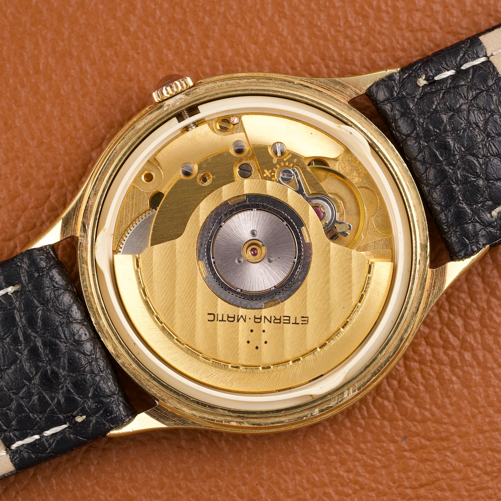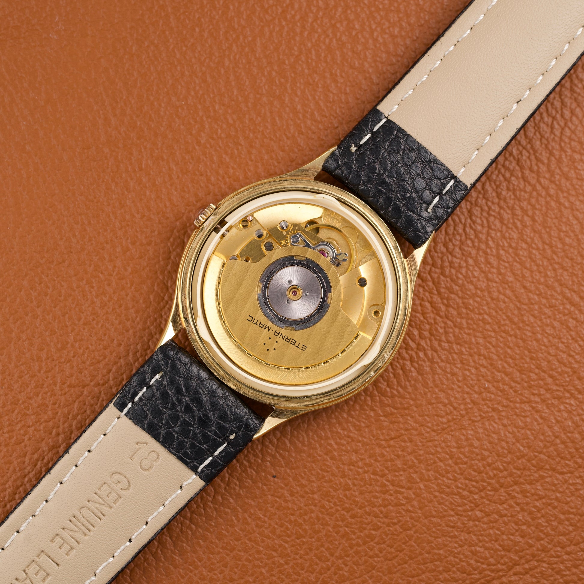 Cette Eterna-Matic référence 13405, produite dans les années 1980, est animée par le réputé calibre ETA 2892-2, ici plaqué en or jaune. Ce mouvement automatique est reconnu pour sa grande finesse, sa précision et sa robustesse, et il servira par la suite de base à de nombreux calibres haut de gamme chez d’autres manufactures suisses.