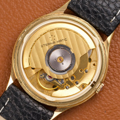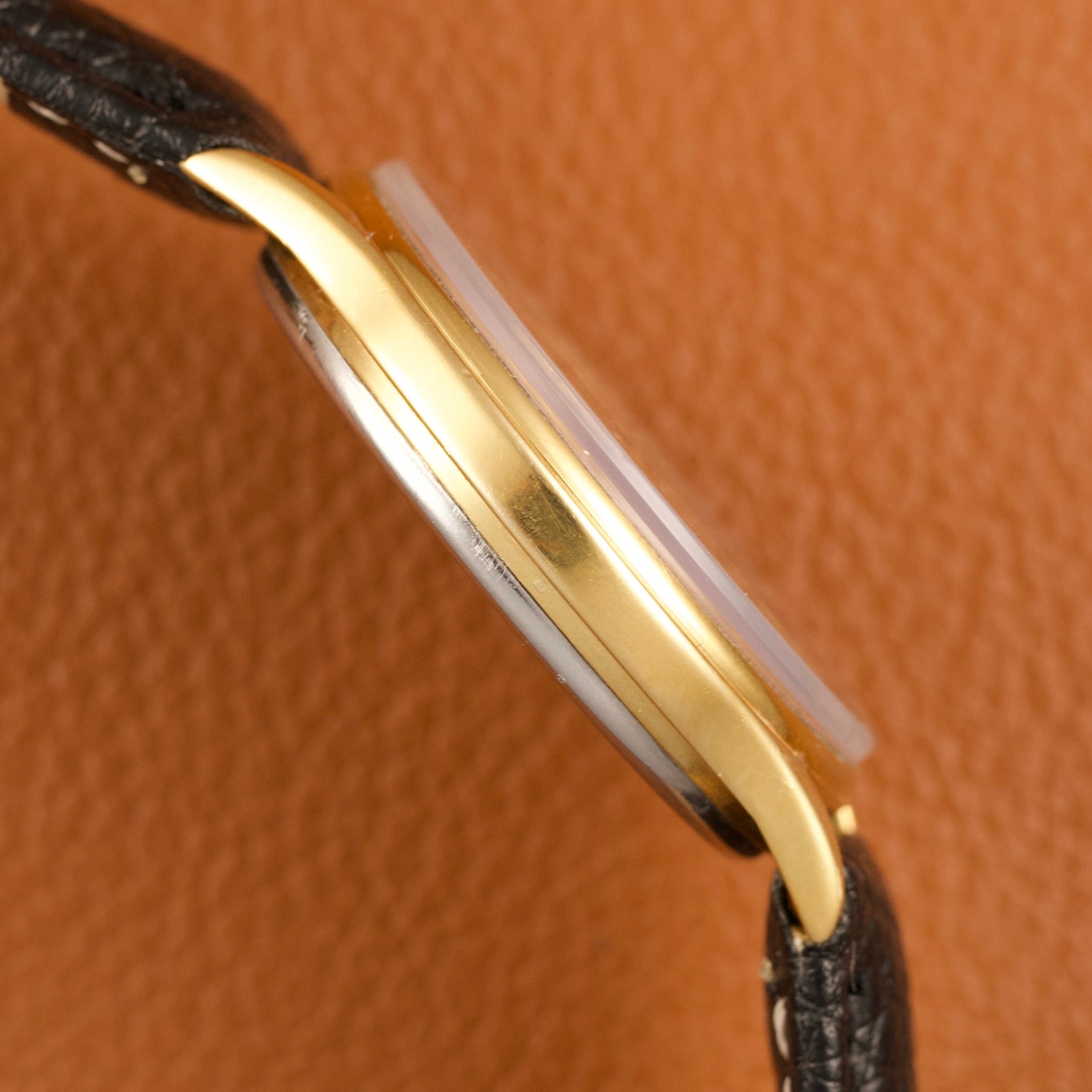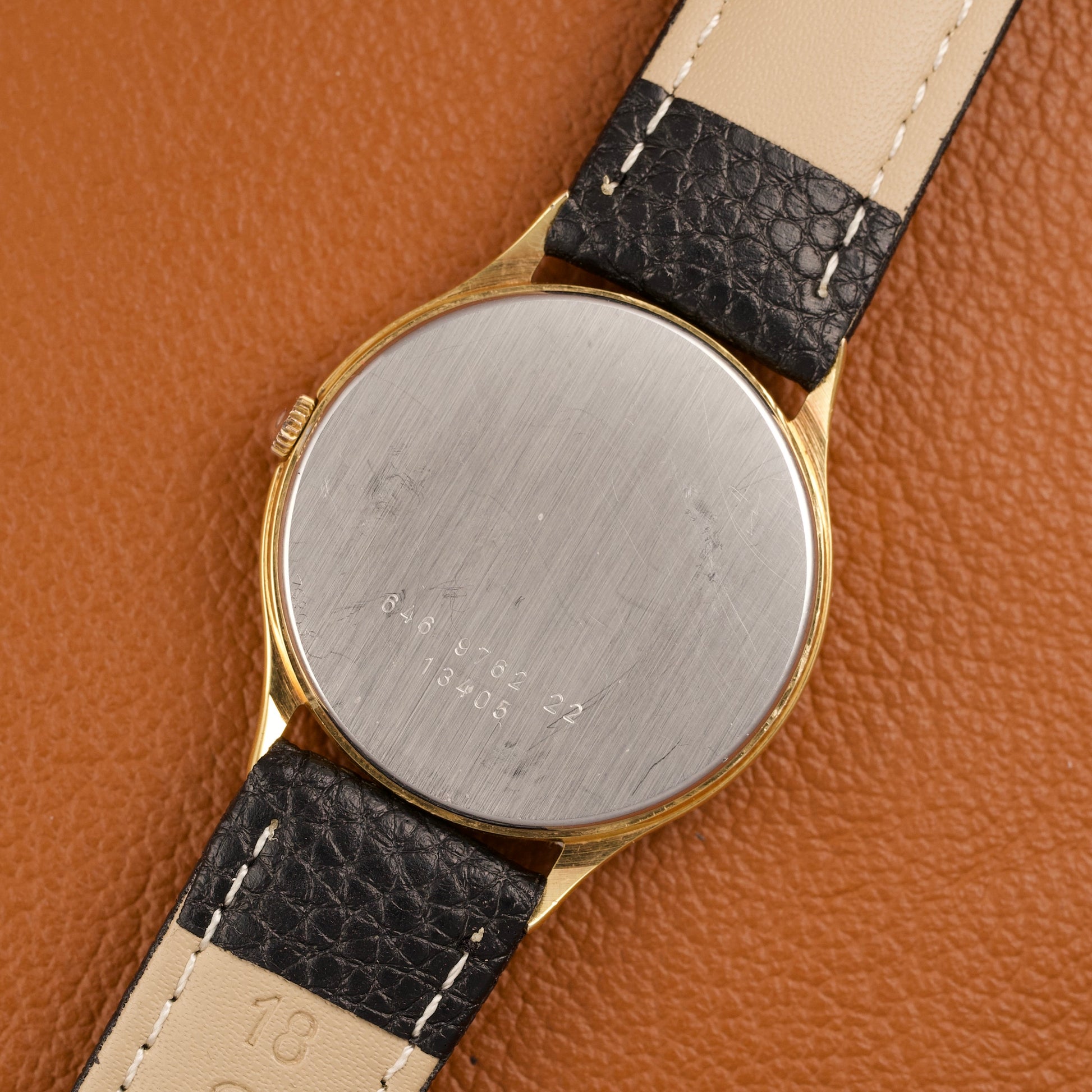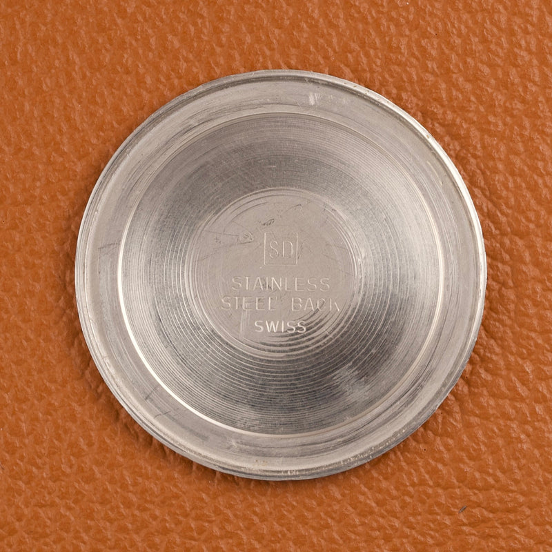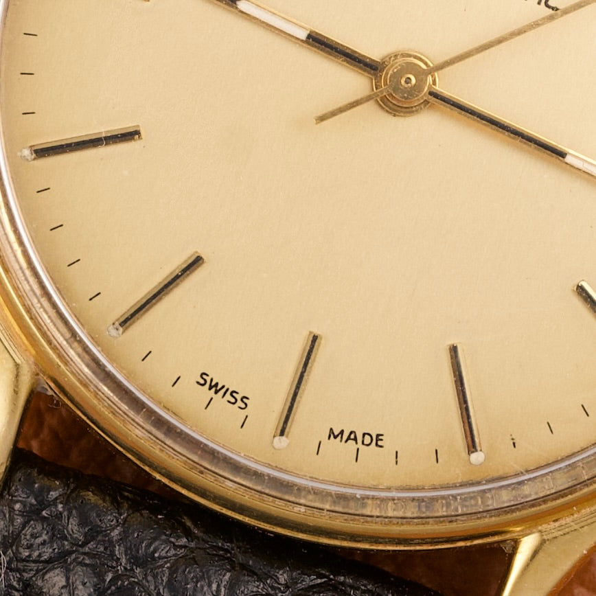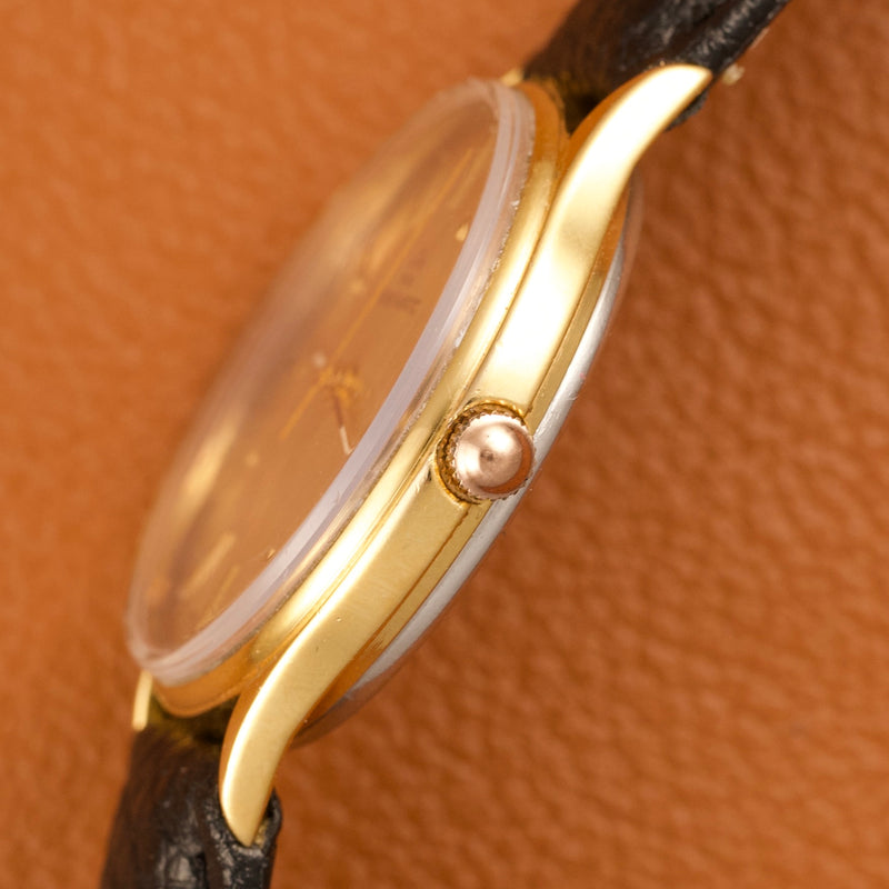 Le boîtier de 33mm, en acier inoxydable plaqué or jaune 20 microns, présente des proportions classiques et équilibrées, parfaitement adaptées à une montre élégante et discrète. Il encadre un cadran champagne d’origine, jamais retouché, offrant une lecture claire et une esthétique sobre, caractéristique des montres habillées de cette époque.