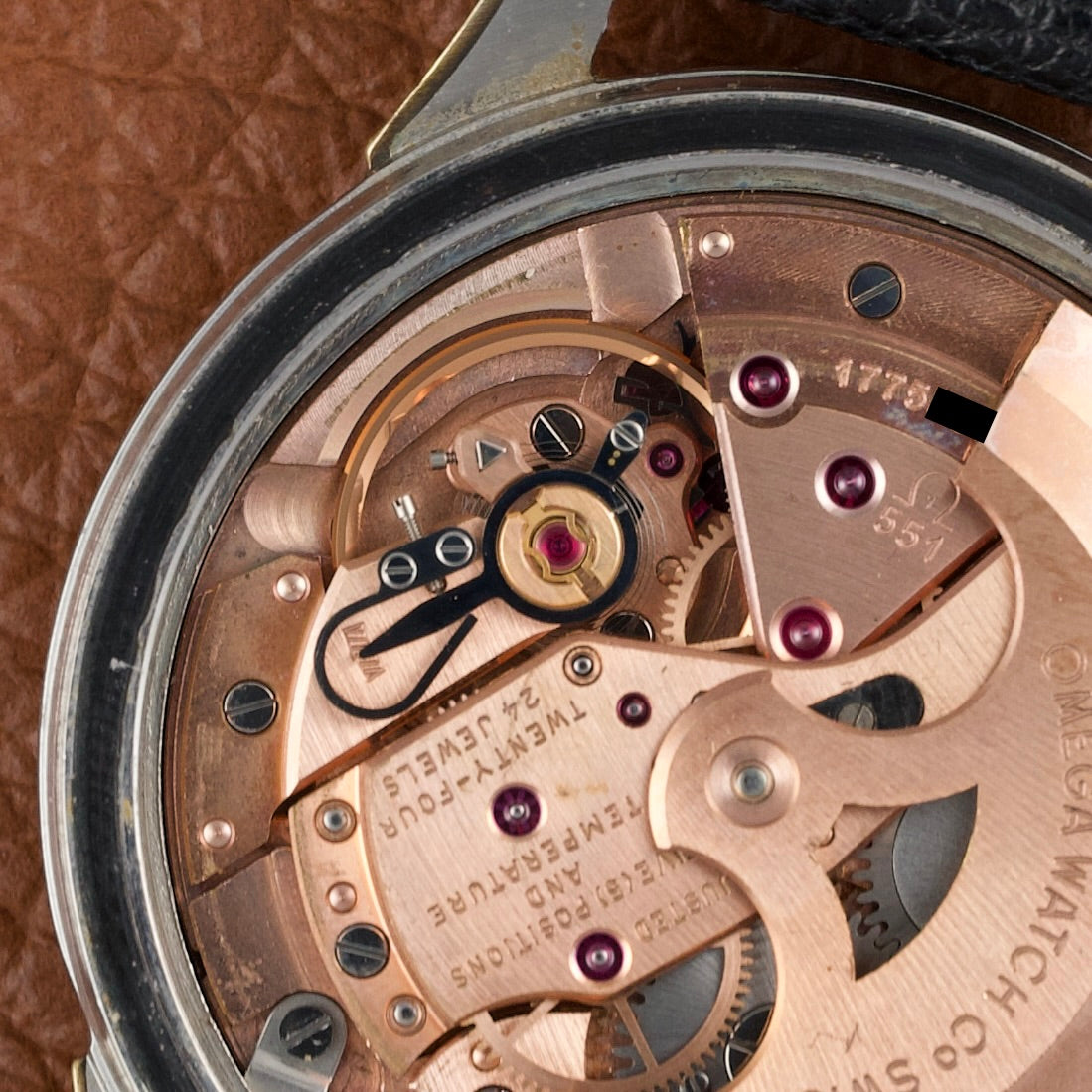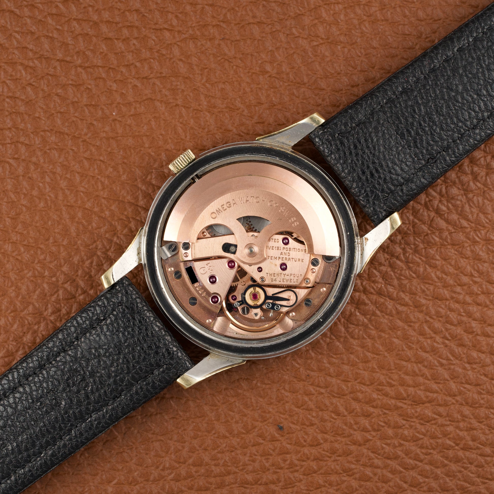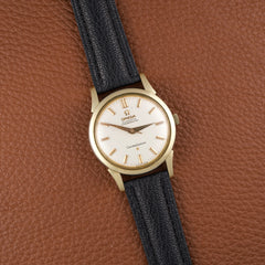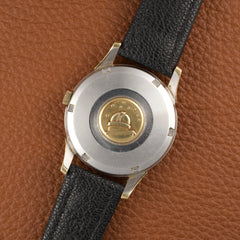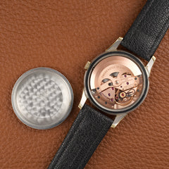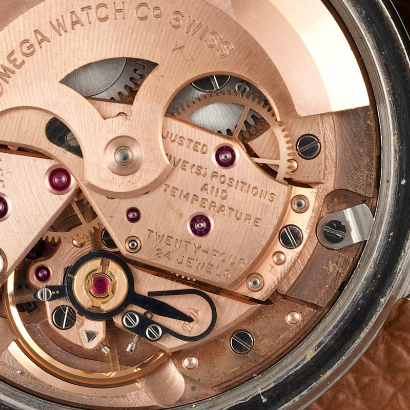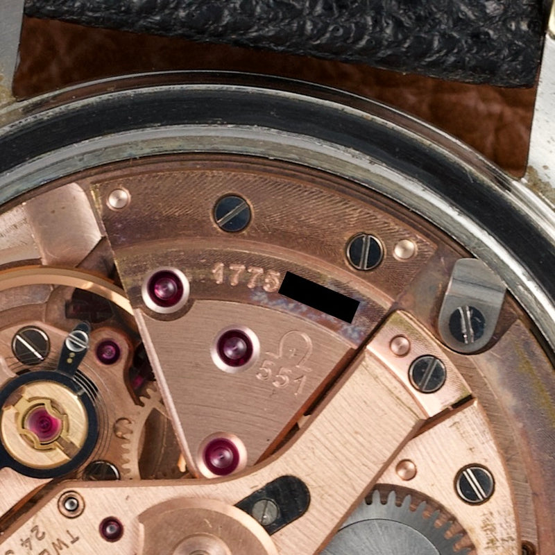 Elle offre un contraste subtil et élégant typique des productions américaines de l’époque. Ce modèle est animé par le calibre Omega 551, un mouvement automatique chronomètre réputé pour sa robustesse et sa précision.