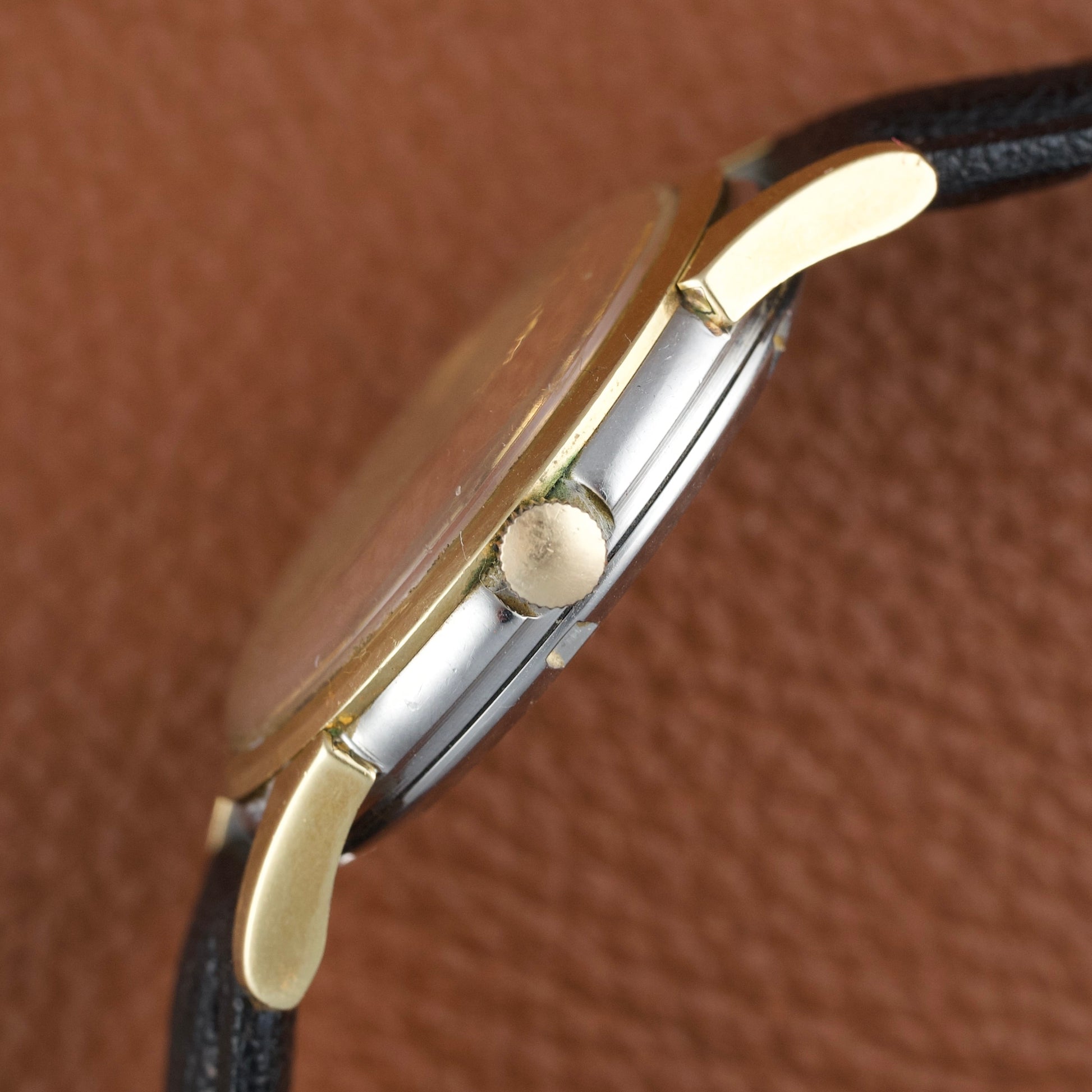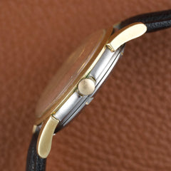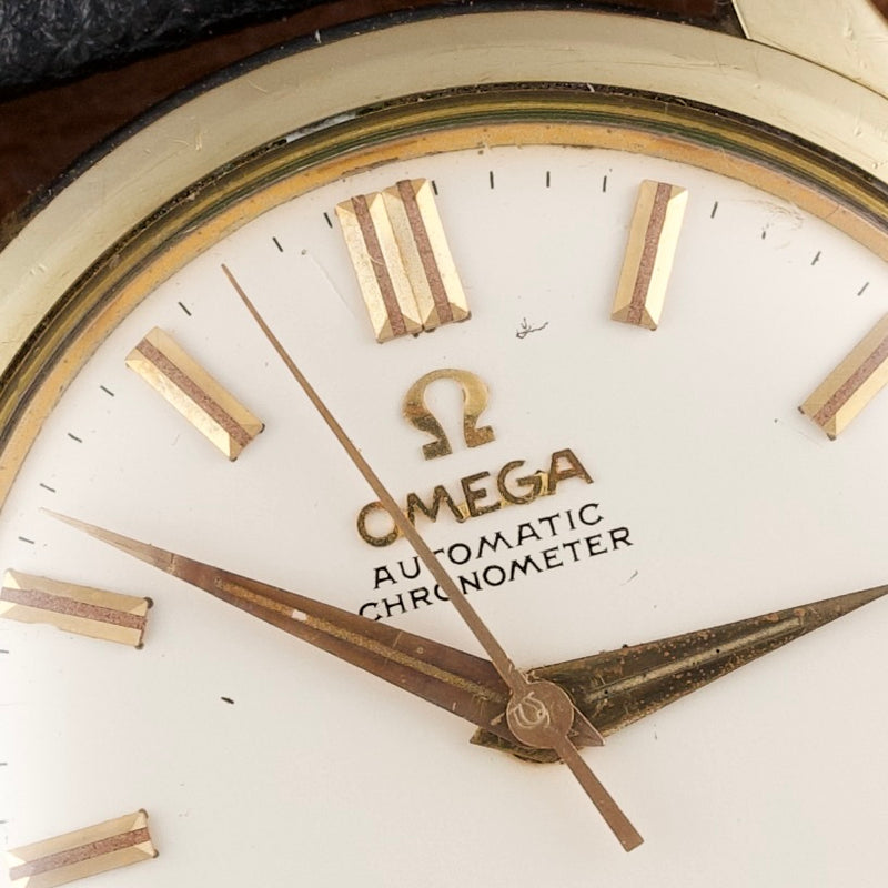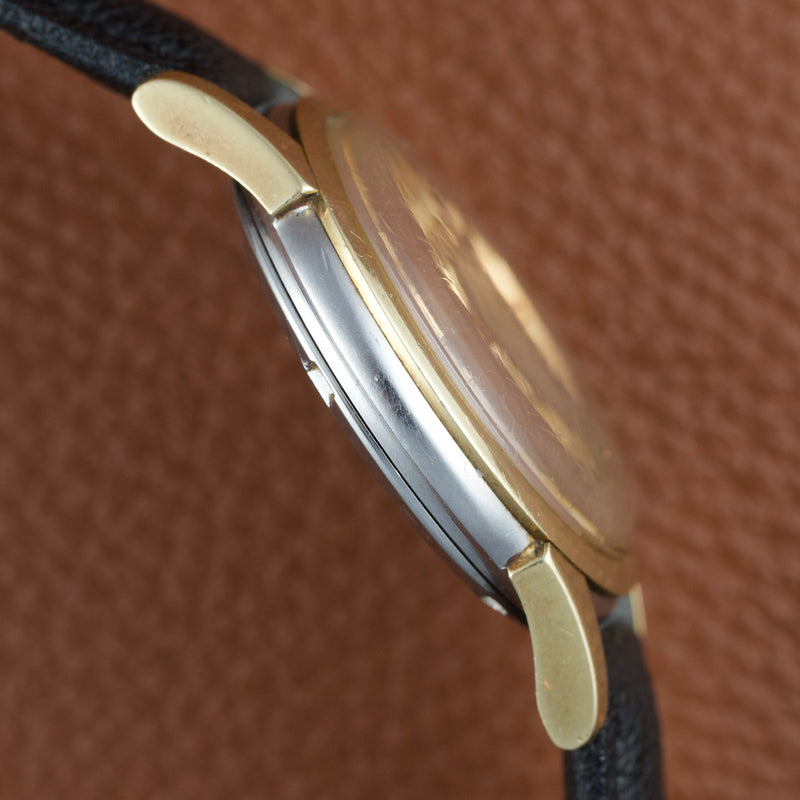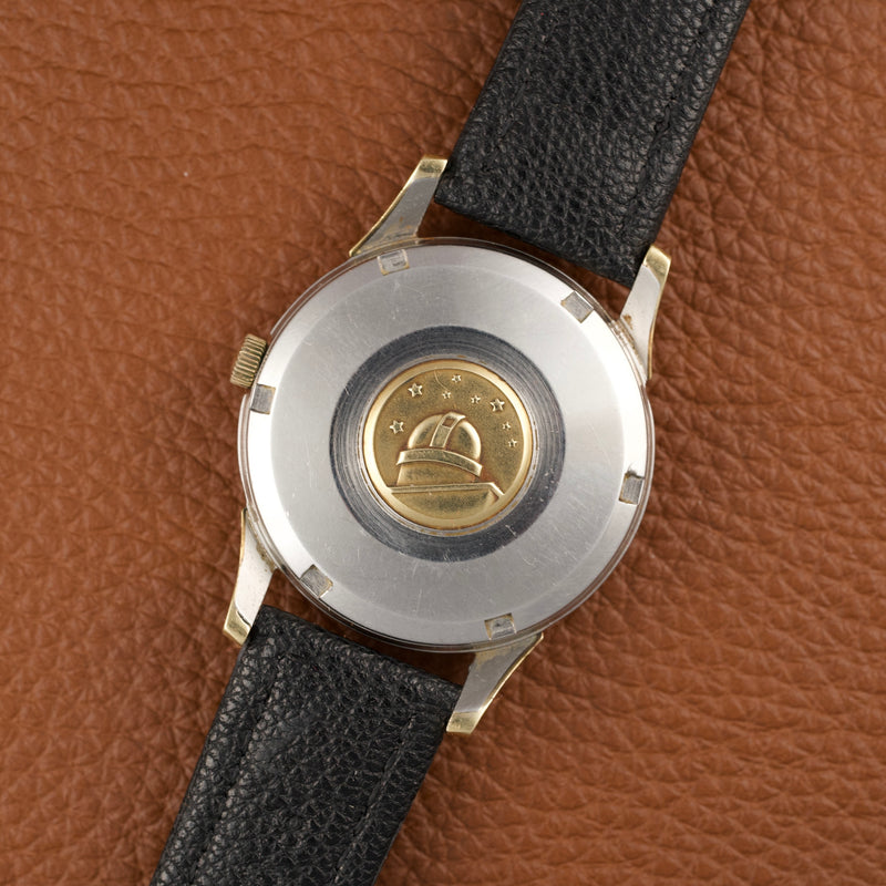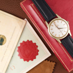 Elle est ici proposée dans une configuration particulièrement exceptionnelle avec son set complet. Produite en 1961, elle dispose d’un boîtier de 34 mm en acier inoxydable et des finitions en « 10K Gold Filled » sur les arêtes ainsi que la lunette. Elle dispose encore de son verre Omega d’origine avec la gravure du logo sur le verre.