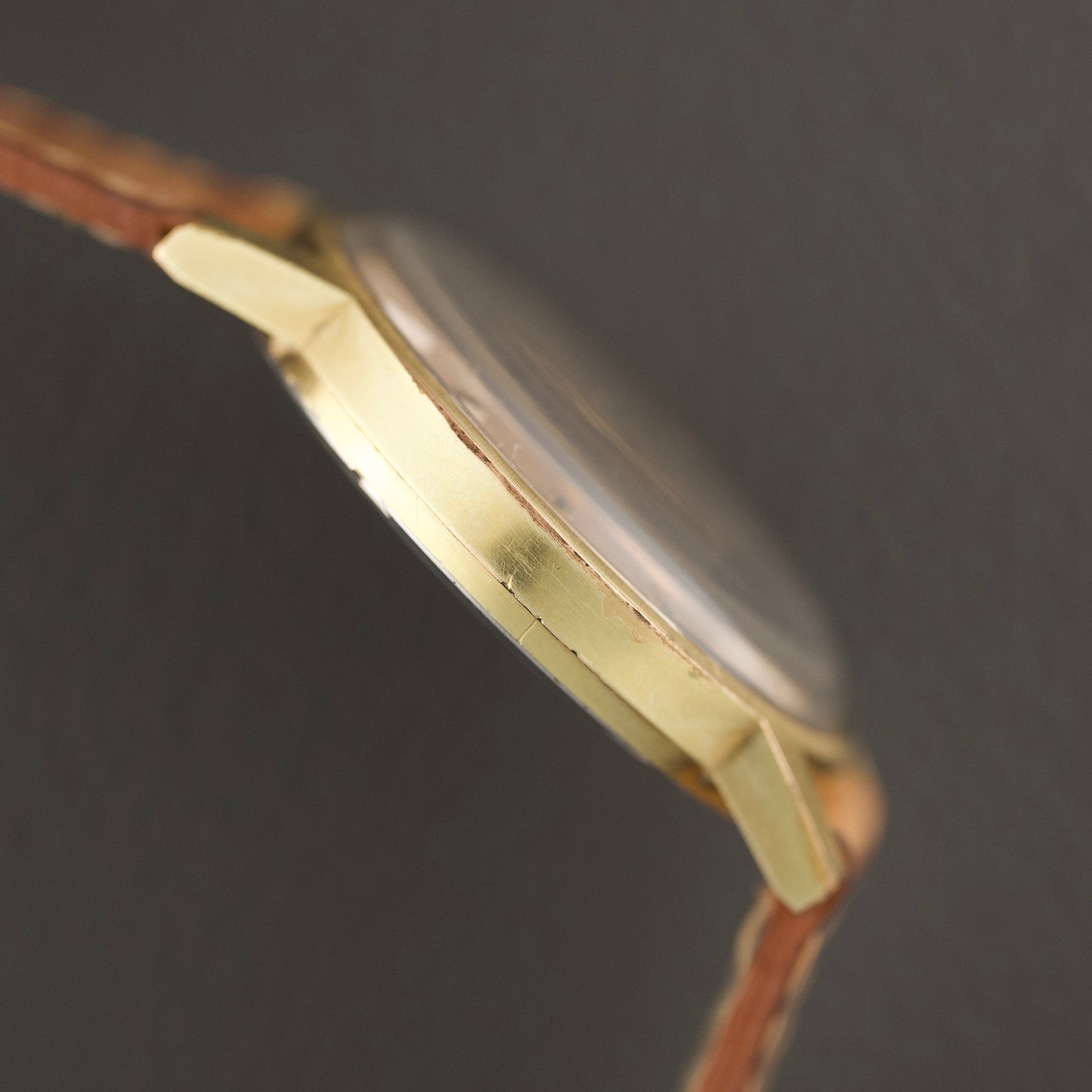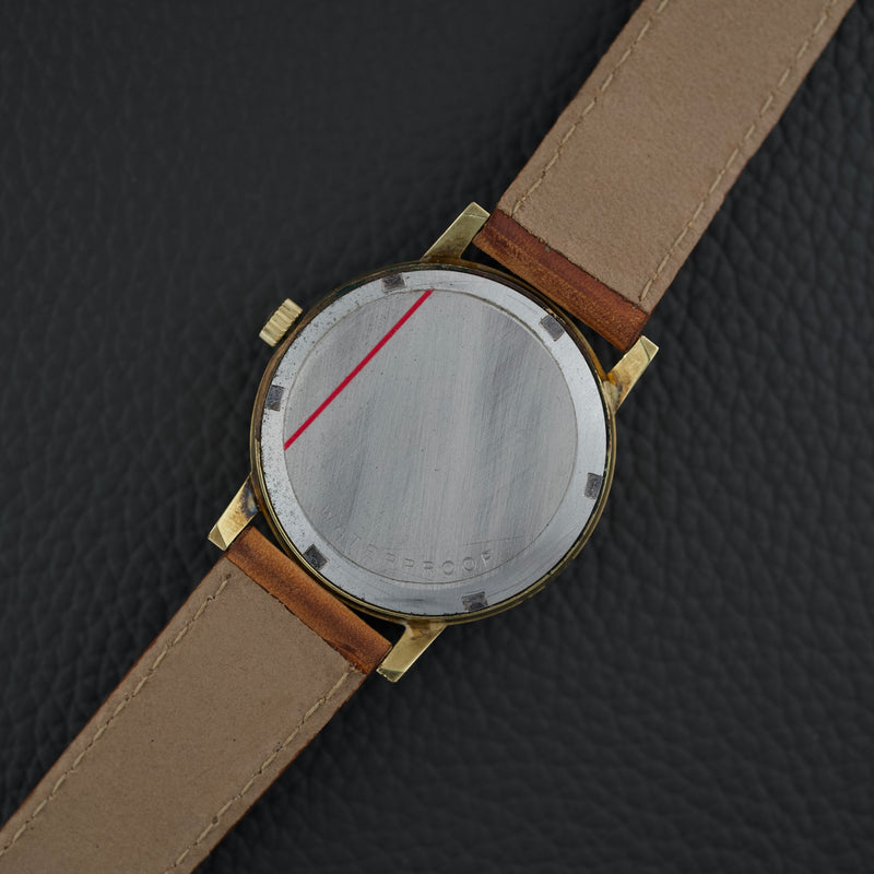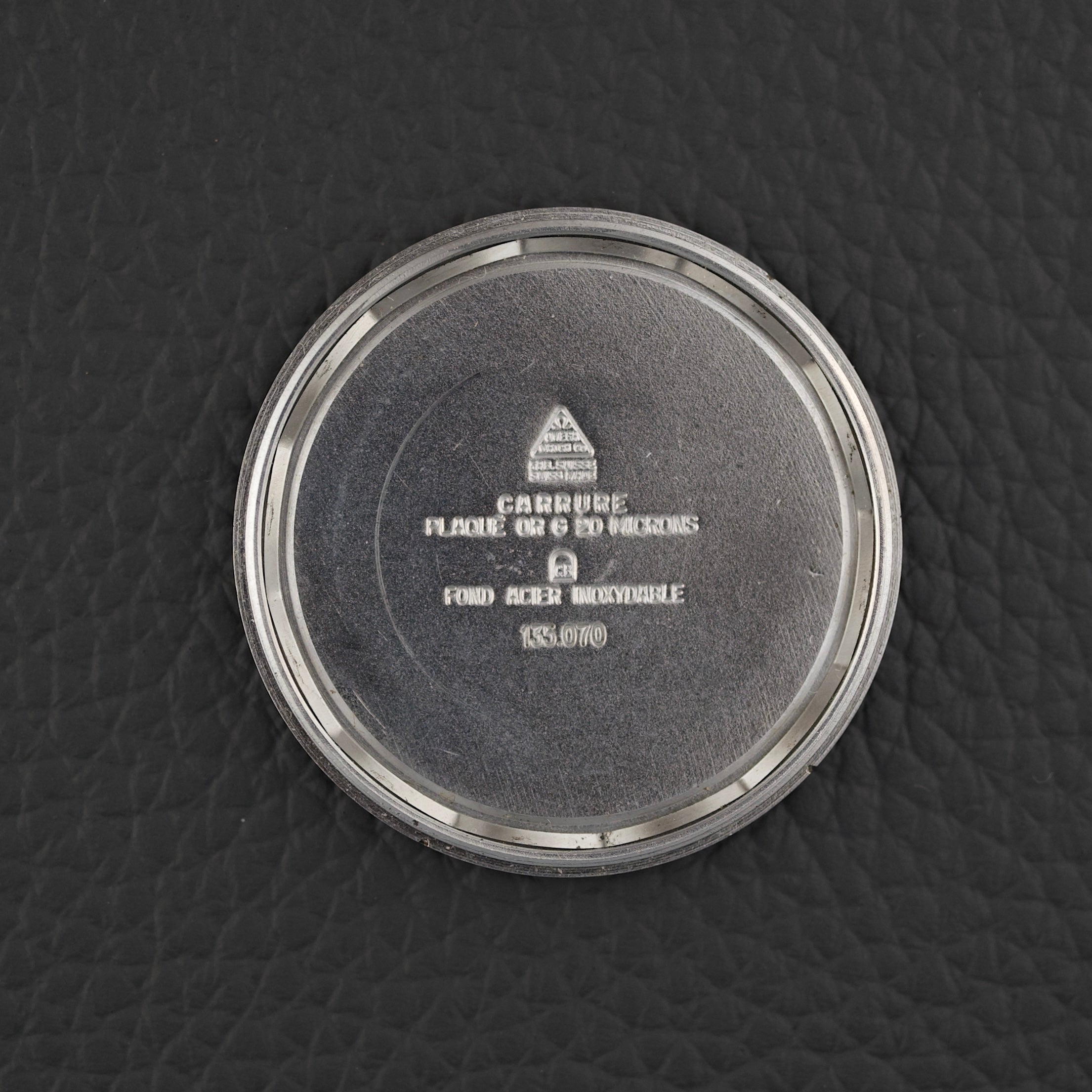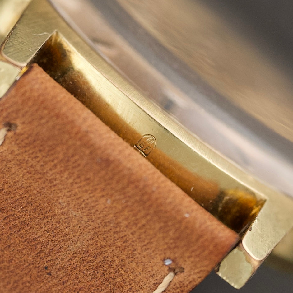 Cette référence 135.070 illustre cet équilibre entre simplicité et sophistication. Son boîtier plaqué en or jaune aux proportions harmonieuses encadre un cadran argenté d’une grande pureté, subtilement patiné par le temps. Les index dorés appliqués et les aiguilles bâtons confèrent à cette montre une allure intemporelle, parfaitement représentative de l’élégance des années 60.