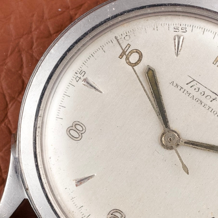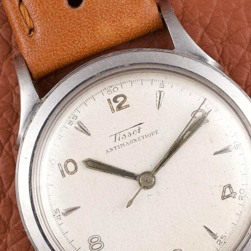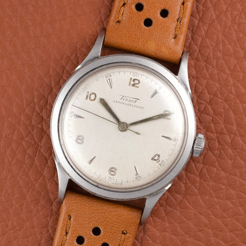 Ce modèle incarne parfaitement l’esprit toolwatch élégante de l’époque, avec un cadran sobre et parfaitement lisible. Les chiffres arabes appliqués alternant avec des index facettés apportent du relief tout en conservant une grande harmonie visuelle. La mention “Antimagnétique” souligne l’orientation technique de la montre, conçue pour mieux résister aux perturbations magnétiques du quotidien.