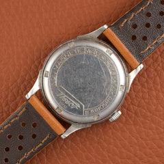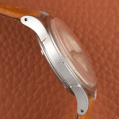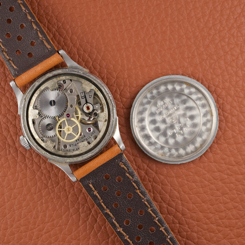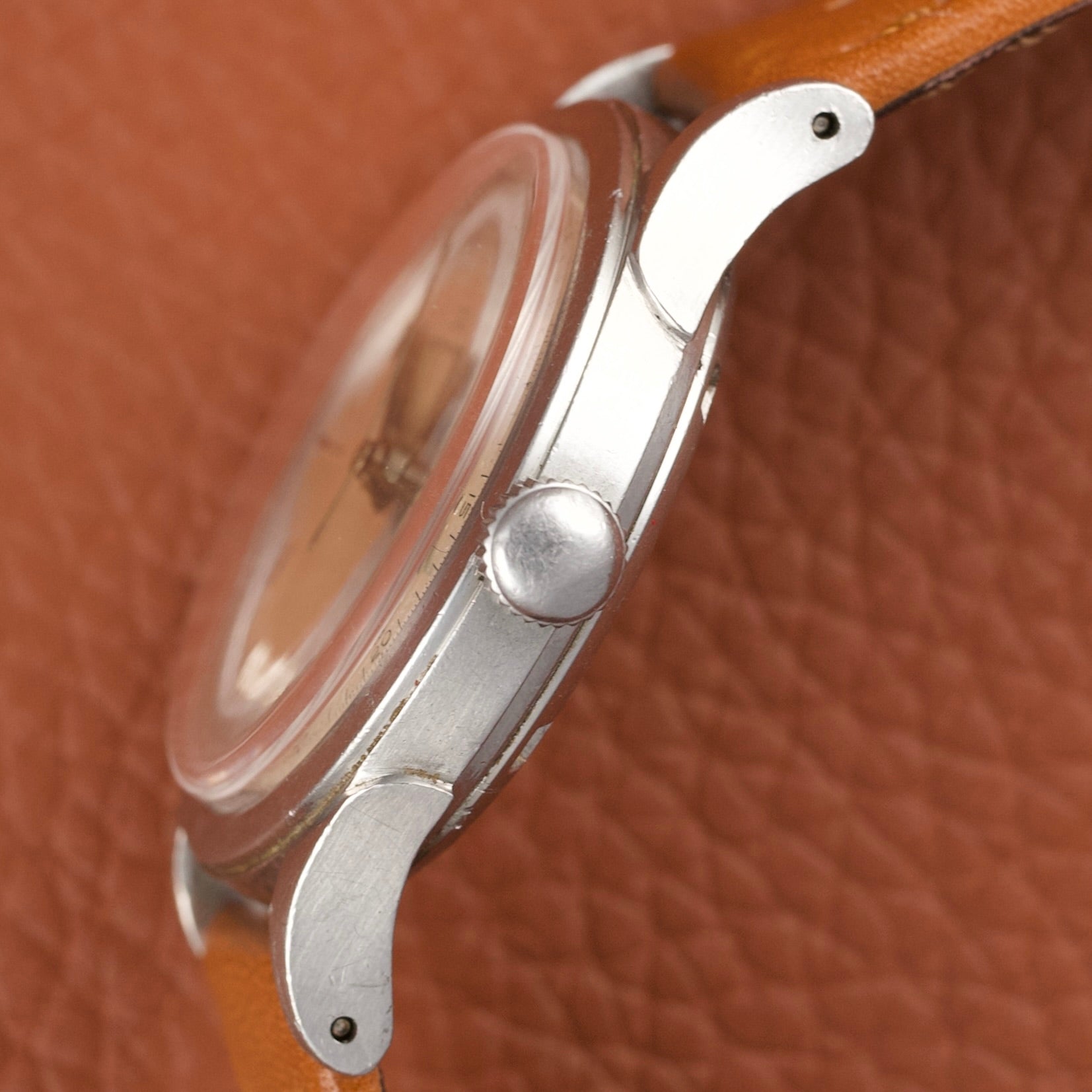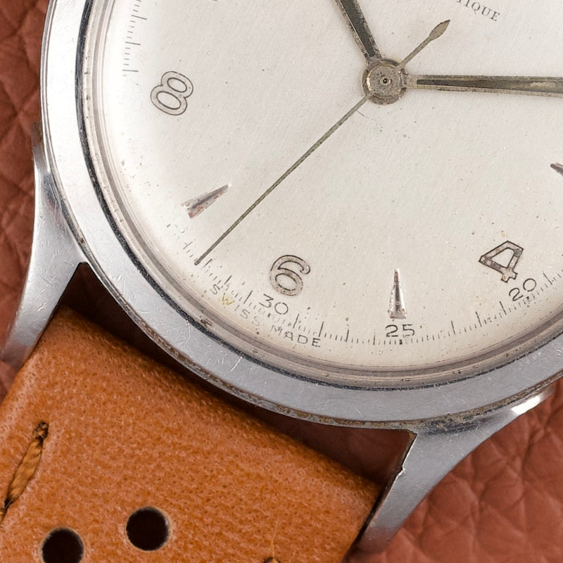 Le cadran présente aujourd’hui une légère patine homogène, lui conférant un charme vintage authentique. Les aiguilles dauphine ainsi que la trotteuse fine participent à l’équilibre général du design, typique des montres habillées sportives des années 50.