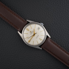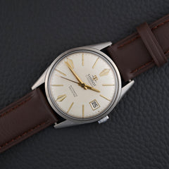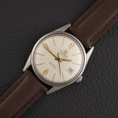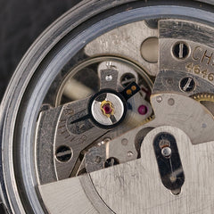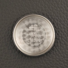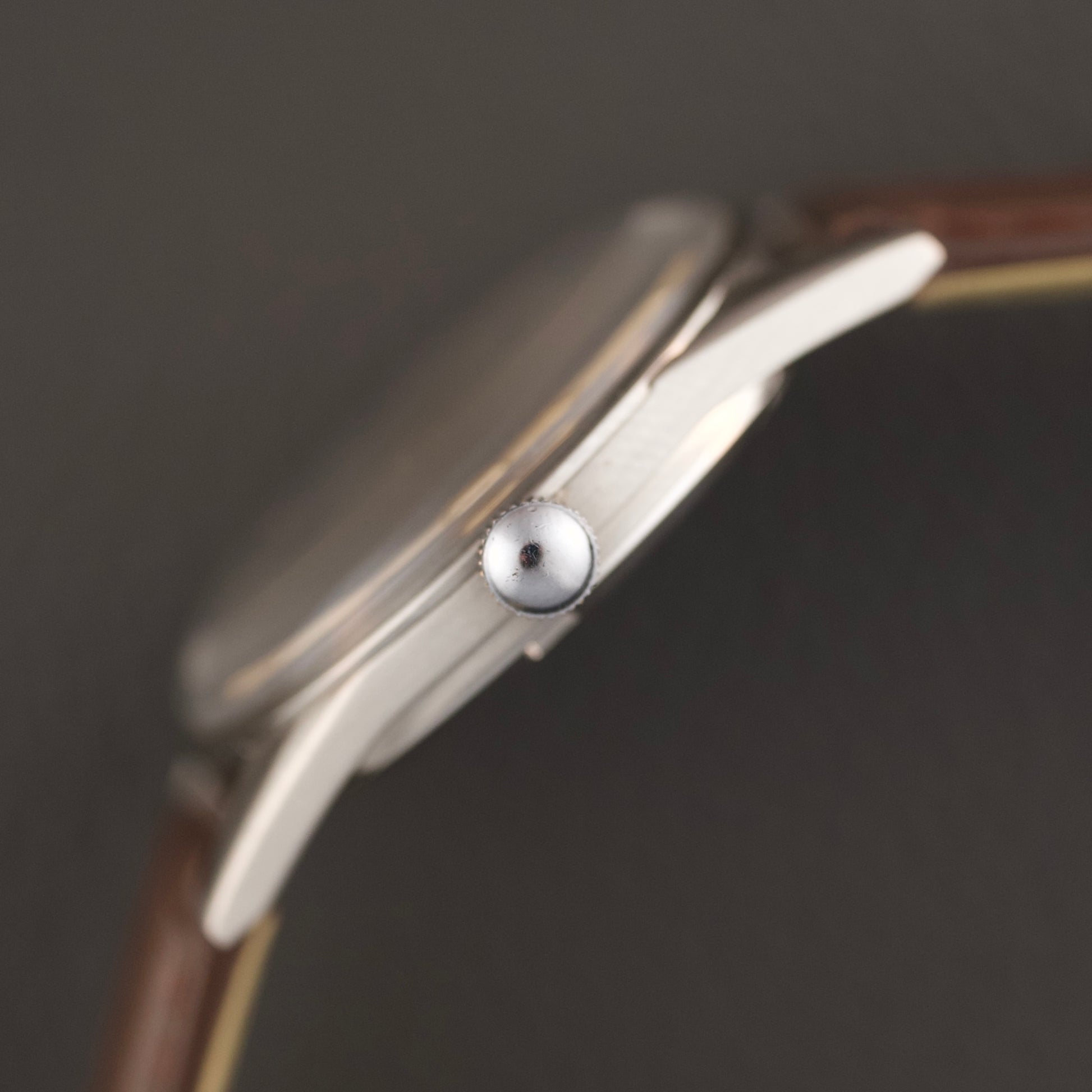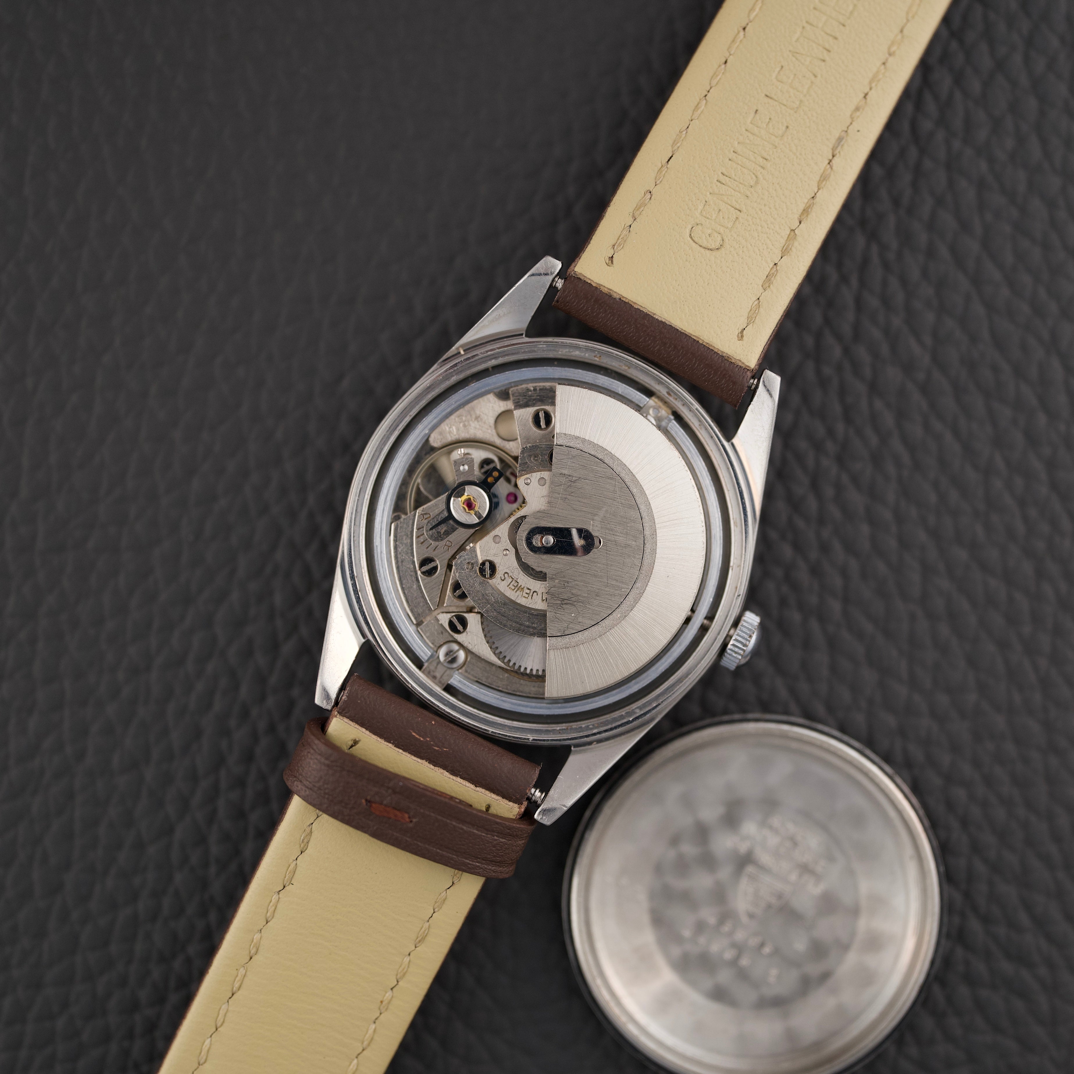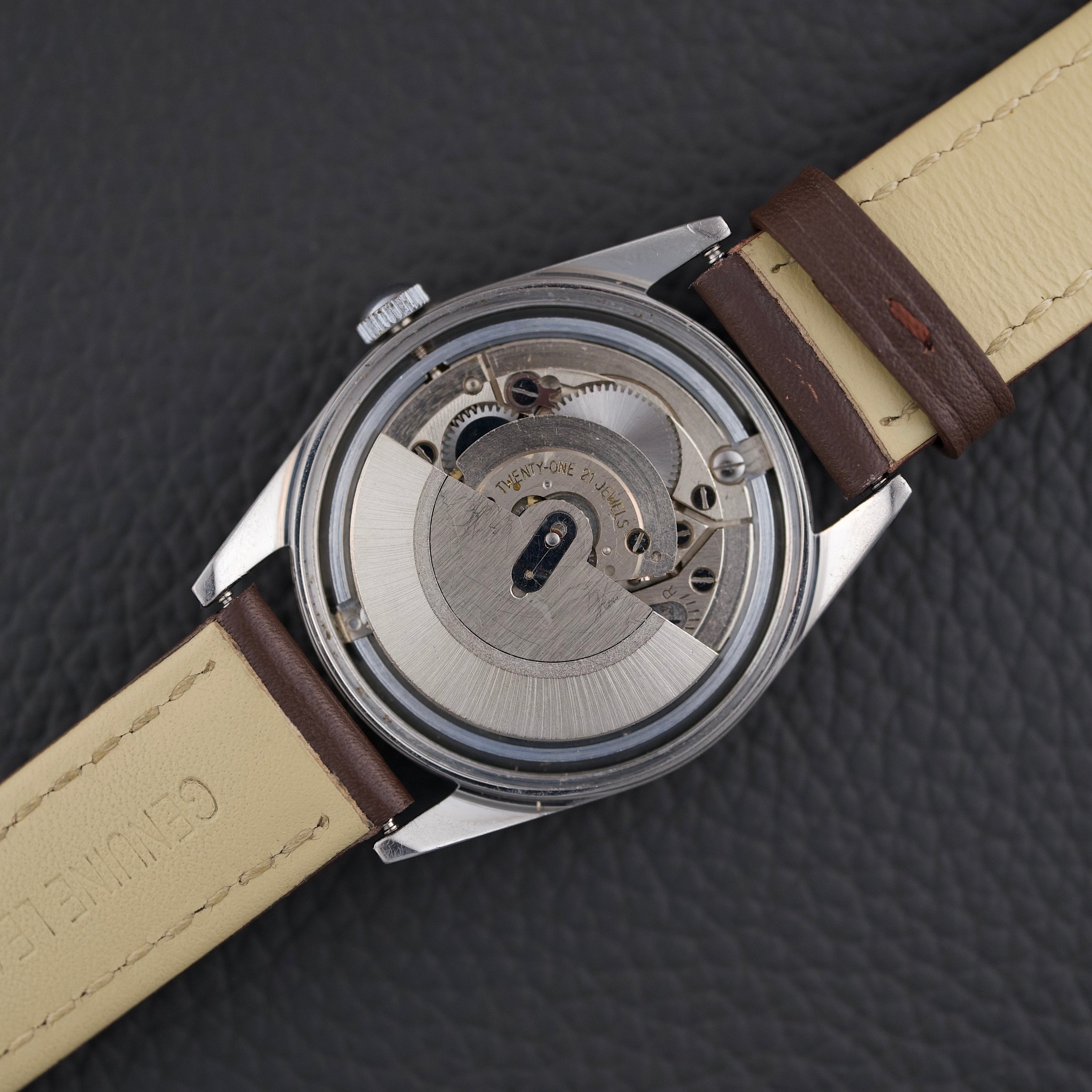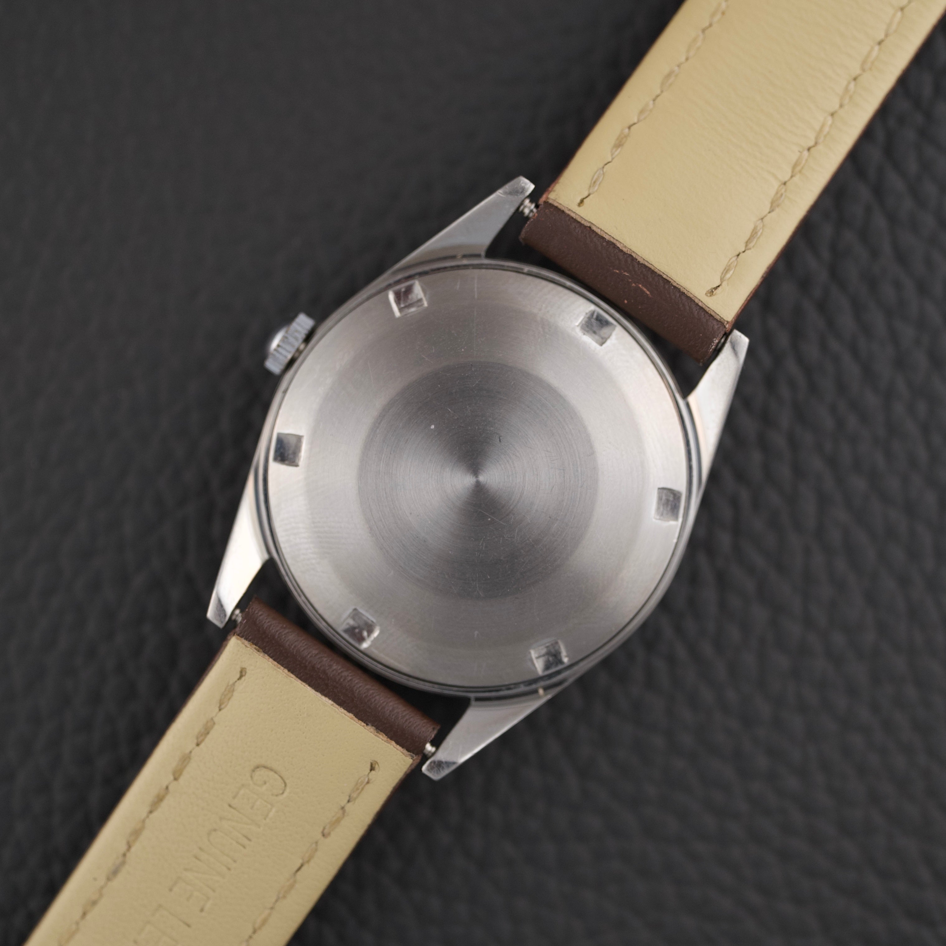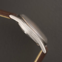 Cette référence 43505 illustre le goût de l’époque pour les montres polyvalentes, élégantes sans ostentation. Son boîtier en acier inoxydable de 34 mm, aux proportions équilibrées, s’accorde aussi bien à un poignet masculin qu’à un poignet féminin. Son cadran argenté d’origine, ponctué d’index appliqués, conserve toute sa fraîcheur d’époque, avec une patine légère et homogène qui lui confère un charme intemporel.