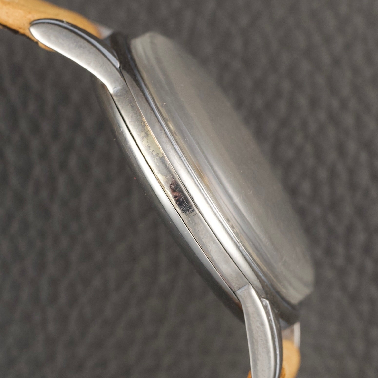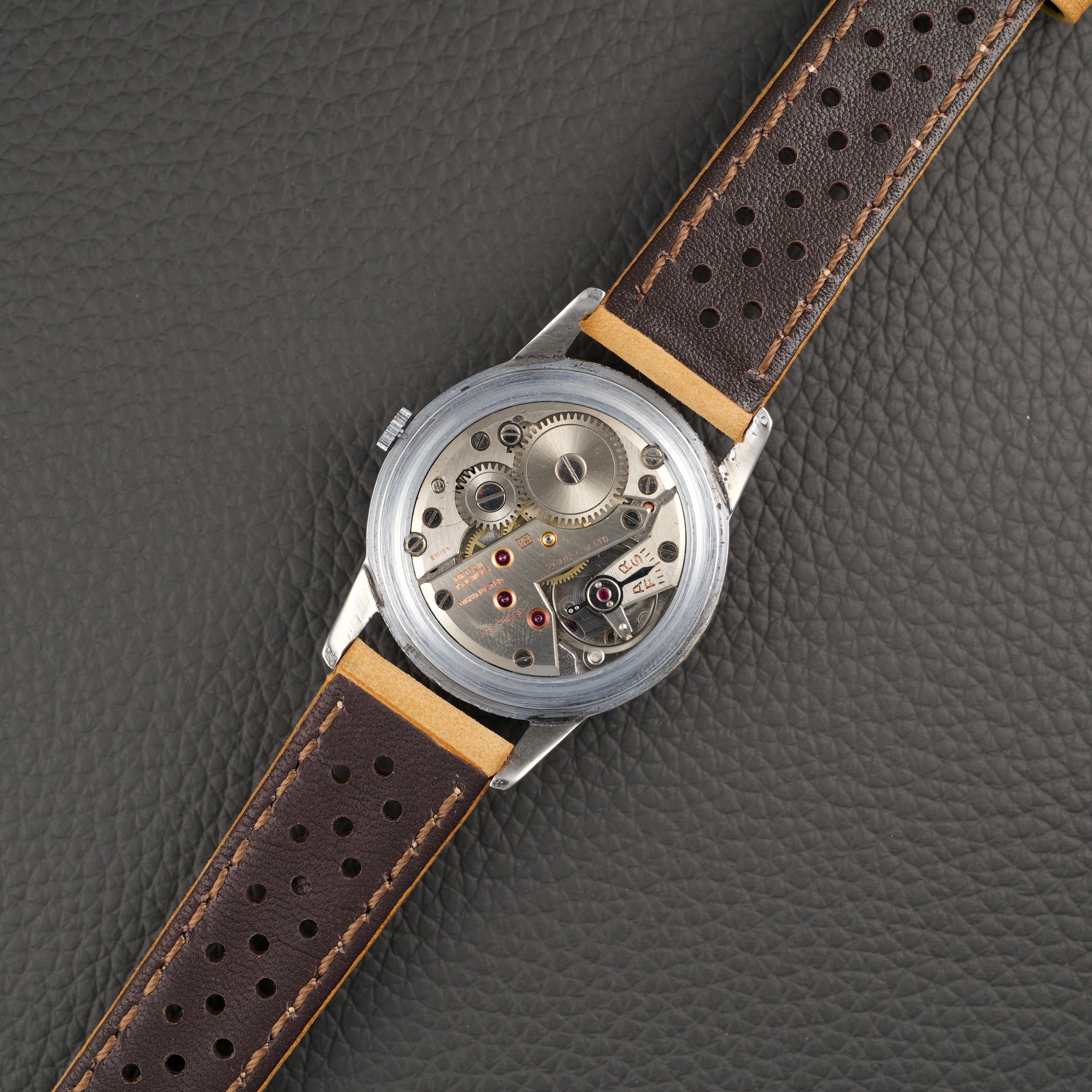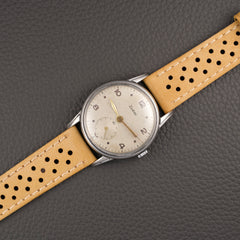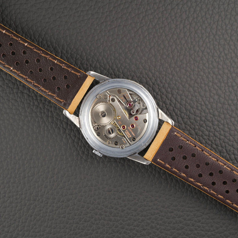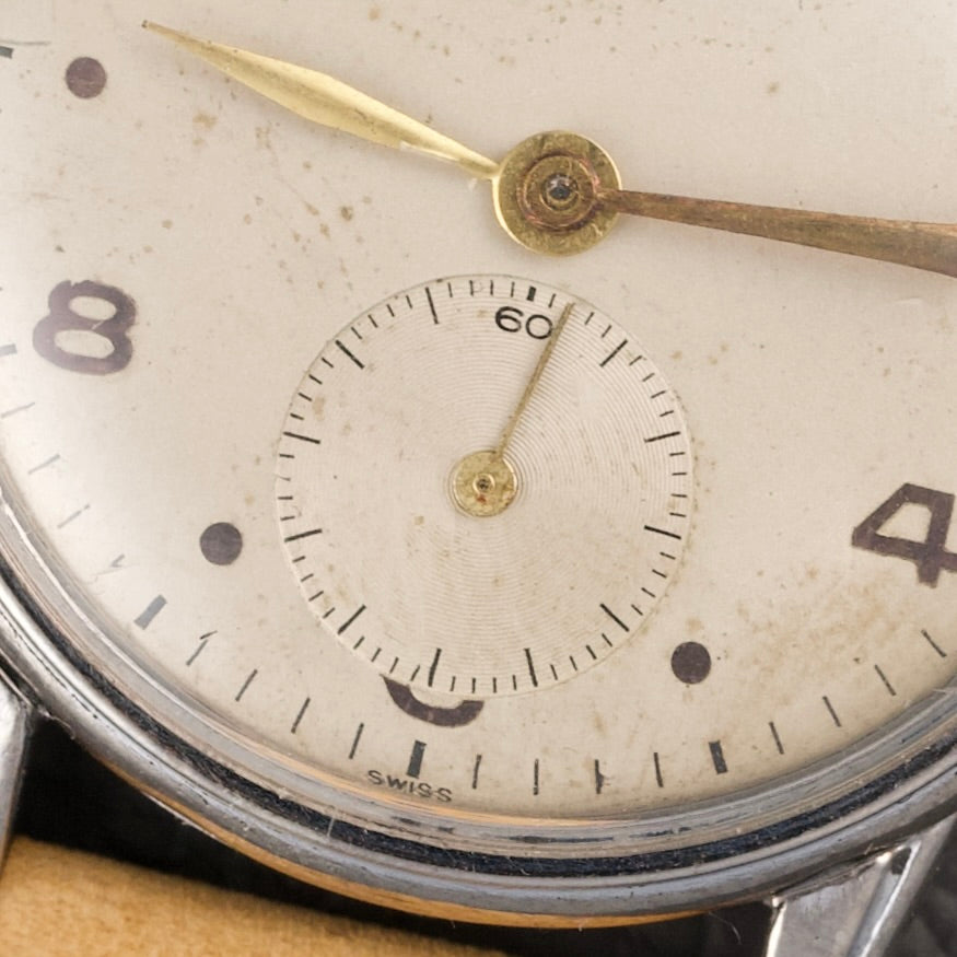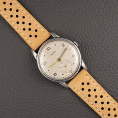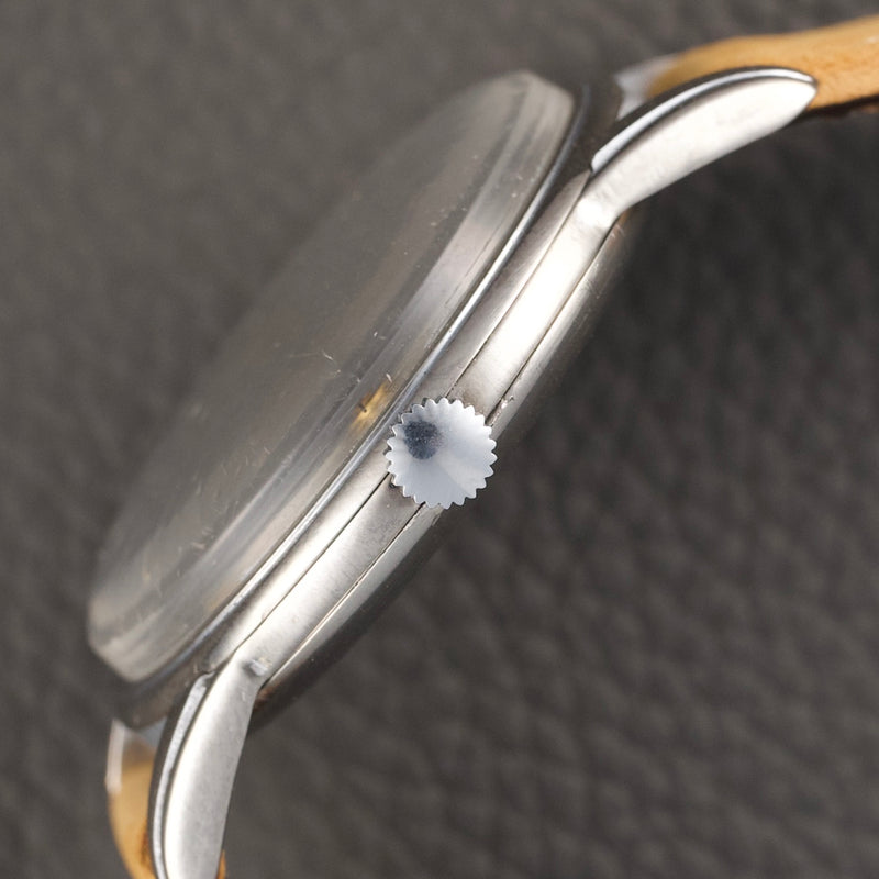 Ce modèle se distingue par son cadran épuré et parfaitement équilibré. Les chiffres arabes appliqués alternent avec des index ponctuels, offrant une lecture claire et chaleureuse. La petite seconde à 6h apporte une touche classique et traditionnelle, emblématique des montres mécaniques de cette époque. Le cadran d’origine présente une légère patine homogène.