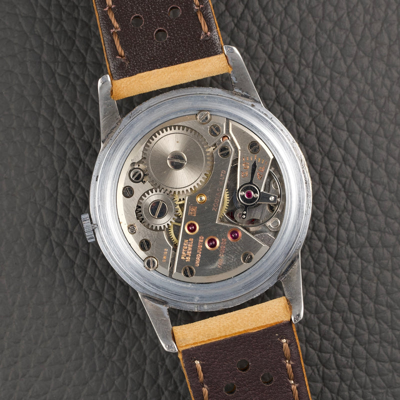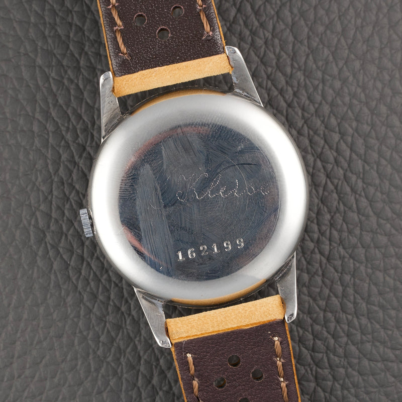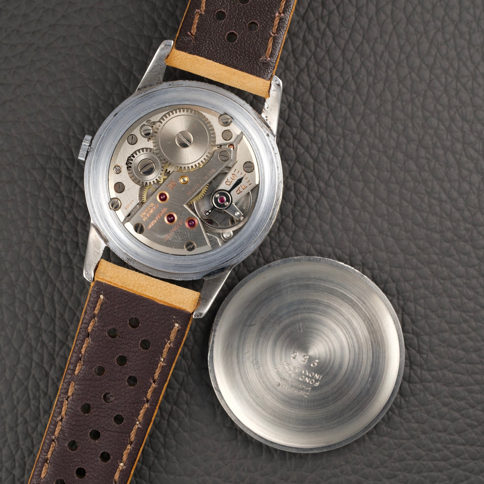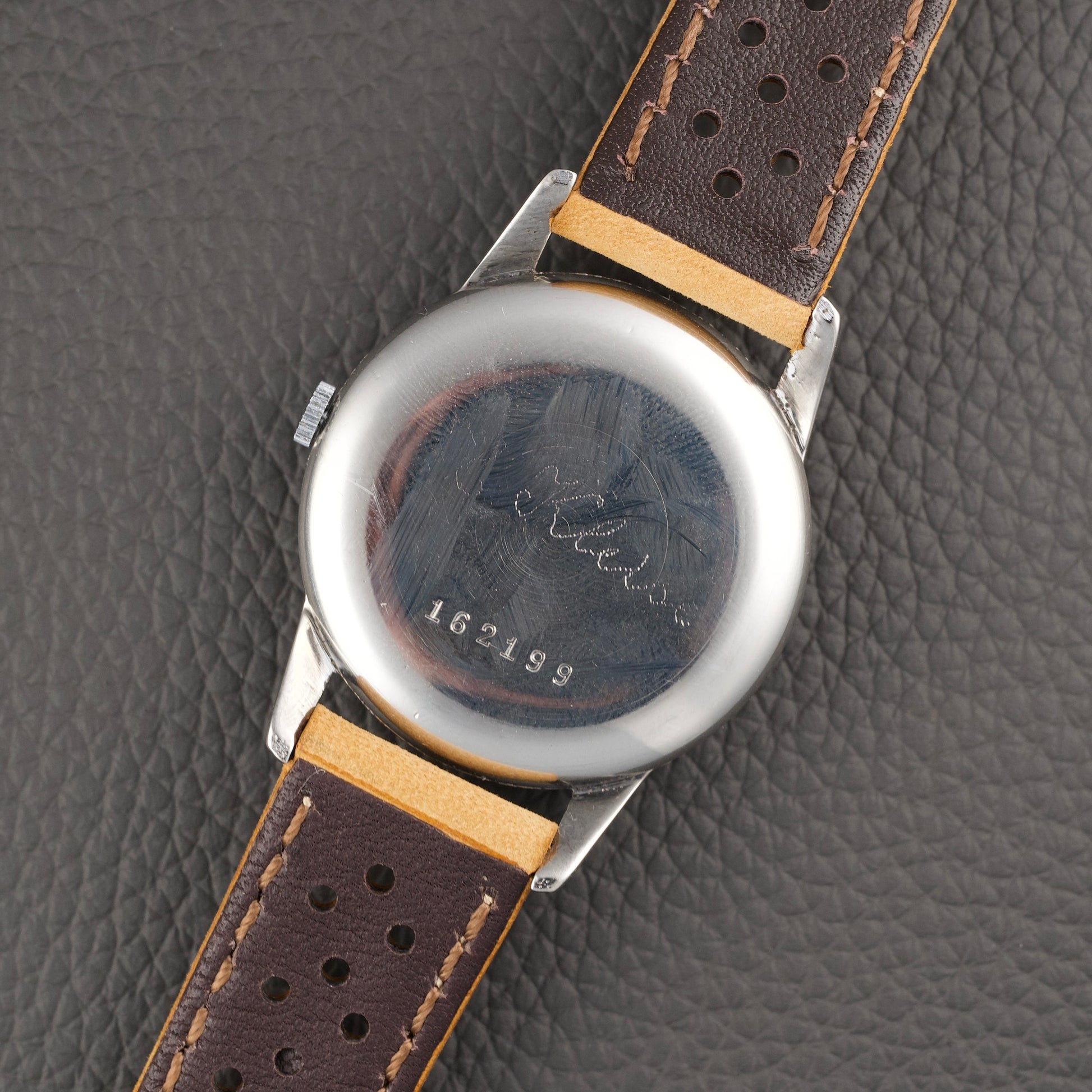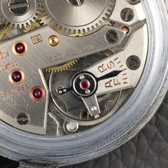 Ce modèle se distingue par son cadran épuré et parfaitement équilibré. Les chiffres arabes appliqués alternent avec des index ponctuels, offrant une lecture claire et chaleureuse. La petite seconde à 6h apporte une touche classique et traditionnelle, emblématique des montres mécaniques de cette époque. Le cadran d’origine présente une légère patine homogène.