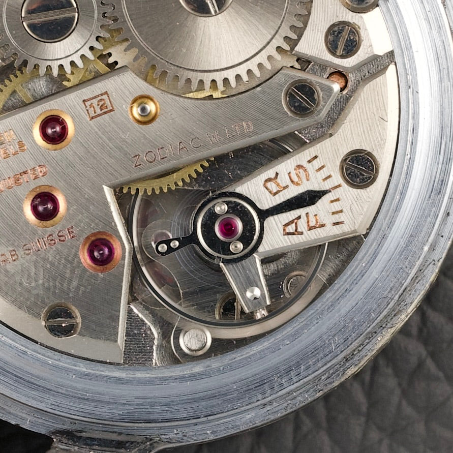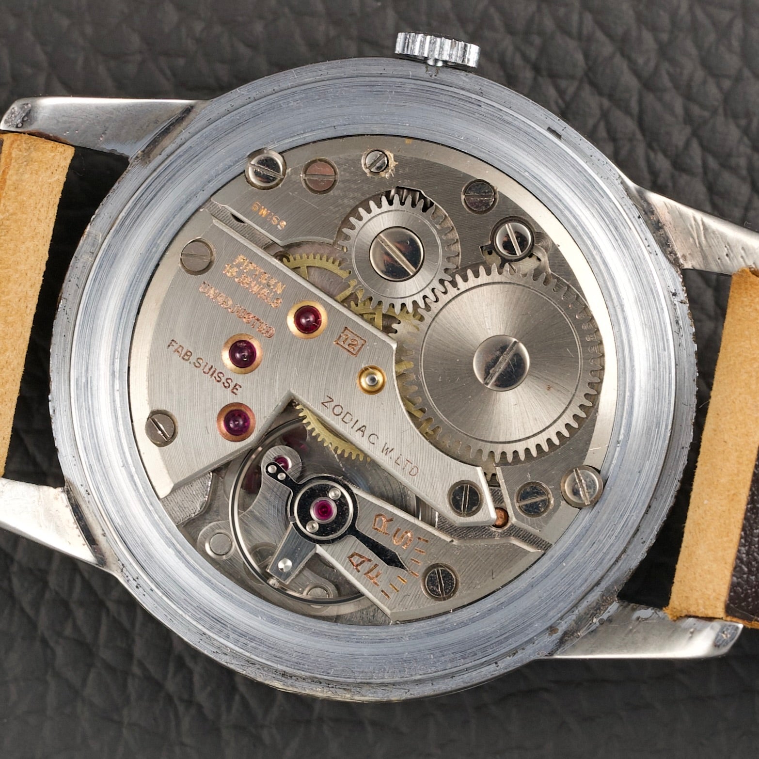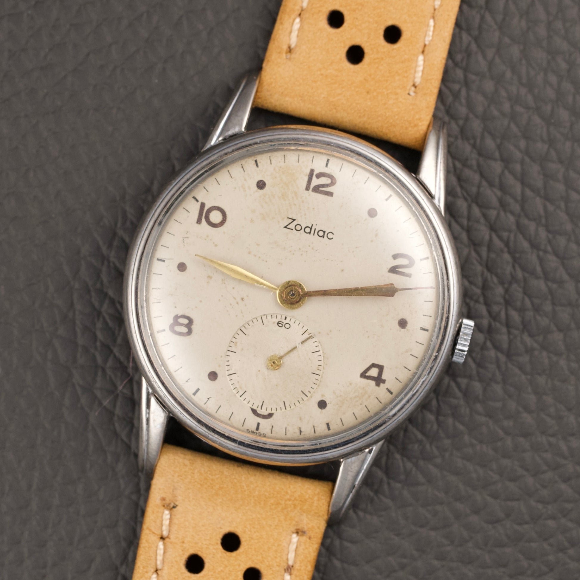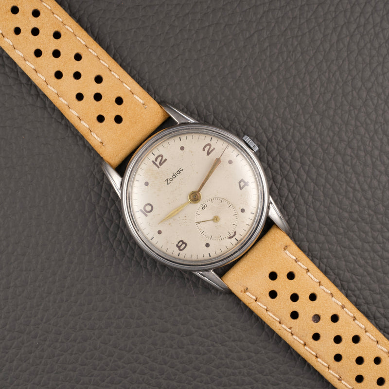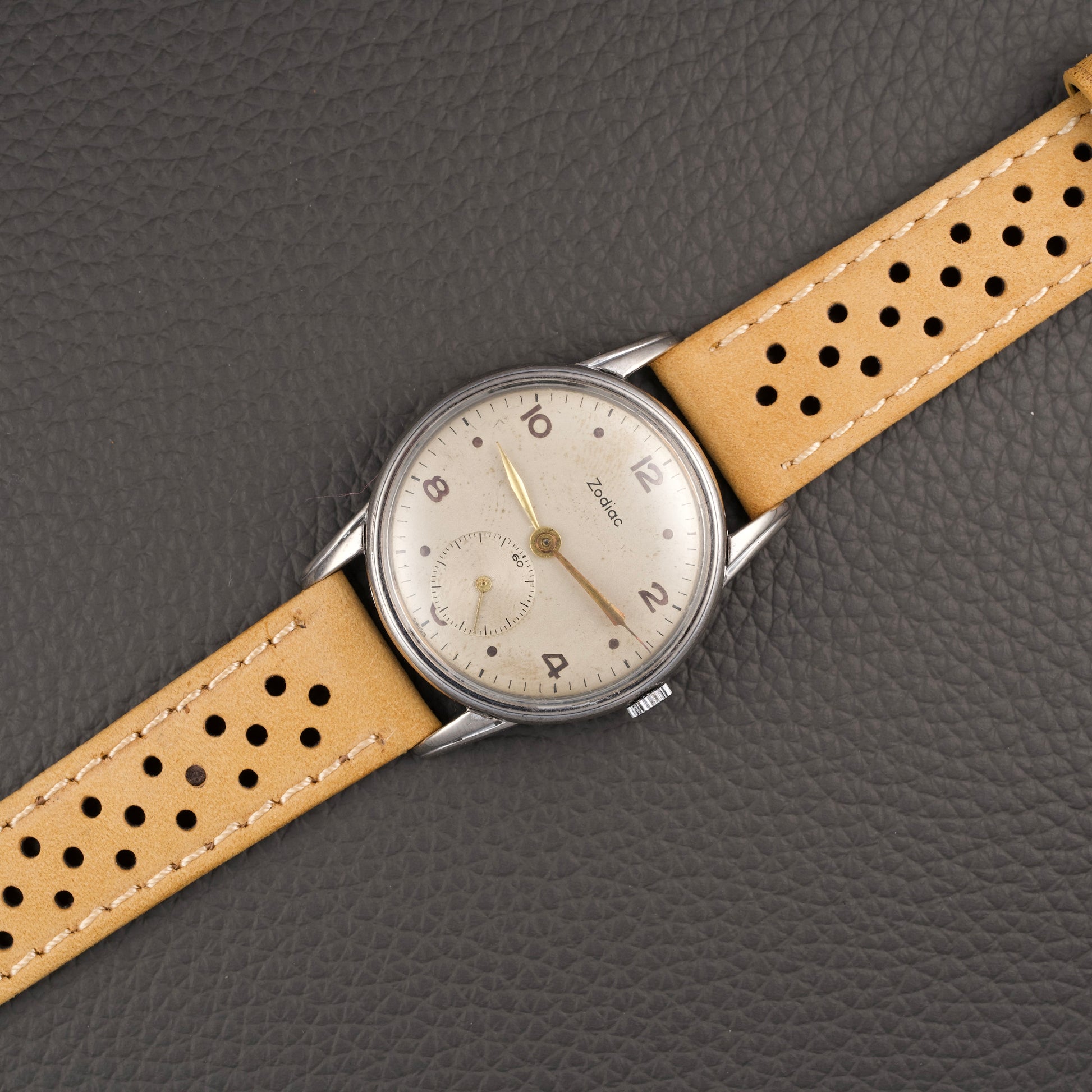 Son boîtier en acier inoxydable de 35 mm affiche des proportions idéales pour une montre habillée vintage, avec des cornes fines et élégantes qui épousent parfaitement le poignet. L’ensemble conserve une belle cohérence esthétique Elle est animée par le calibre Zodiac 12 à remontage manuel. Une mécanique simple et efficace, représentative du savoir-faire suisse de l’époque. Une pièce attachante, au charme vintage affirmé, idéale pour les amateurs de montres mécaniques classiques.