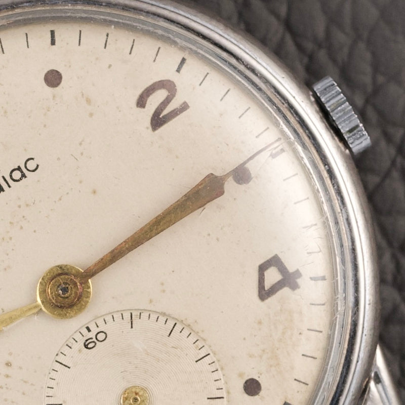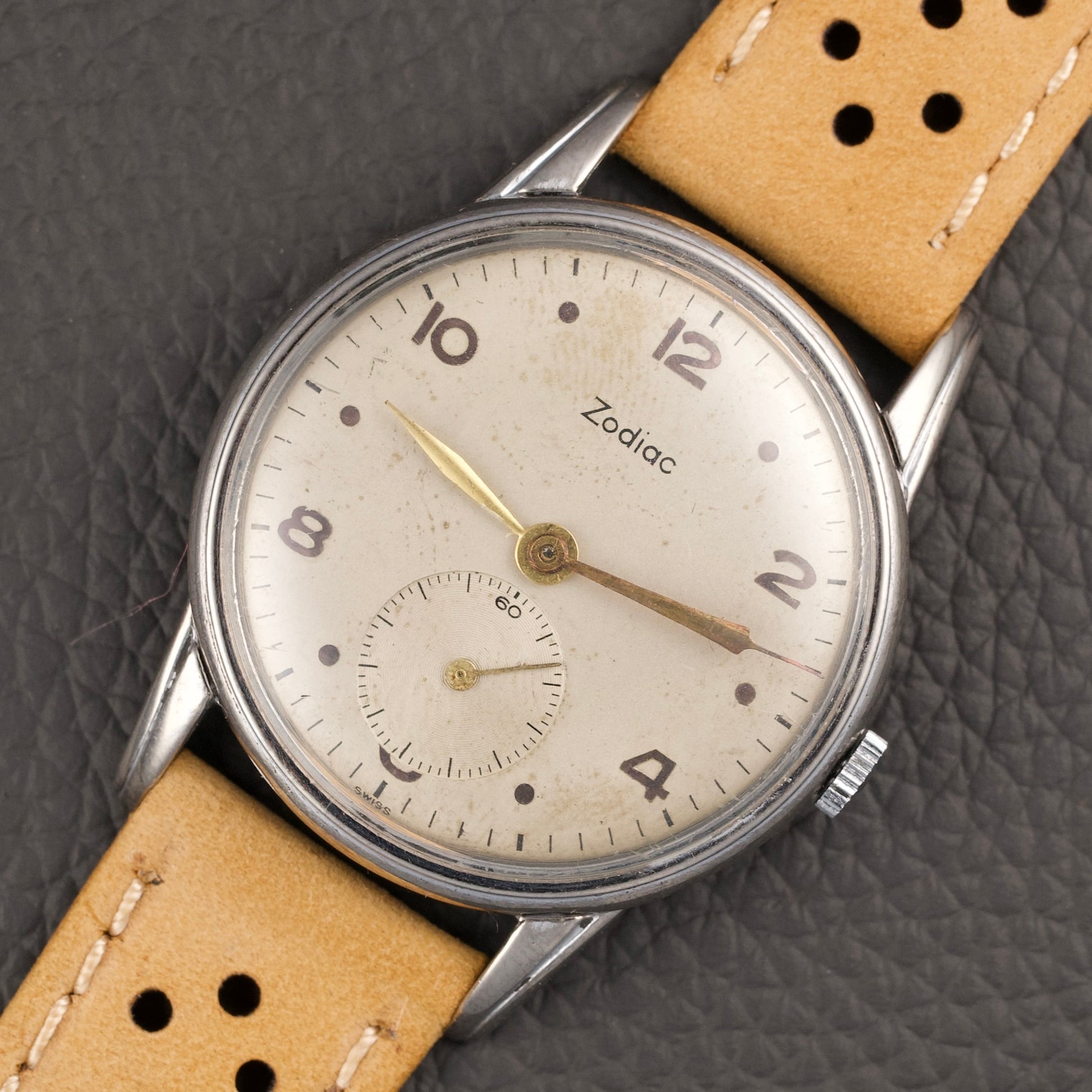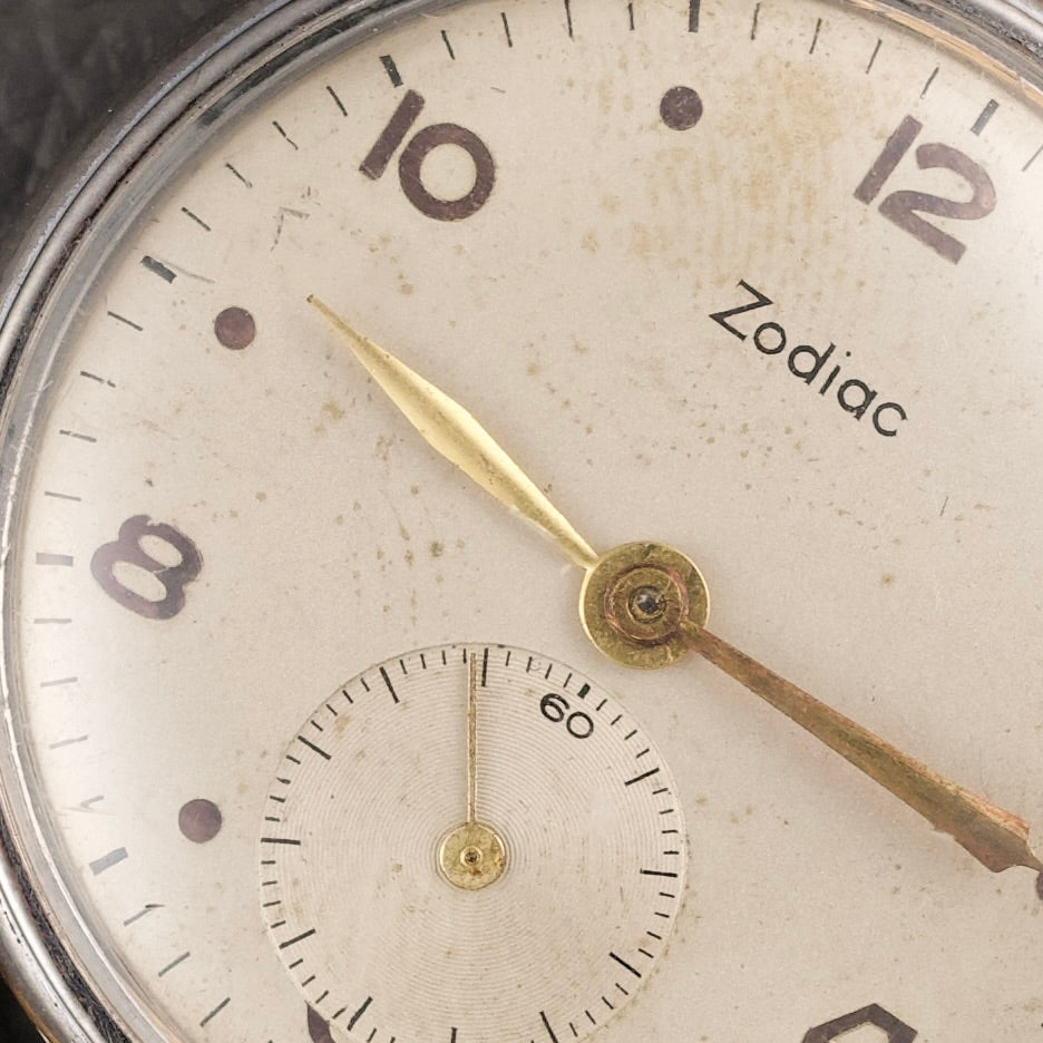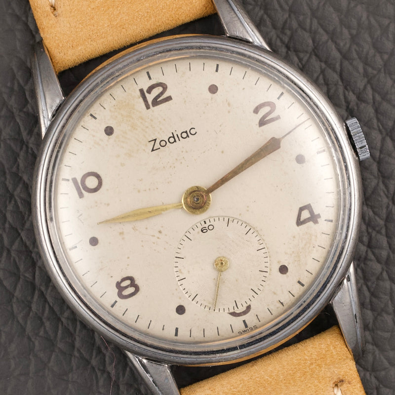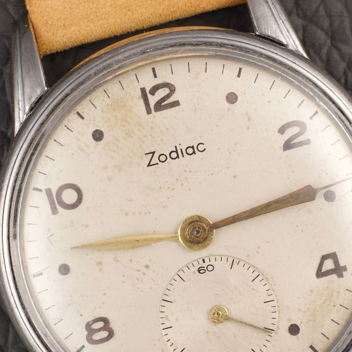 Son boîtier en acier inoxydable de 35 mm affiche des proportions idéales pour une montre habillée vintage, avec des cornes fines et élégantes qui épousent parfaitement le poignet. L’ensemble conserve une belle cohérence esthétique Elle est animée par le calibre Zodiac 12 à remontage manuel. Une mécanique simple et efficace, représentative du savoir-faire suisse de l’époque. Une pièce attachante, au charme vintage affirmé, idéale pour les amateurs de montres mécaniques classiques.